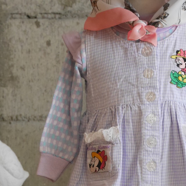 パステルラベンダーなギンガムチェックが甘すぎない清楚感があって可愛いワンピース。 ベビーミニーちゃんの刺繍やワッペンはよく見かけますが、シリコン素材のパッチまで付いているのはあまりないですね。もしかしたら後からつけられた可能性もあると思います。おかげでどこ見てもミニーちゃんがいる仕様に。 身幅がゆったりめなのでムチムチベビーでも安心。2歳前後ではチュニック丈として着れますし、 フロントボタンはフェイクではないので、写真のようにボタンを開けて羽織りのようにもお楽しみいただけます。 ノースリーブは一枚でサラッと着れるのはもちろん、中に長袖などインナーを重ねれば秋冬も着られるのでオールシーズン活躍します。すぐサイズアウトしてしまうベビーだからこそ、少しでも長くお楽しみいただけるのは親としてありがたい一枚ですよね。 100% cotton Made in China size:6-9M / 80cm相当 平置き実寸(cm) 着丈 34 肩幅 19 脇口 12 身幅 25.5 注1)こちらはUSED商品となります。 注2)掲載の商品はアメリカのサイズ表記の物が多い為、日本のサイズ感と異なる場合が御座いますので、必ず採寸表記をご確認下さい。 注3)写真では確認出来ないような古着特有のスレ・ダメージ・色褪せなどがある場合が御座います。 注4)1点物となる為、返品・交換が出来ませんのでご了承下さい。 商品についてもっと詳しい知りたい方はお気軽にお問い合わせ下さい。 できる限り対応させて頂きます。 CLEAM instagram⇨https://www.instagram.com/cleam_kidsvintage