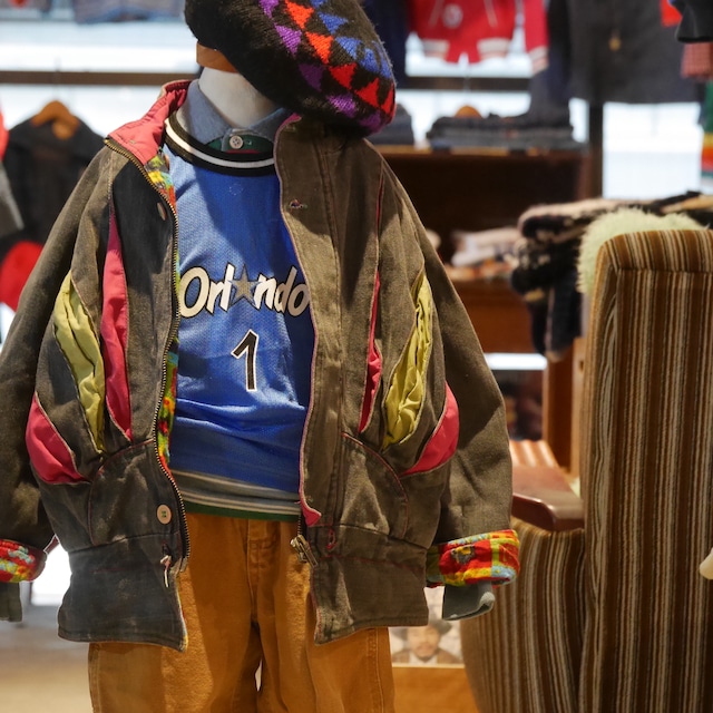 1990年代頃のデニムアウター。 大きな特徴はやはりフロントの切り込みのようなデザイン。ブラックデニムにピンクとグリーンのアクセントを使うカラーリングセンスが非常にお洒落。しかも面白いのがグリーンのところがポケットのようになっており、少し向きが変わってますが小物を入れるくらいなら十分なポケットです。 ラグランスリーブで肩落ちするシルエットやウエスト部分でキュッと締まるシルエットなどまさに90sの特徴がつまったディテール。 裏地には総柄のブランケットがついており、表地とは真逆のポップさがチラッと見えてもアクセントとなって良き。 ステッチが赤と緑など細かいところまで抜かりありません。細部までじっくり見ても飽きの来ない面白さが詰まった一枚です。 SHELL:100% Pure Cotton LINING:100% Pure Cotton FILLING:100% Polyester size:4T / 100-110cm相当 平置き実寸(cm) 着丈 46 肩〜袖丈 44.5 身幅 42 注1)こちらはUSED商品となります。 注2)掲載の商品はアメリカのサイズ表記の物が多い為、日本のサイズ感と異なる場合が御座いますので、必ず採寸表記をご確認下さい。 注3)写真では確認出来ないような古着特有のスレ・ダメージ・色褪せなどがある場合が御座います。 注4)1点物となる為、返品・交換が出来ませんのでご了承下さい。 商品についてもっと詳しい知りたい方はお気軽にお問い合わせ下さい。 できる限り対応させて頂きます。 CLEAM instagram⇨https://www.instagram.com/cleam_kidsvintage