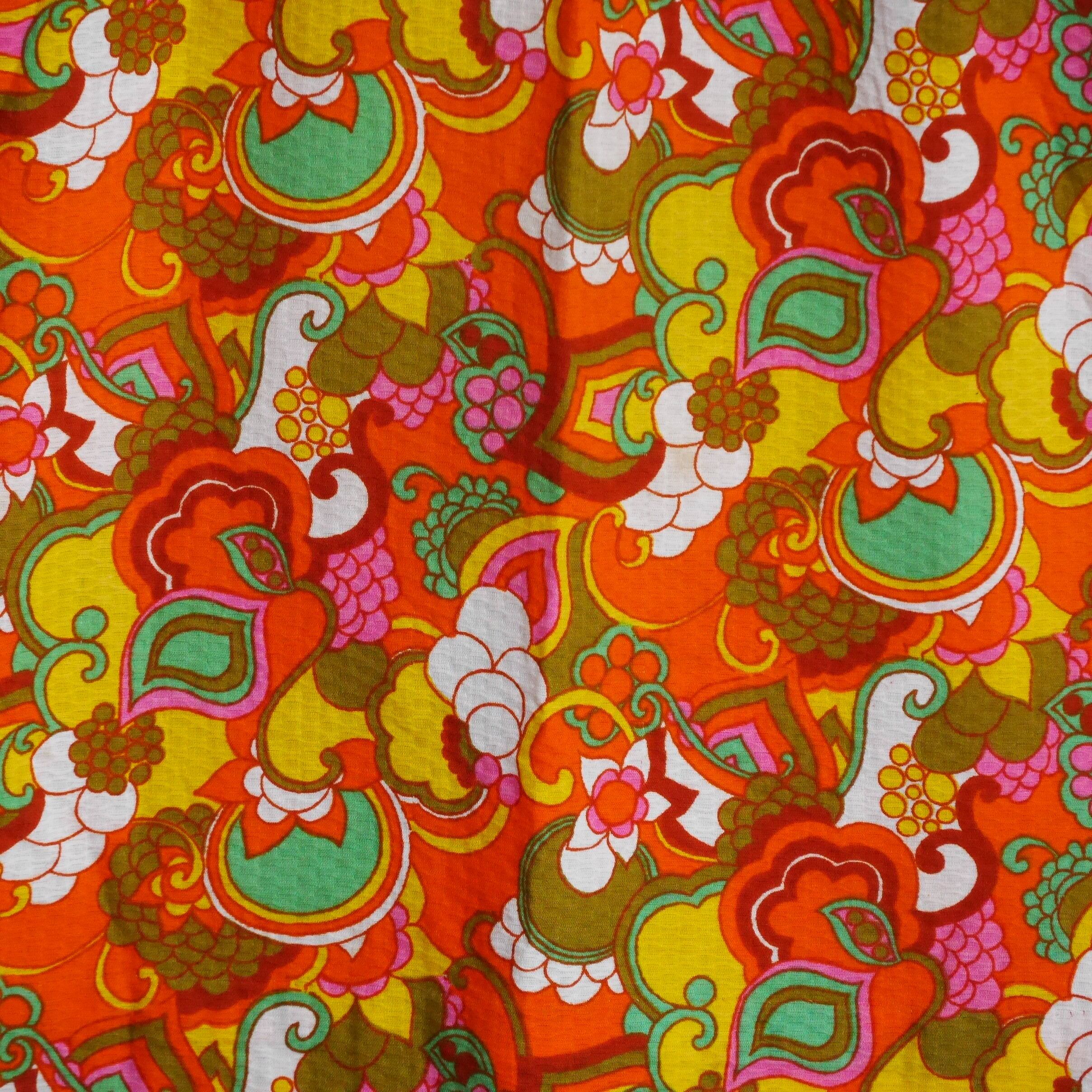 オレンジベースのレトロポップな配色、抽象的でありながらお花など自然を思わせる有機的なパターンなサイケデリック。これほど当時のムーブメントが強く残る、インパクト抜群な柄は他にないでしょう。まさに唯一無二な一枚です。