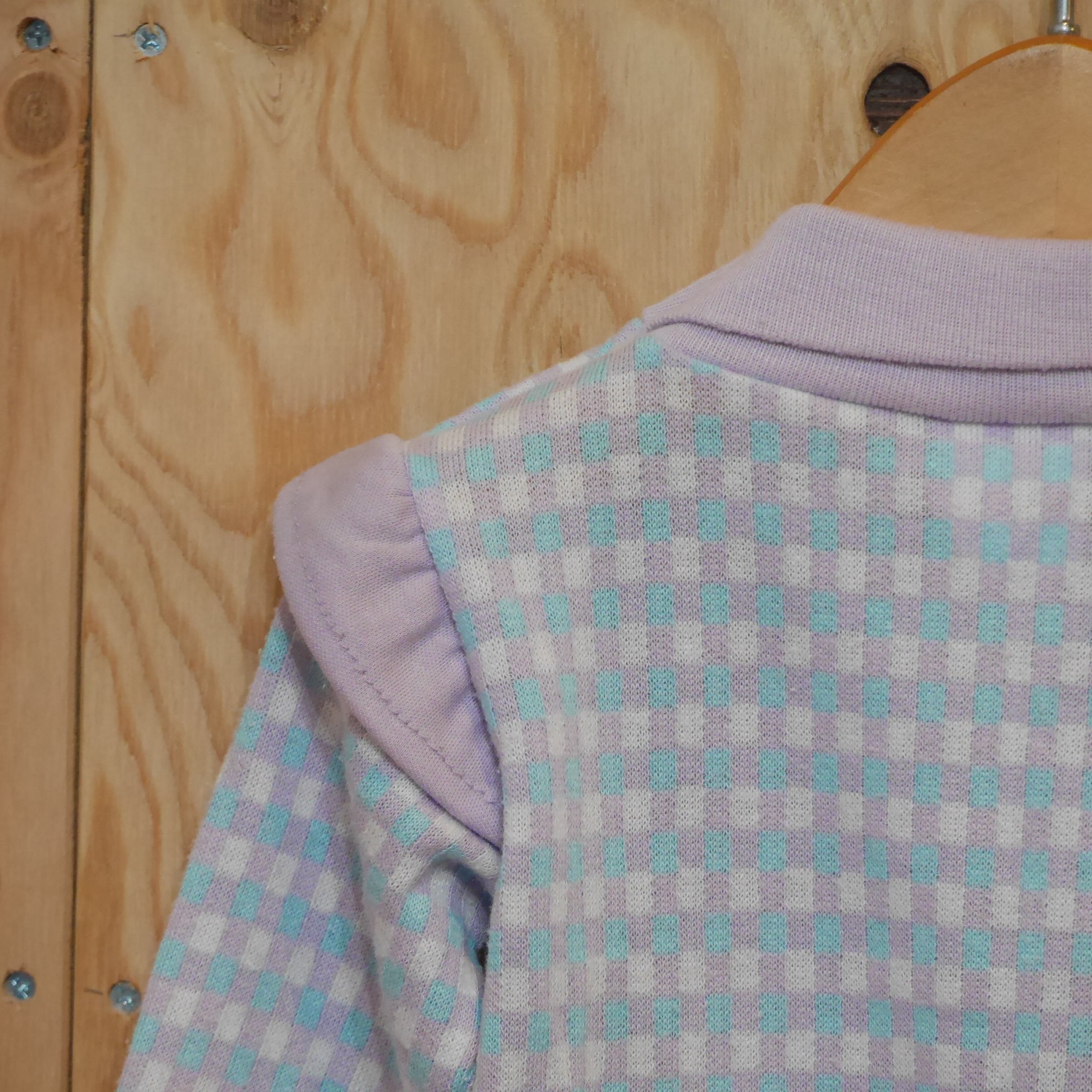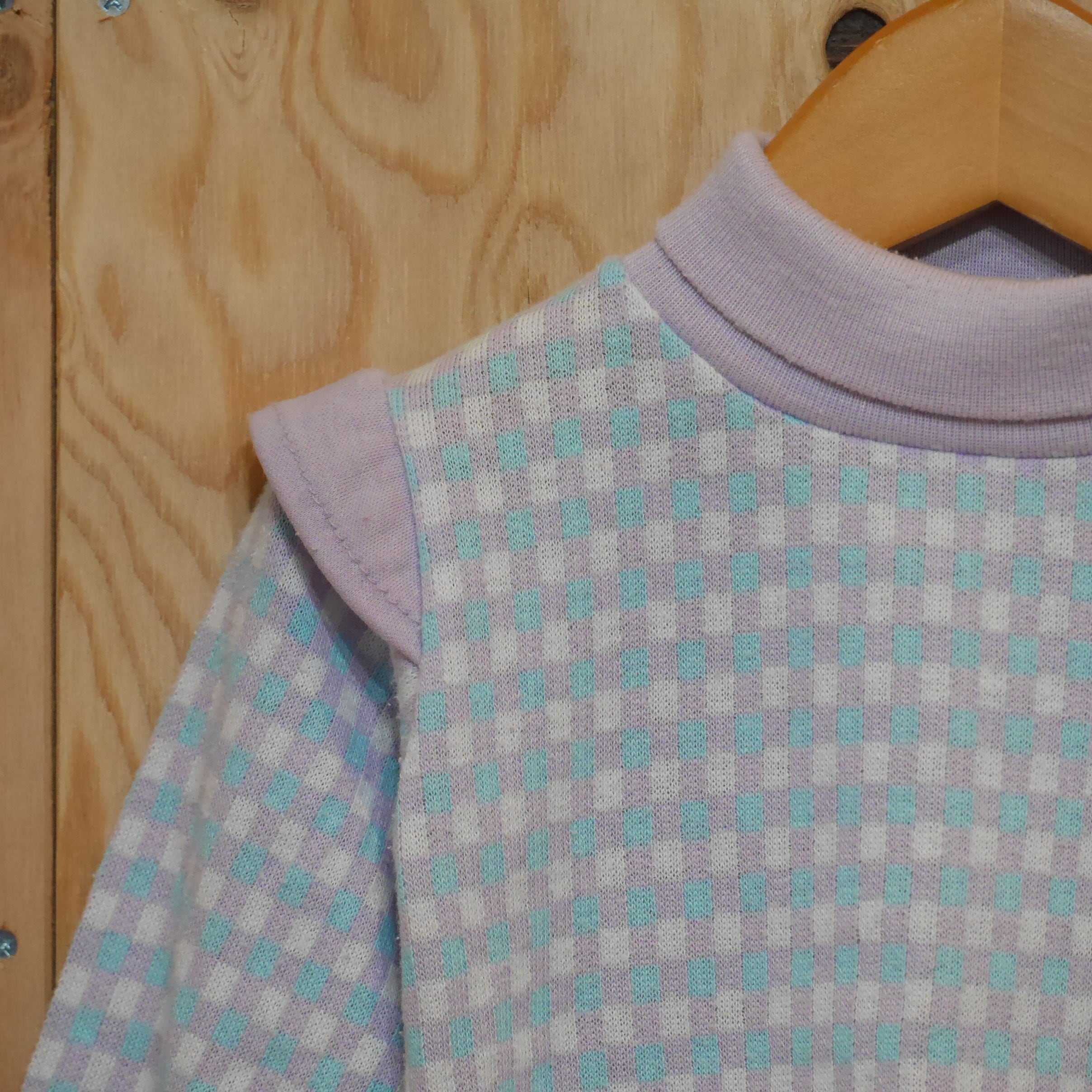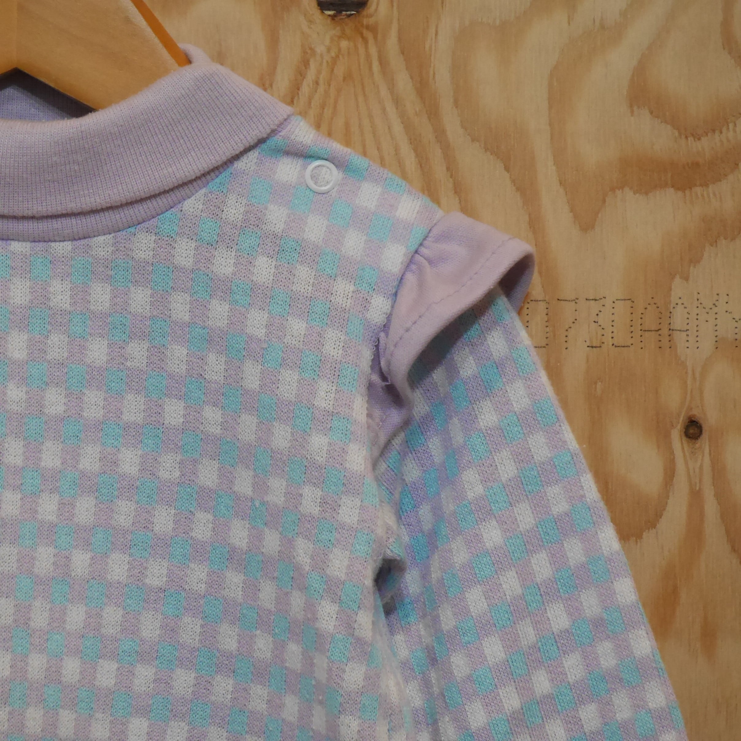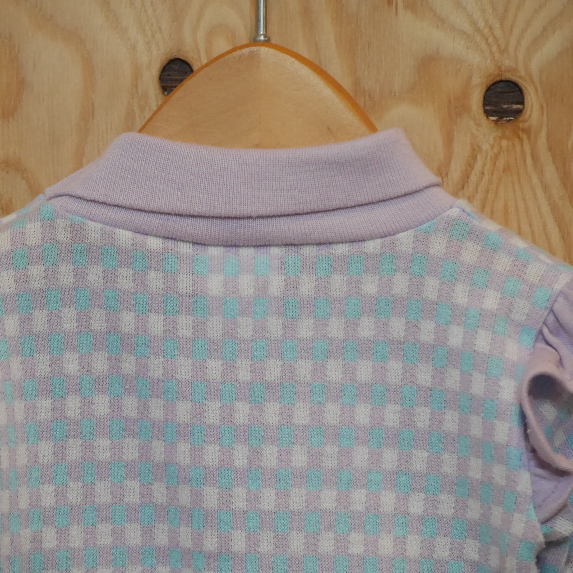 ラベンダーカラーをベースに水色と白色のチェック柄というファンシーな色合いが当時らしい一枚。肩にはショルダーフリルがついているのでよりガーリーな仕上がりに。