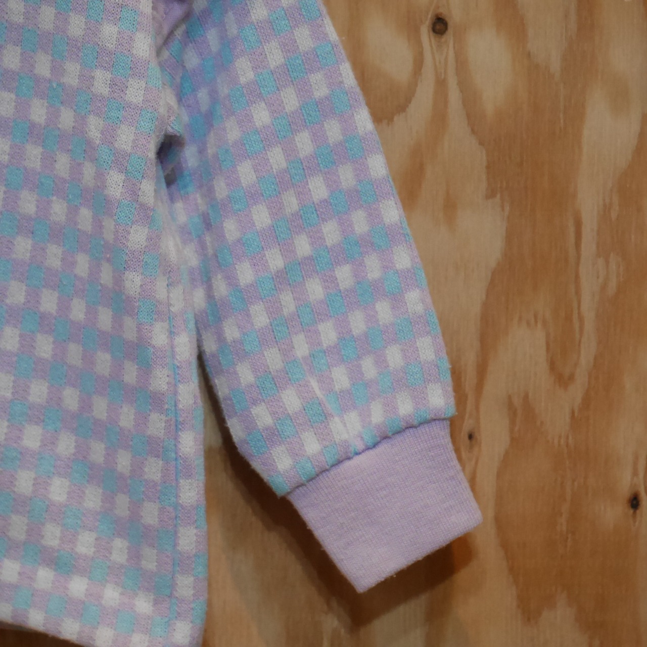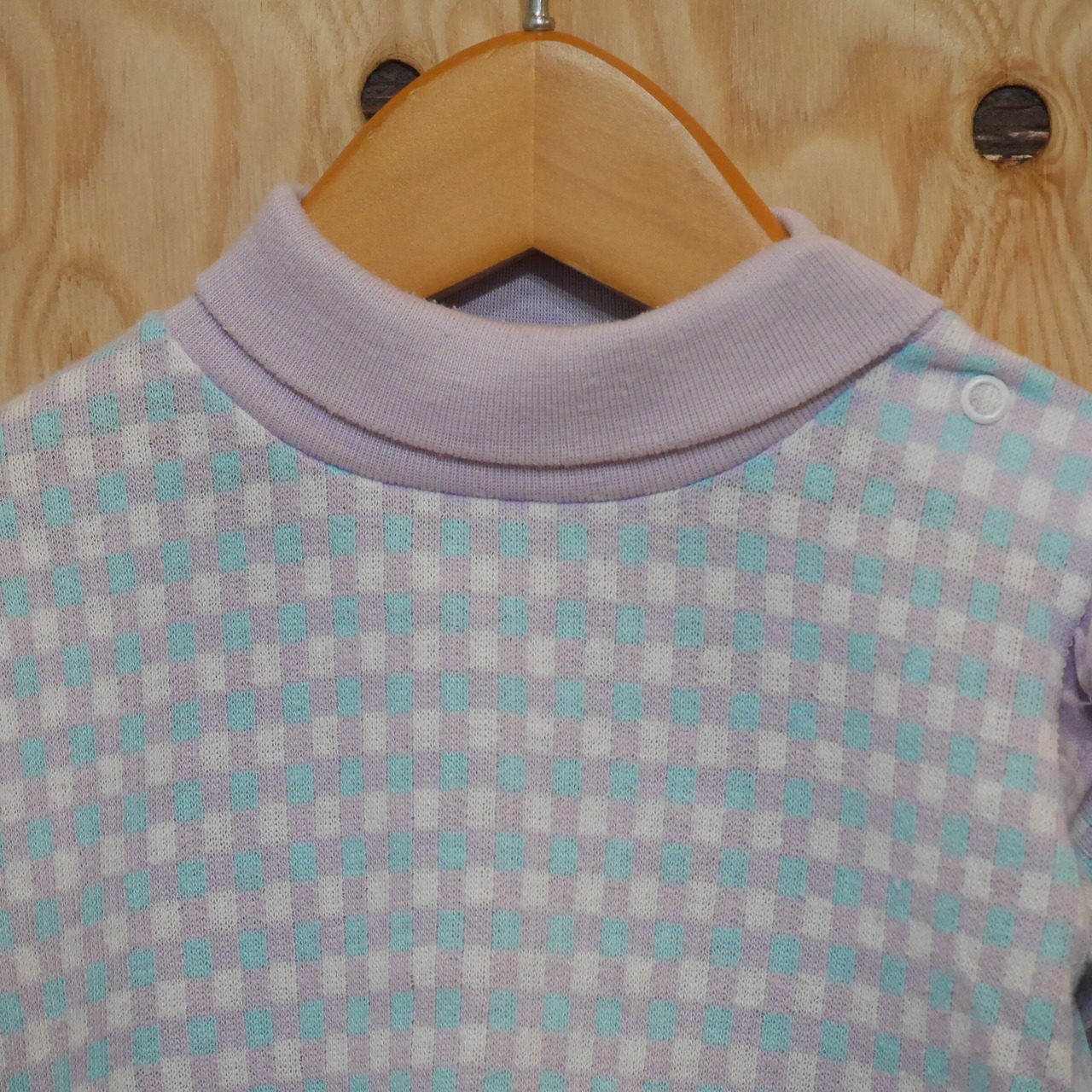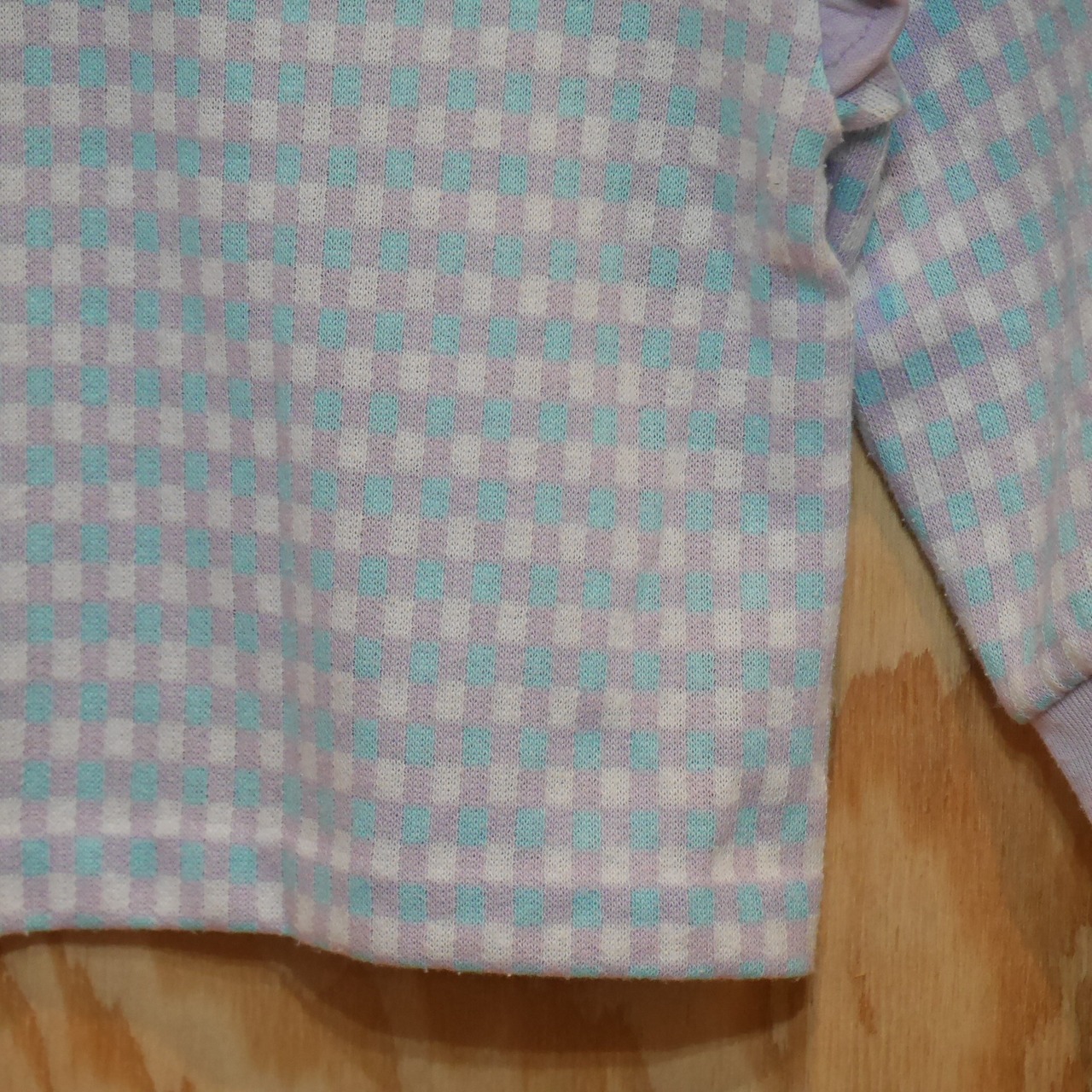 ラベンダーカラーをベースに水色と白色のチェック柄というファンシーな色合いが当時らしい一枚。肩にはショルダーフリルがついているのでよりガーリーな仕上がりに。