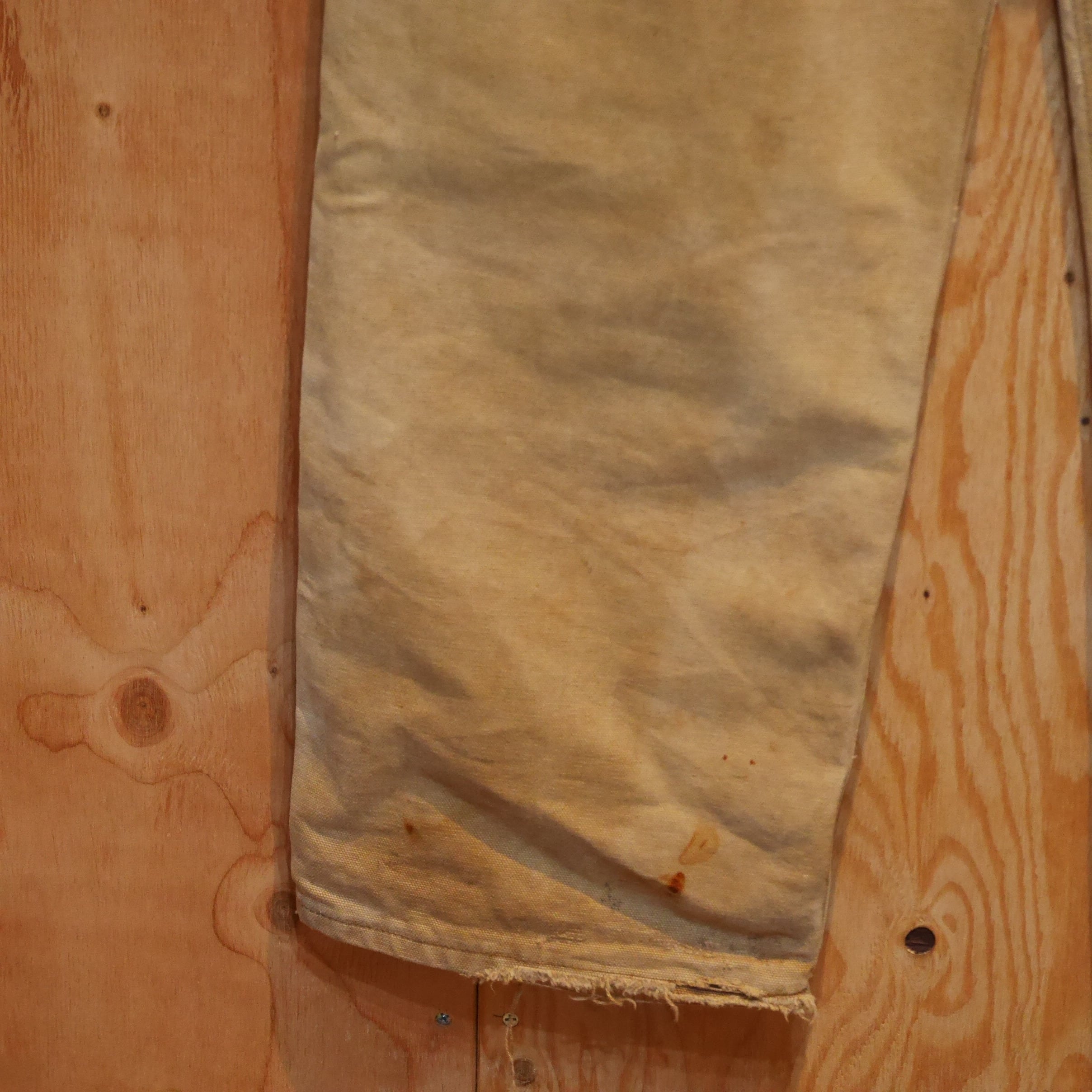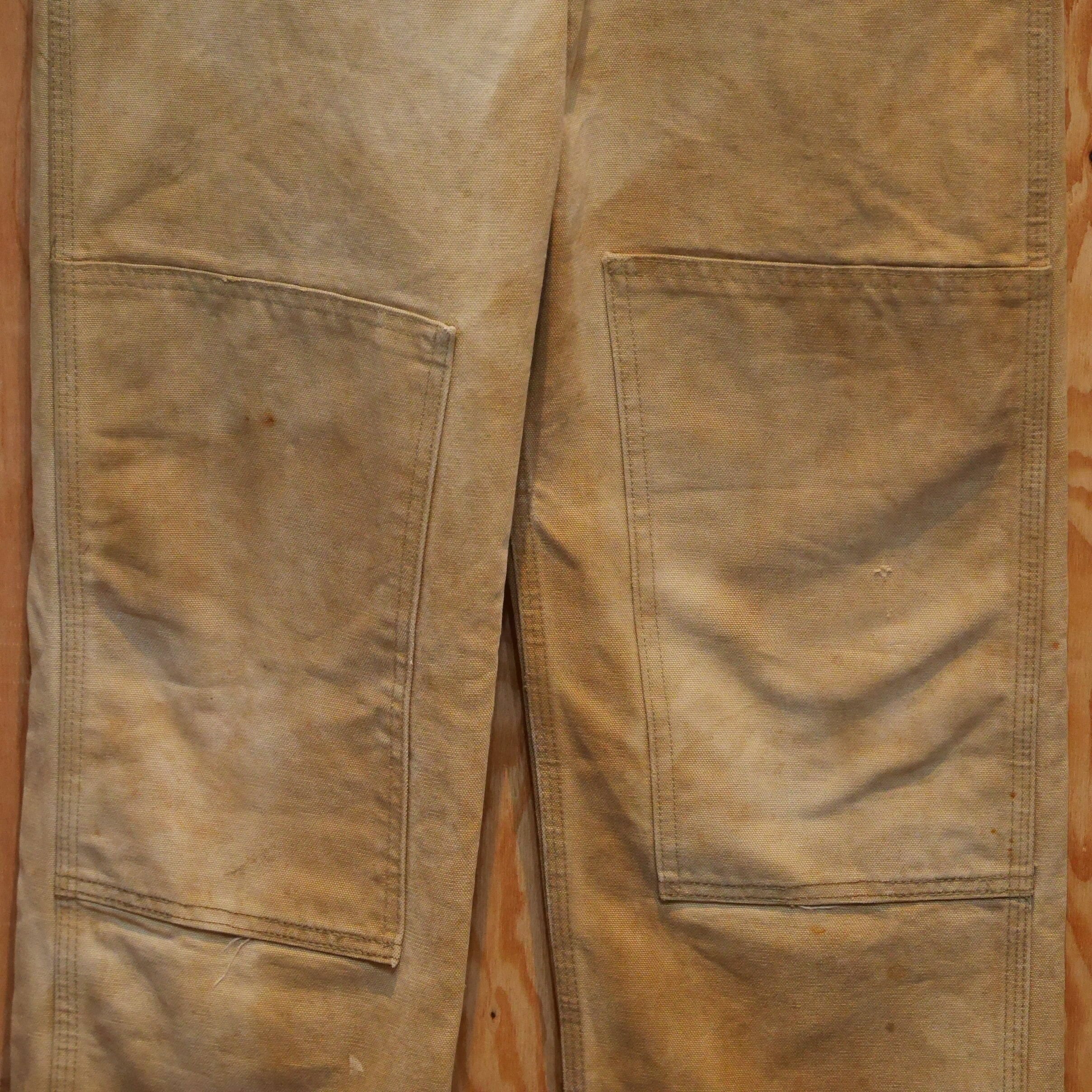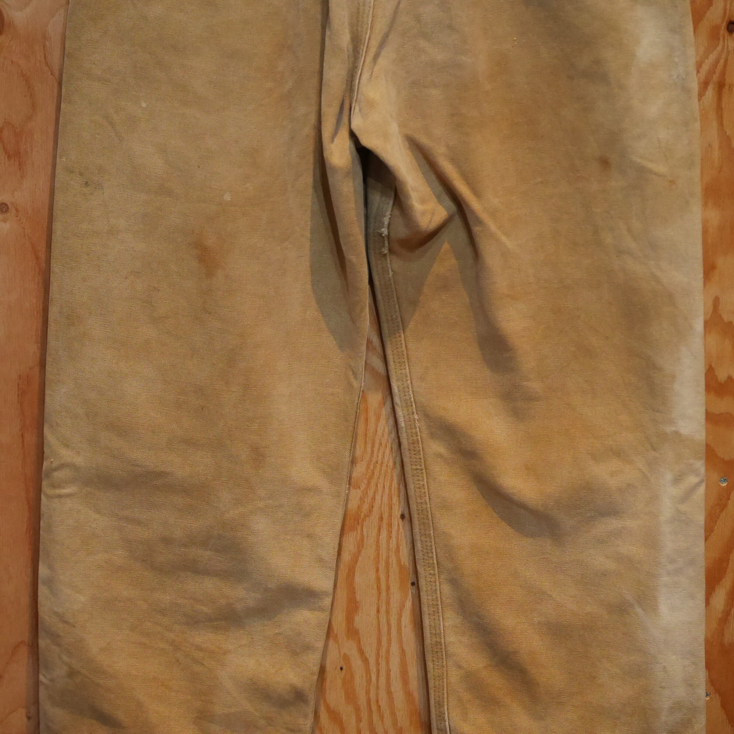 アメリカの人がリアルにワークアイテムとして重宝しているCarhartt。全体的にキャメルは色褪せ、膝のあたりが薄黒く汚れていたりと、リアルに使い込まれたからこその着古し感もまた雰囲気が良くてカッコいい一着です。
