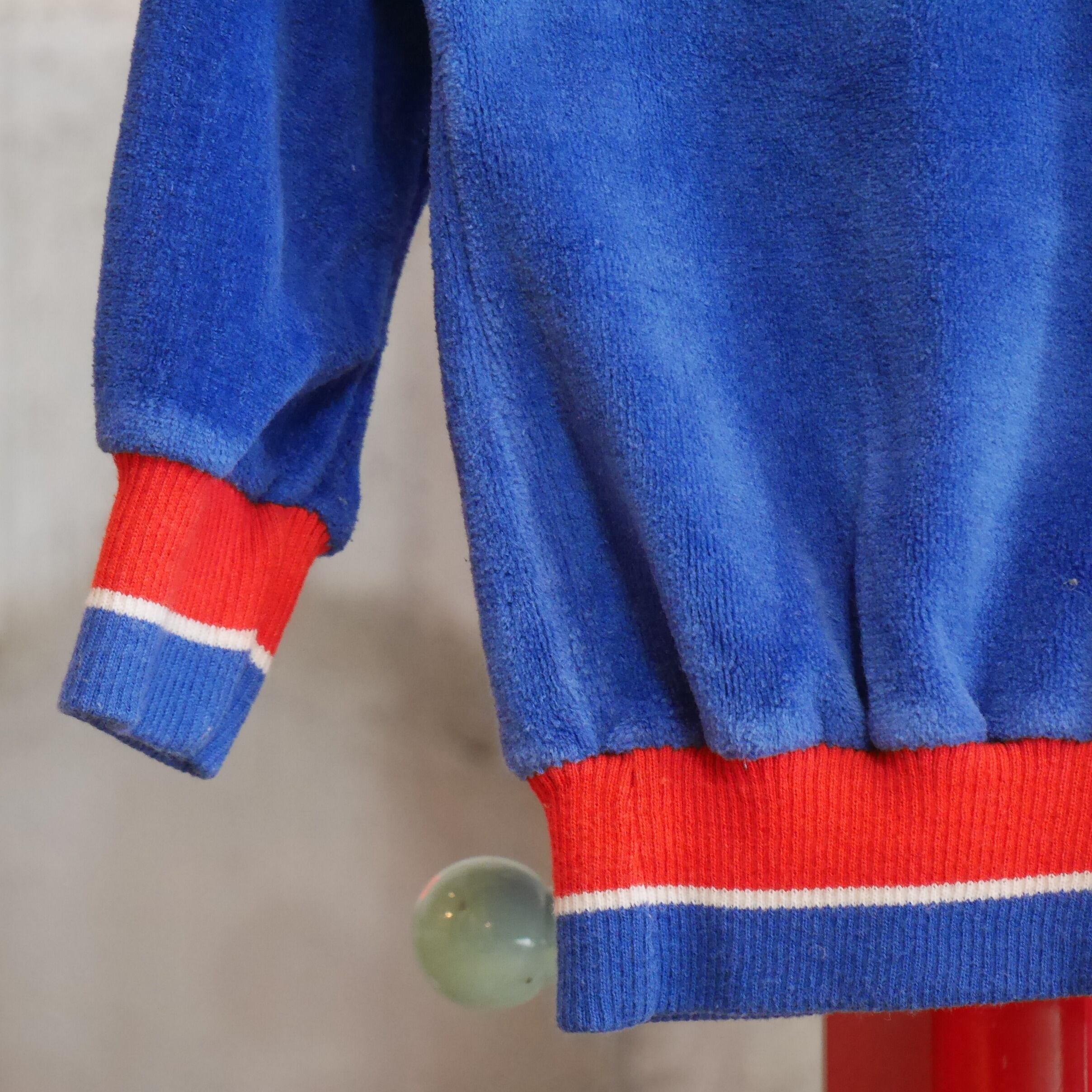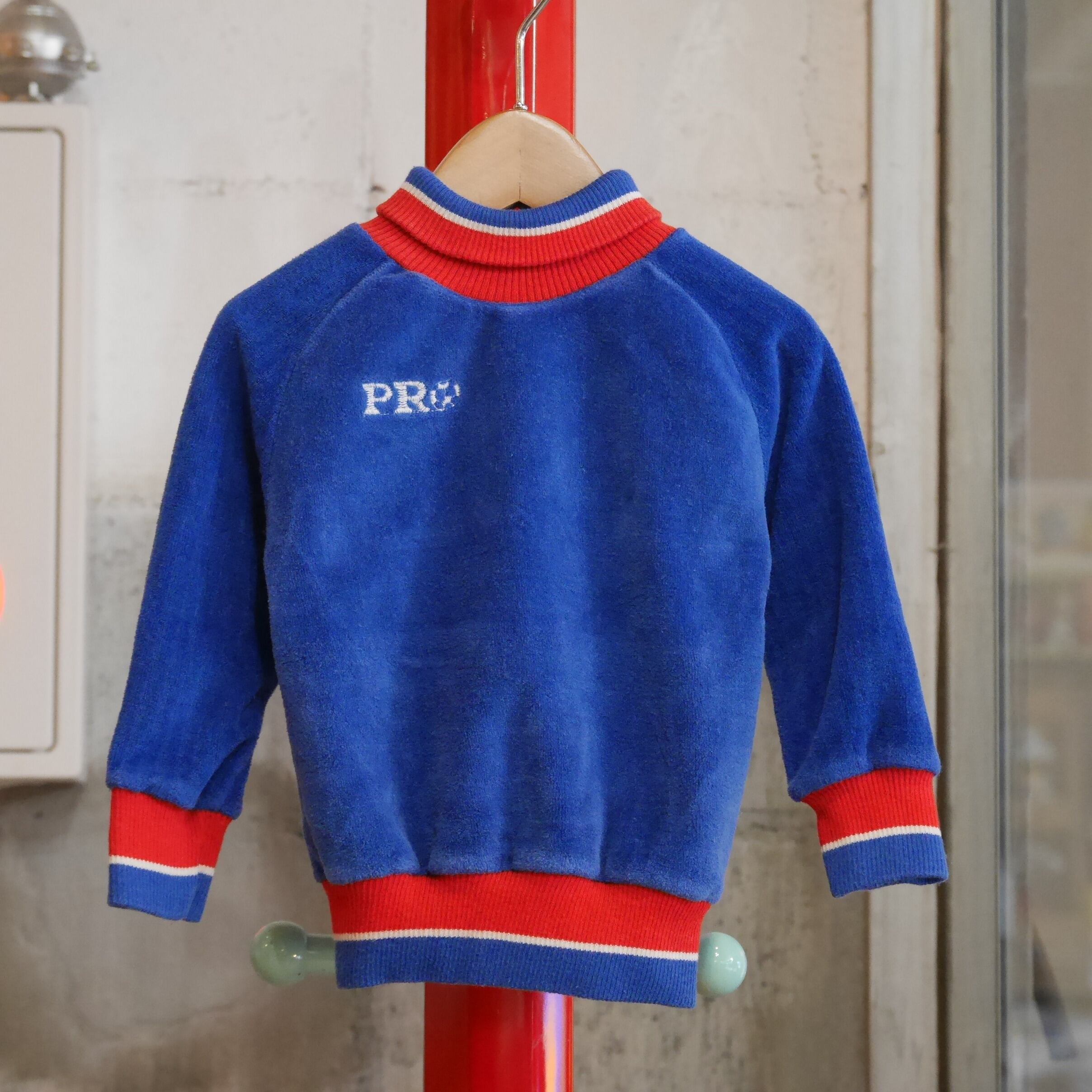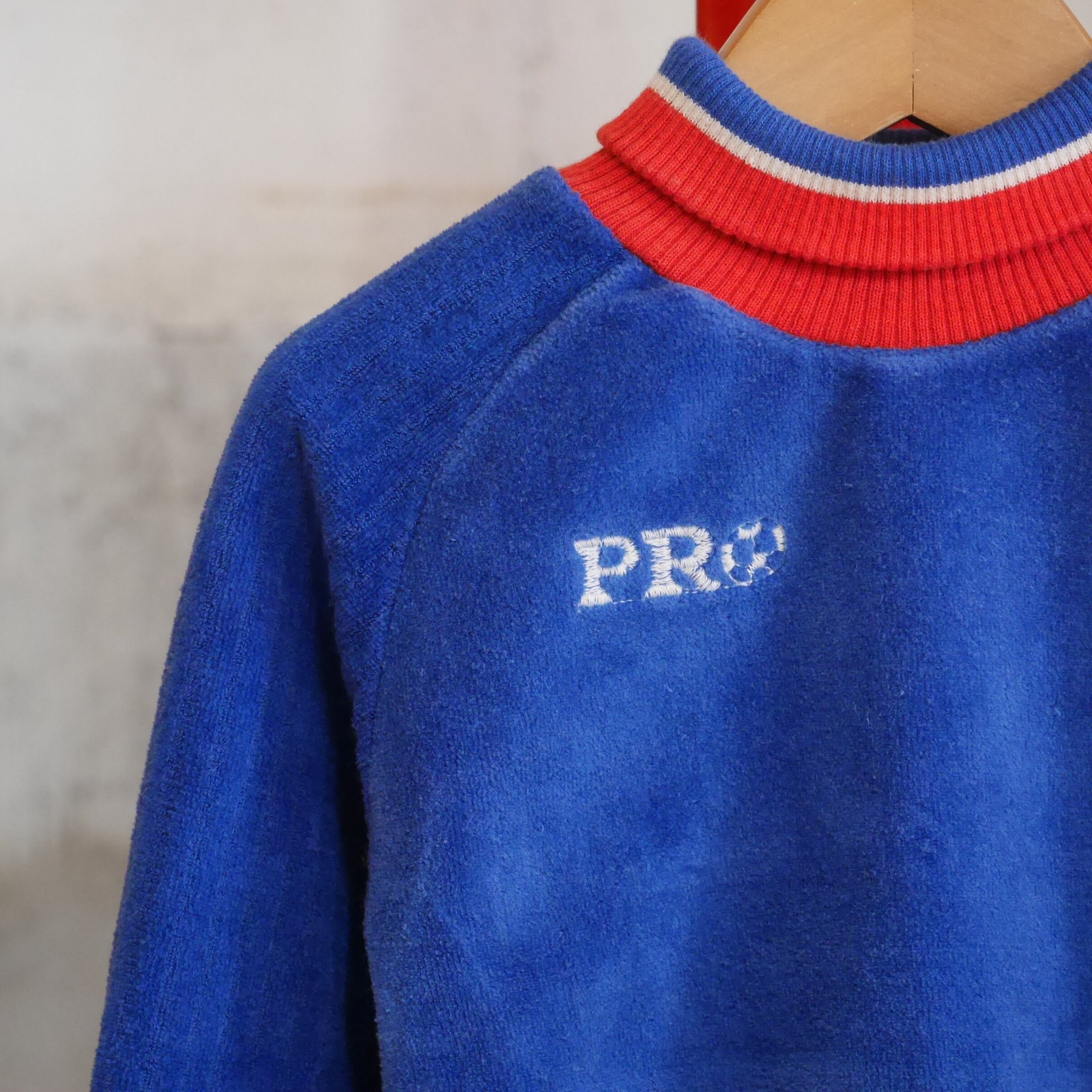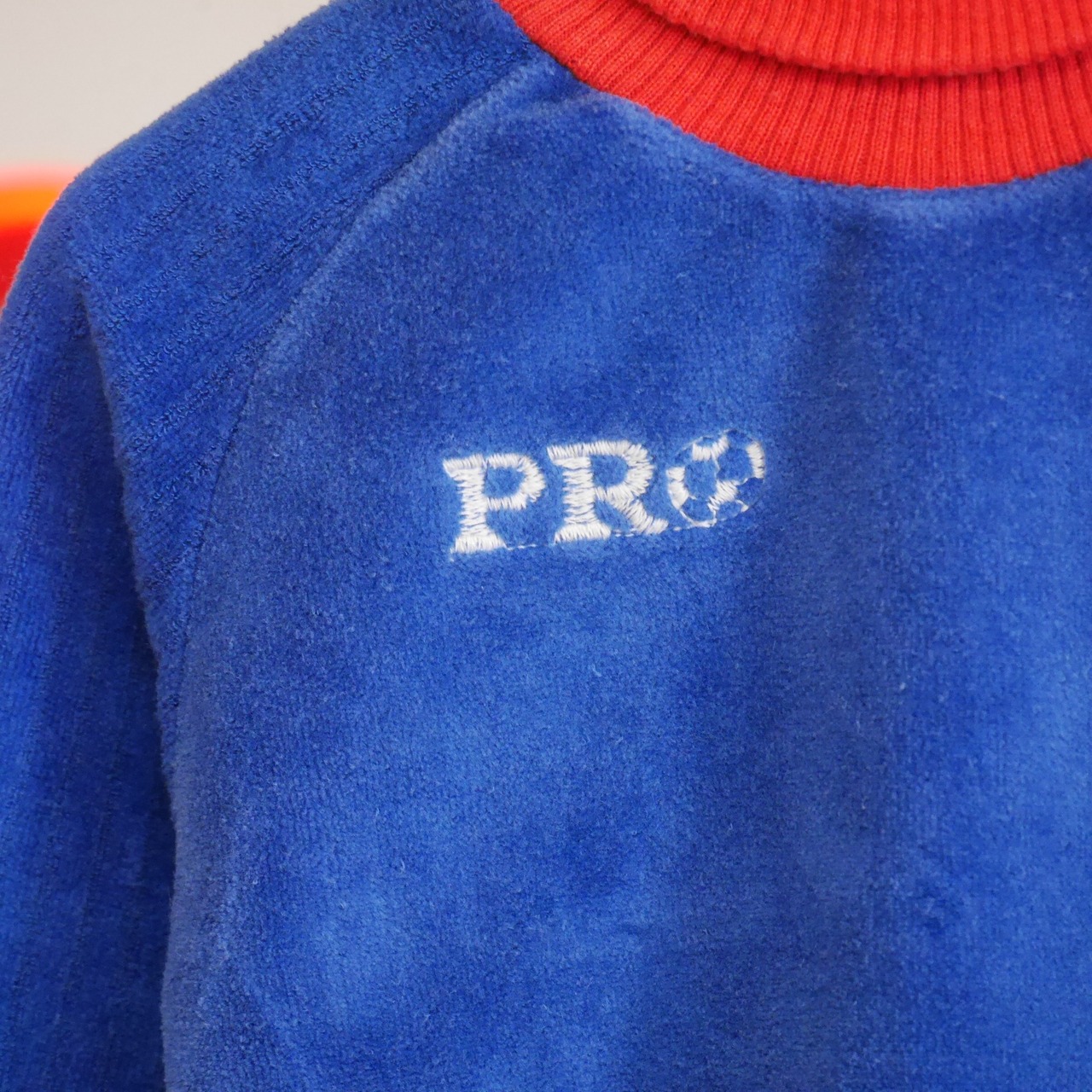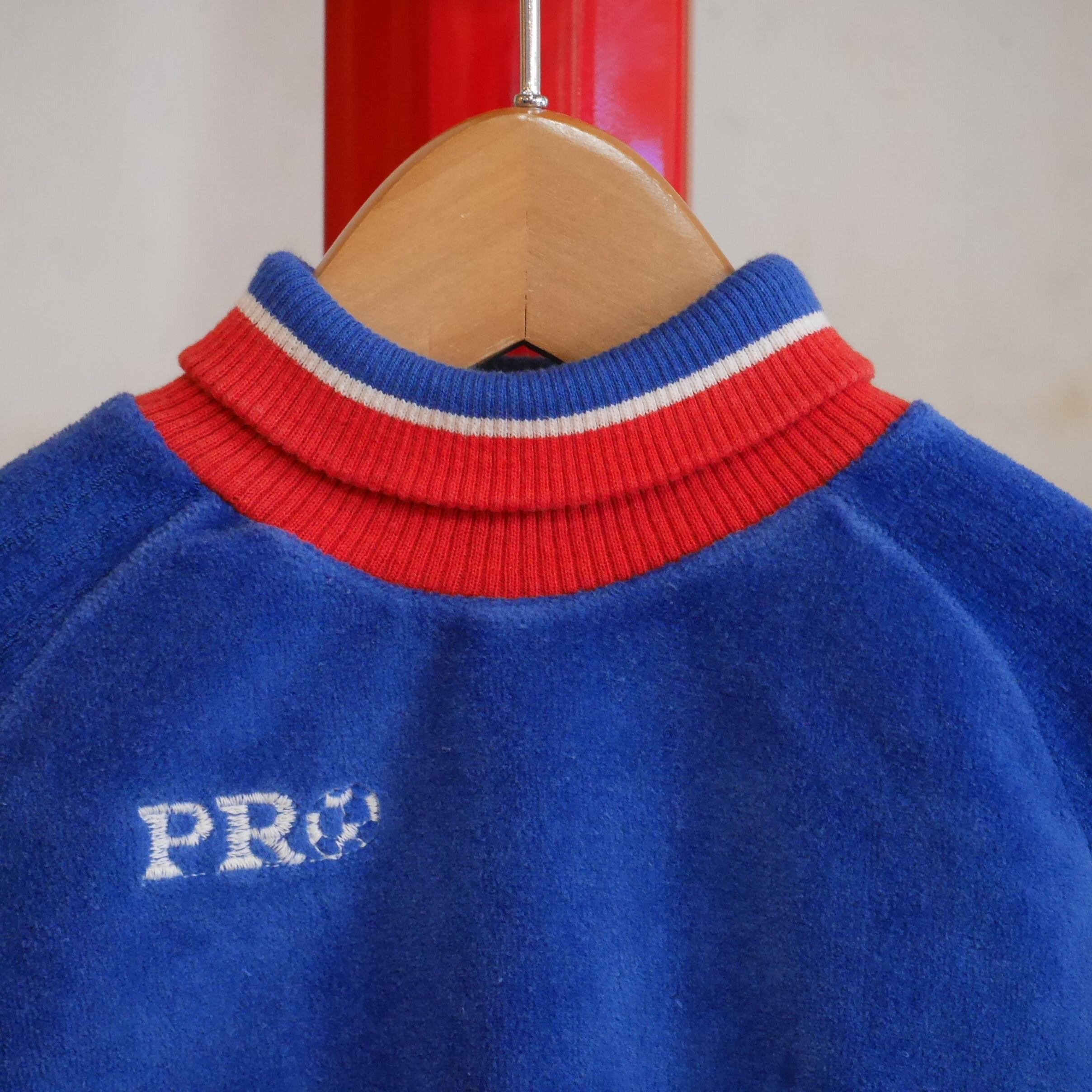 ボディは青のパイルベロア、首や袖口のリブはトリコロールカラーという比較的シンプルなデザイン。目が冴えるようなパキッとした色味に胸元の『PRO』刺繍があり、"O"がサッカーボールになったデザインと細かいディテールにアメリカらしさが伺えます。