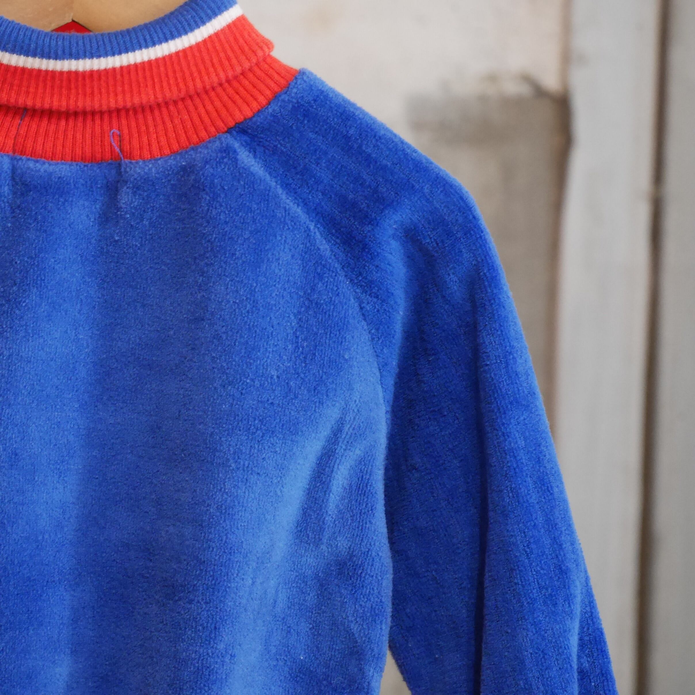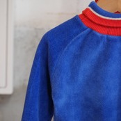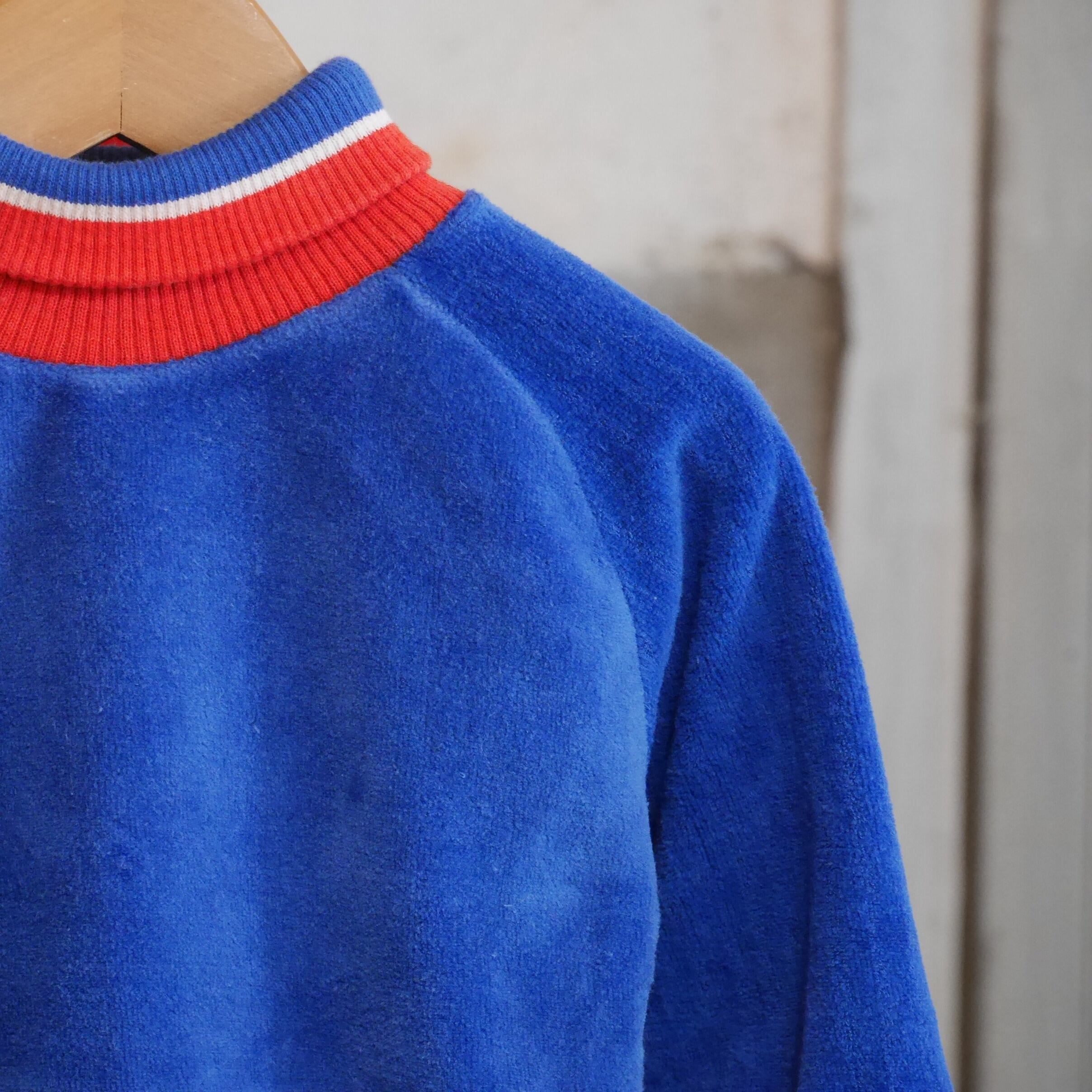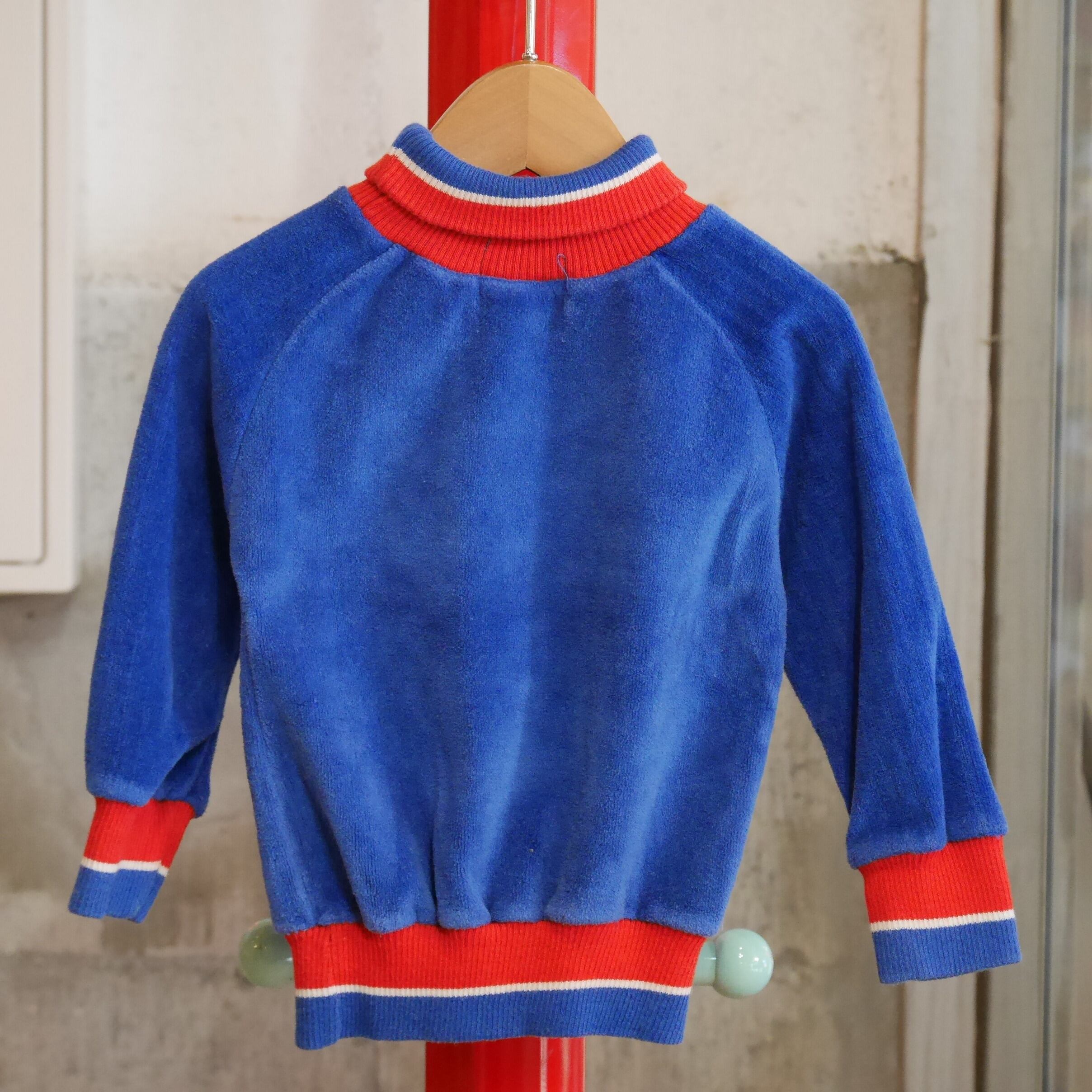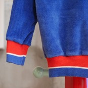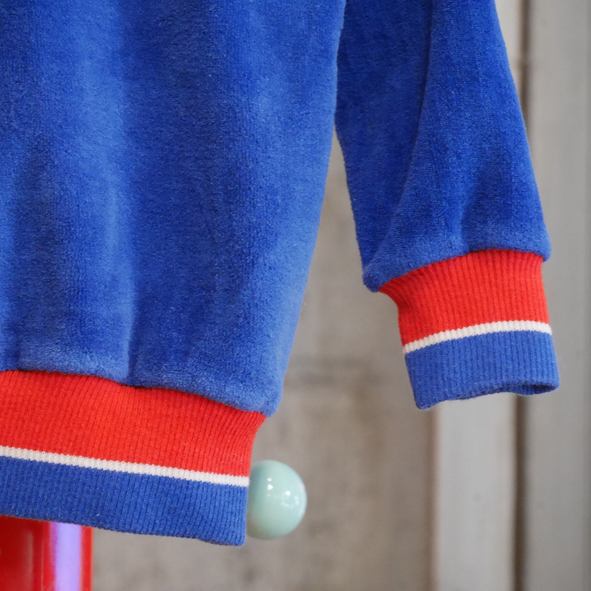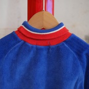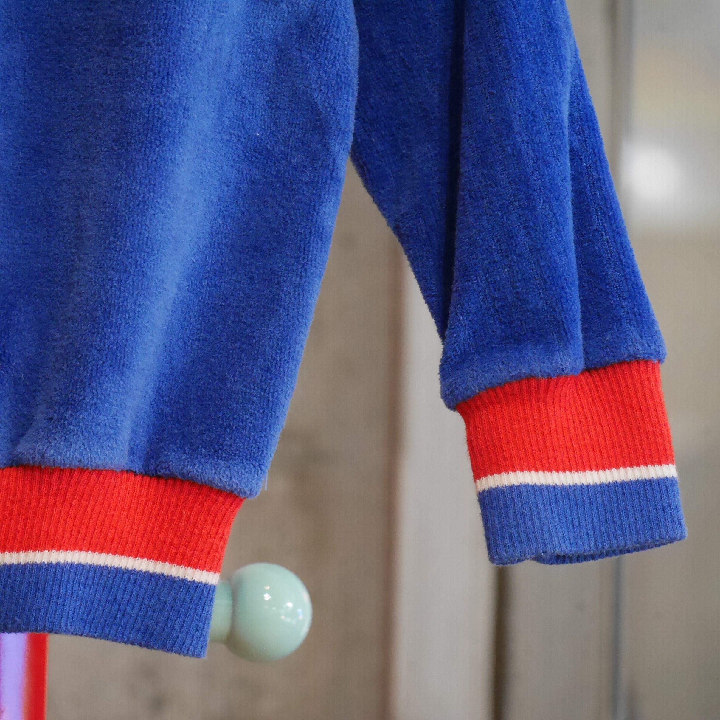 ボディは青のパイルベロア、首や袖口のリブはトリコロールカラーという比較的シンプルなデザイン。目が冴えるようなパキッとした色味に胸元の『PRO』刺繍があり、"O"がサッカーボールになったデザインと細かいディテールにアメリカらしさが伺えます。