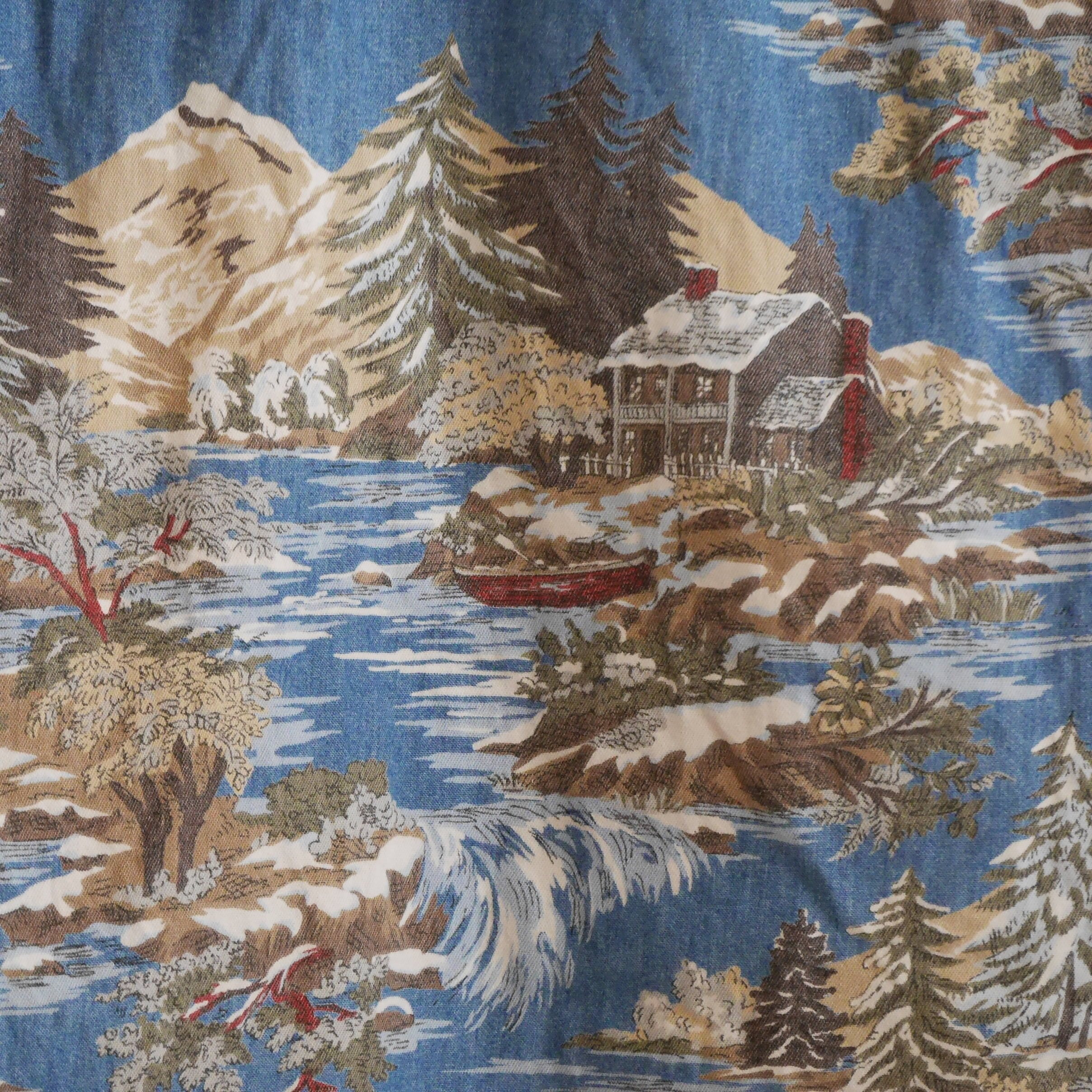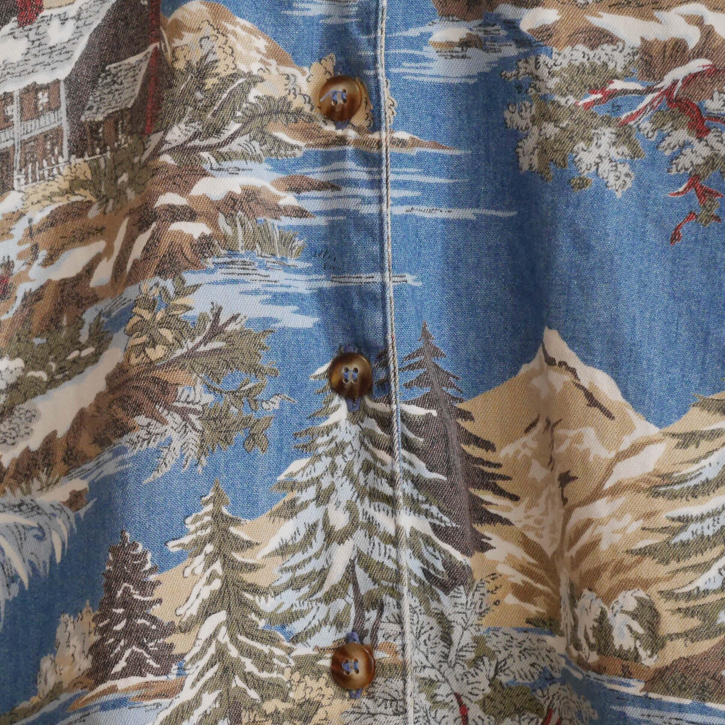 山や湖が広がる中にぽつんと建つロッジに赤いボート。こういう自然の中でゆったりと過ごすことをモチーフとした所謂 "キャビンコア柄"。仕事をしながら自然の癒しを感じていたのでしょうか。