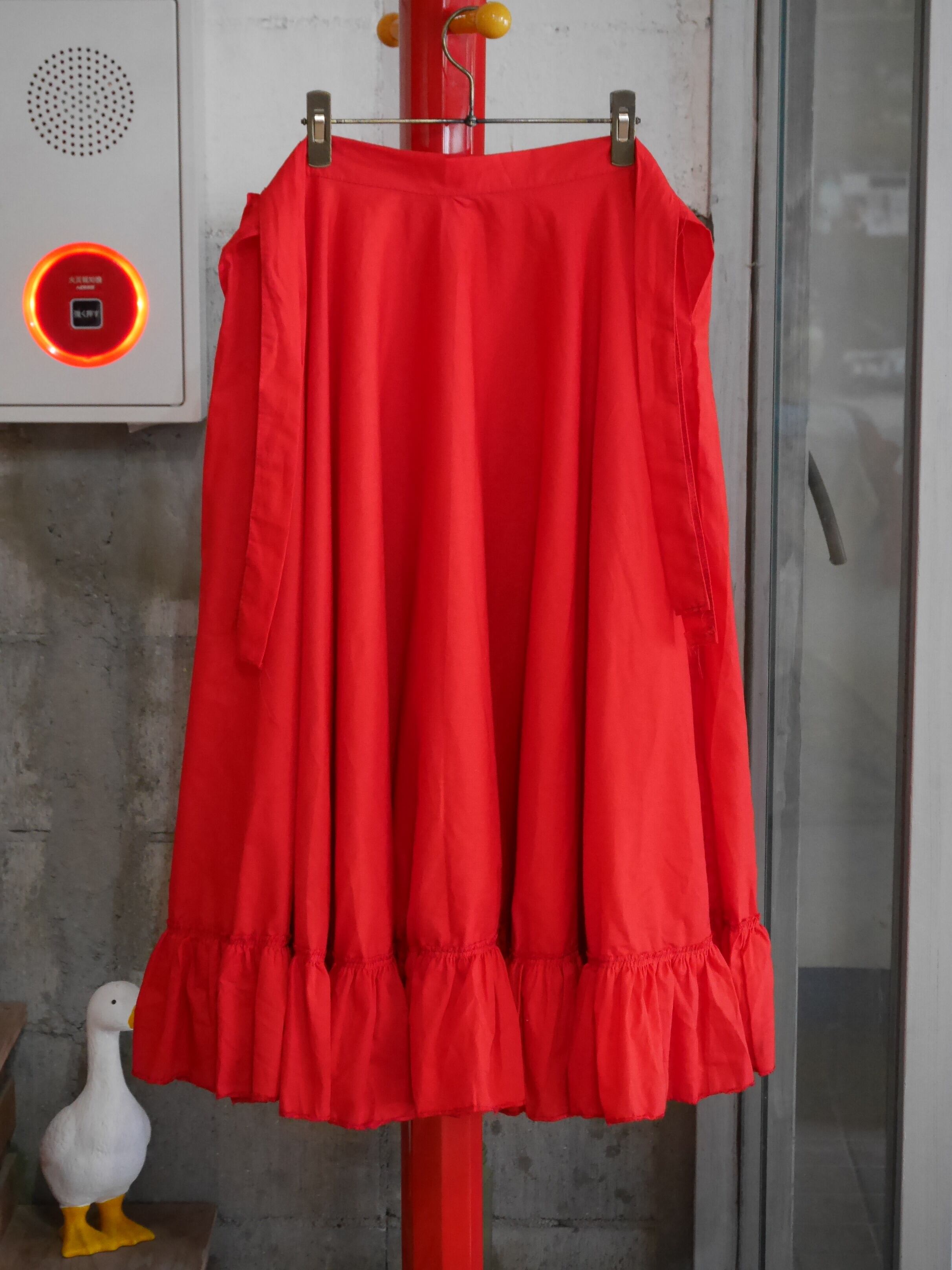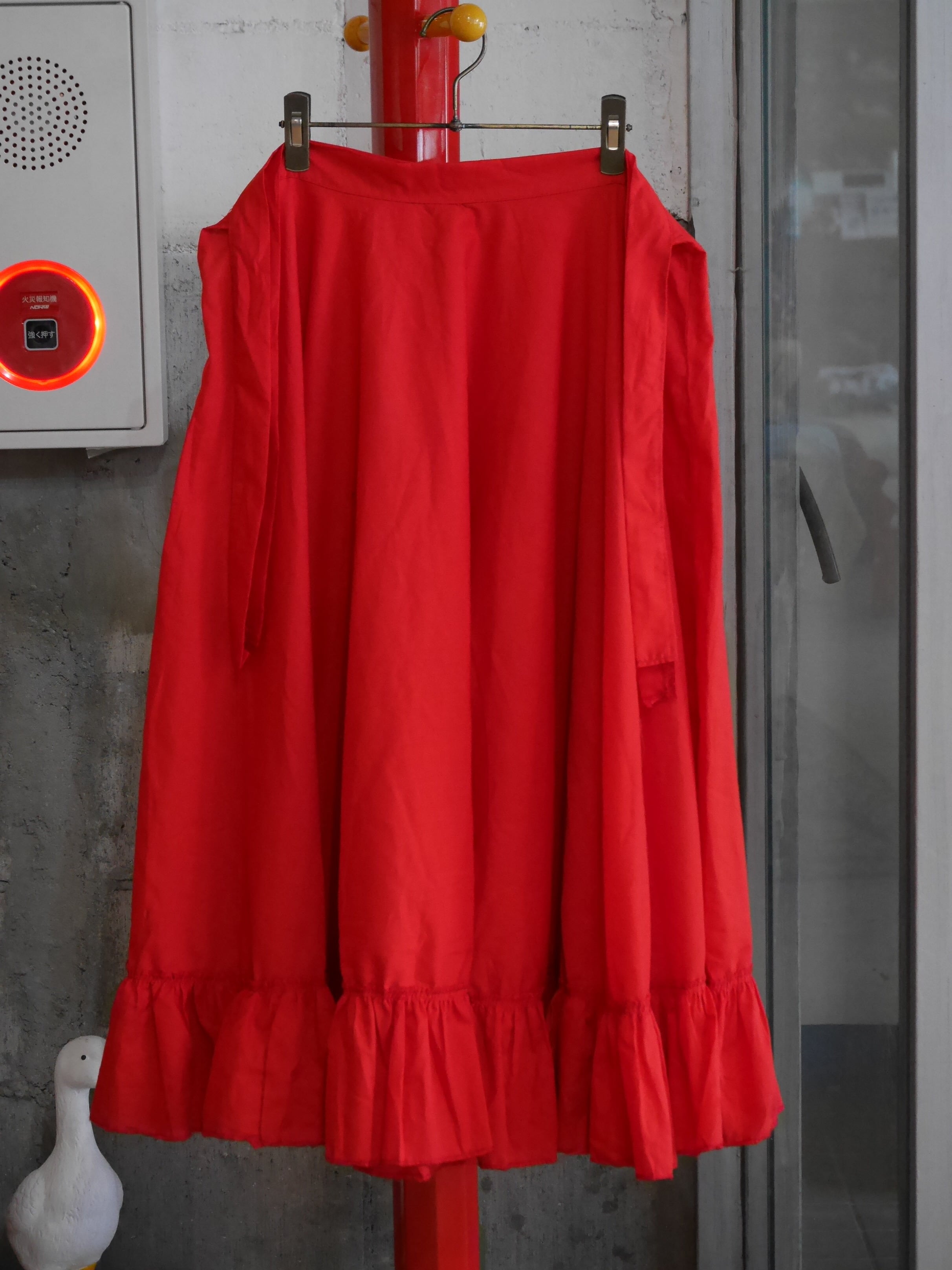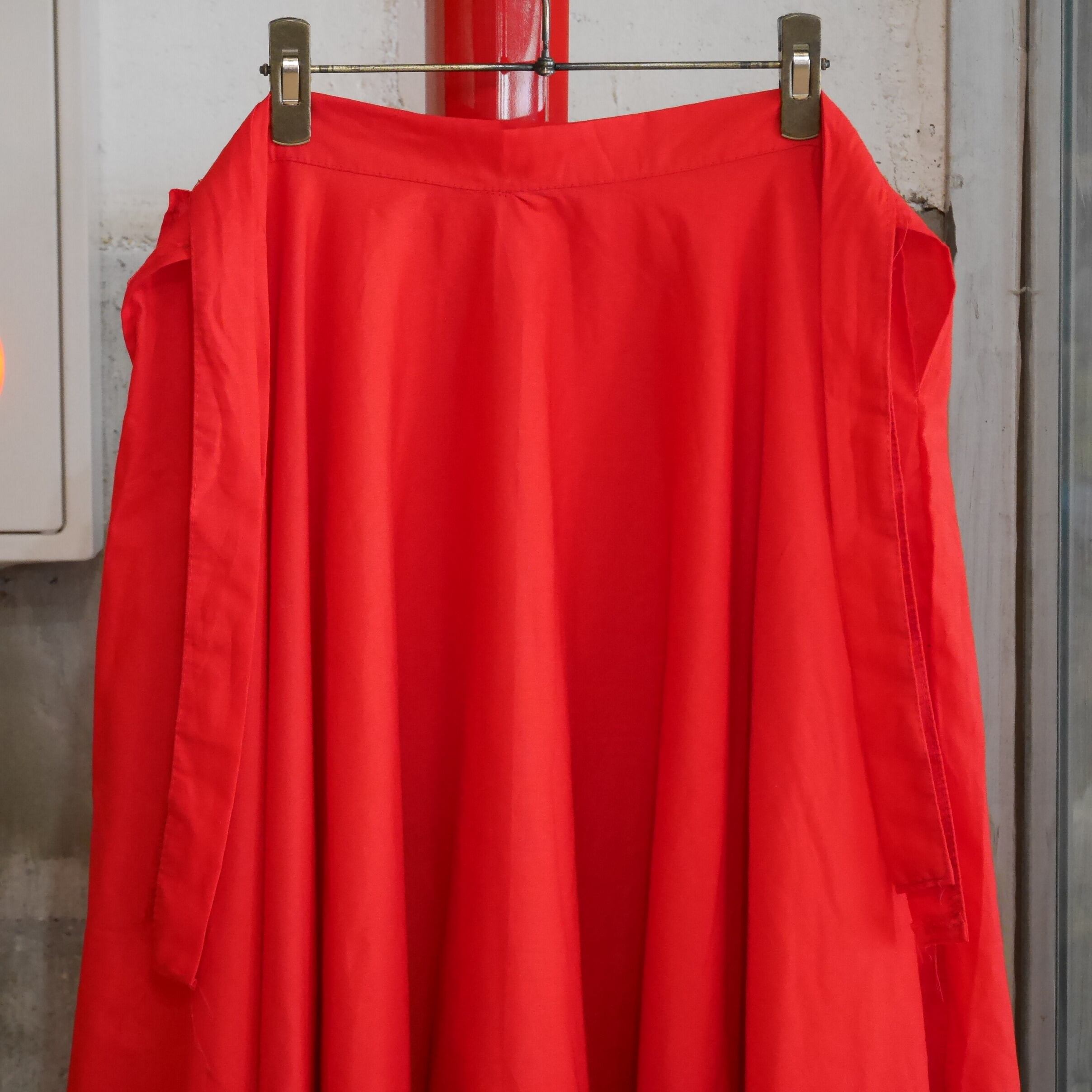 真っ赤なレッドが印象的で、スタイリングの主役としても目を引く巻きスカート。