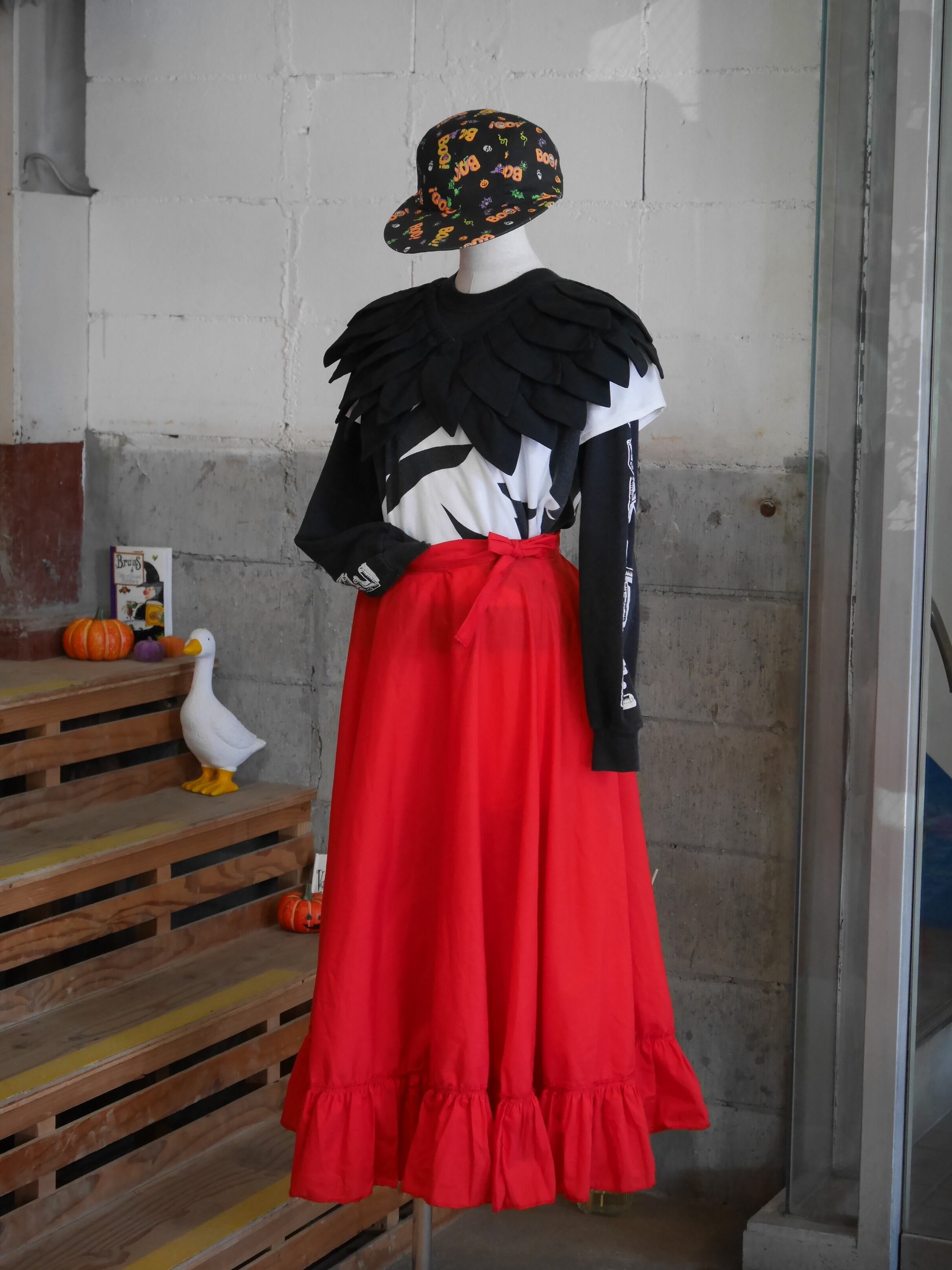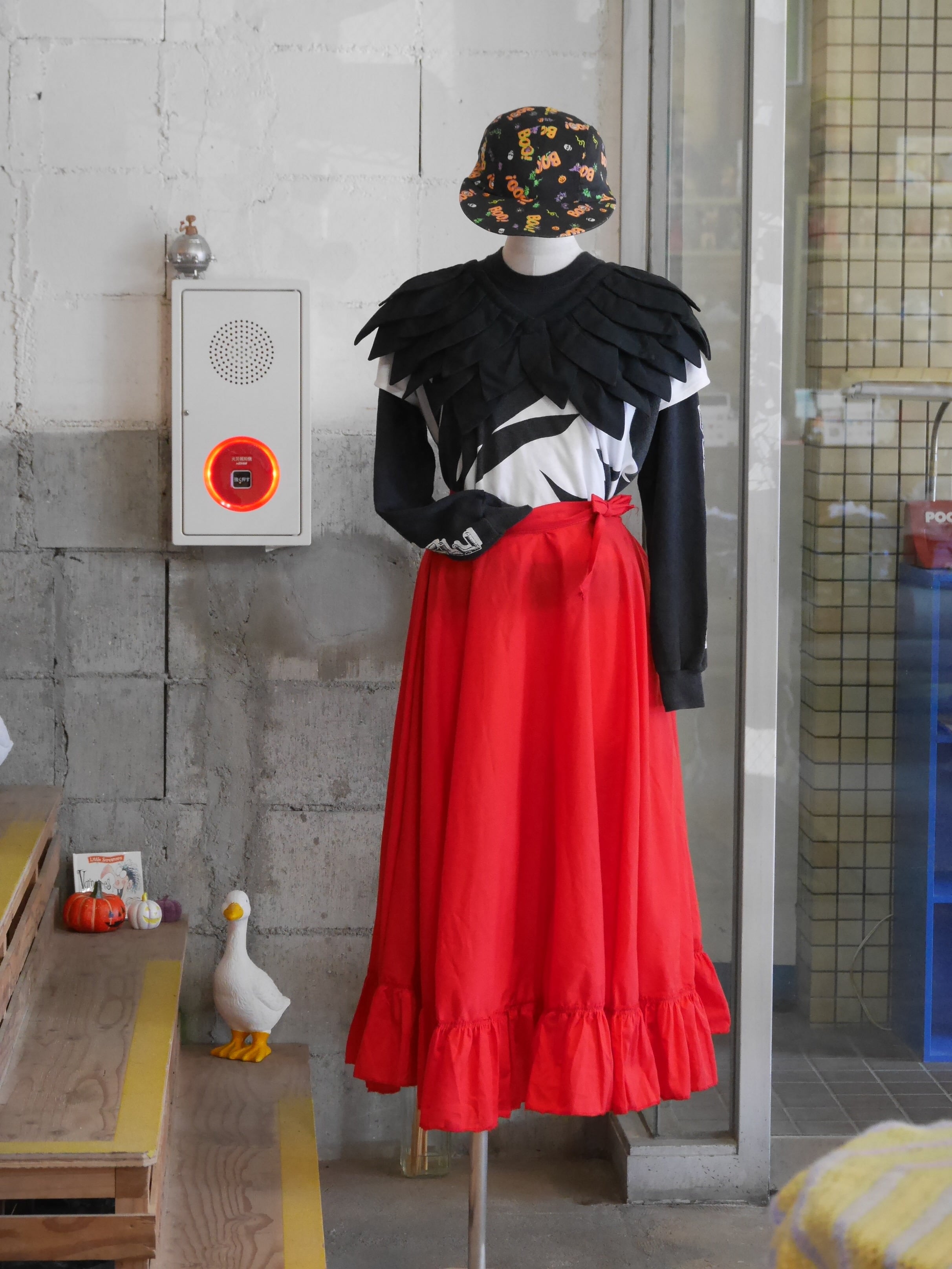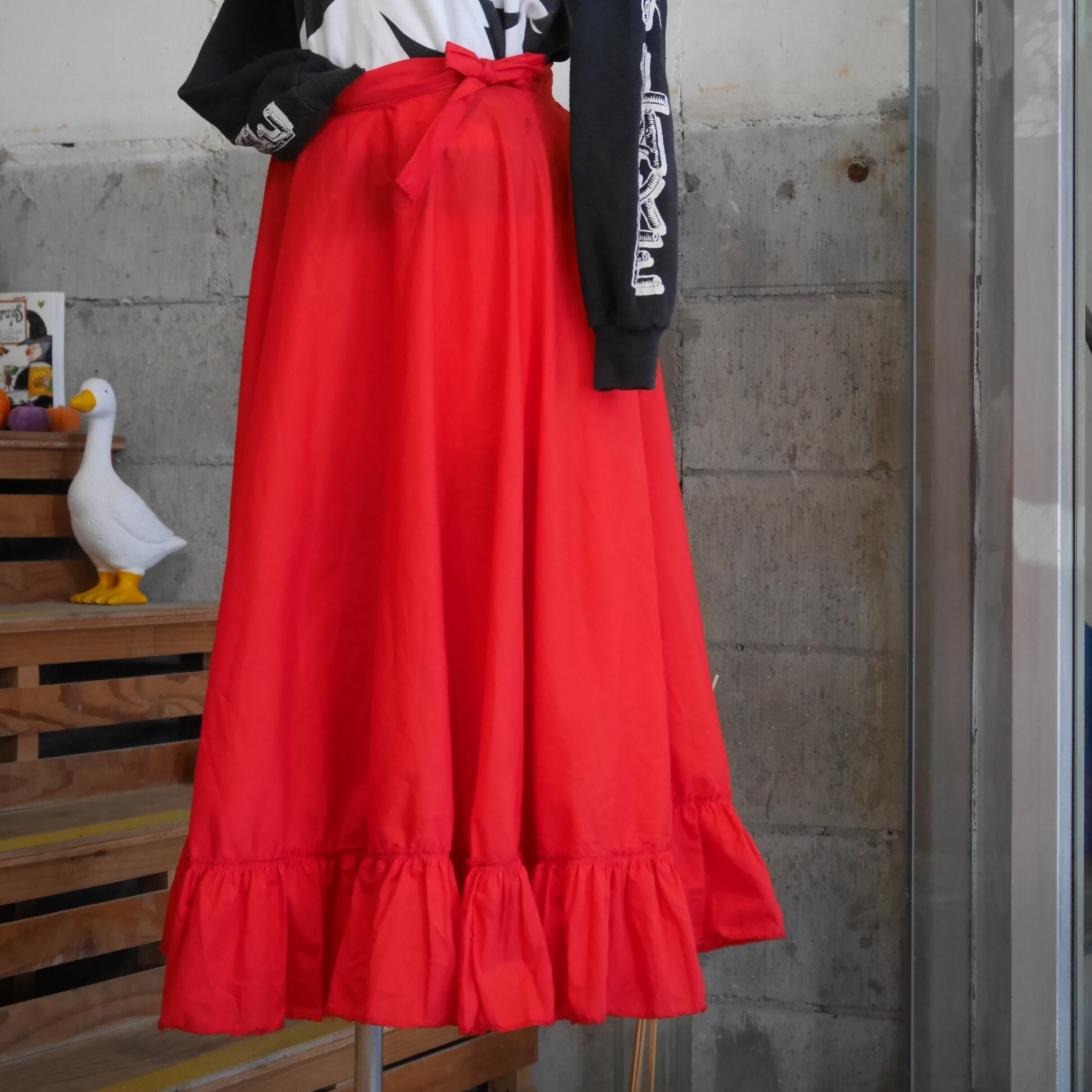 真っ赤なレッドが印象的で、スタイリングの主役としても目を引く巻きスカート。