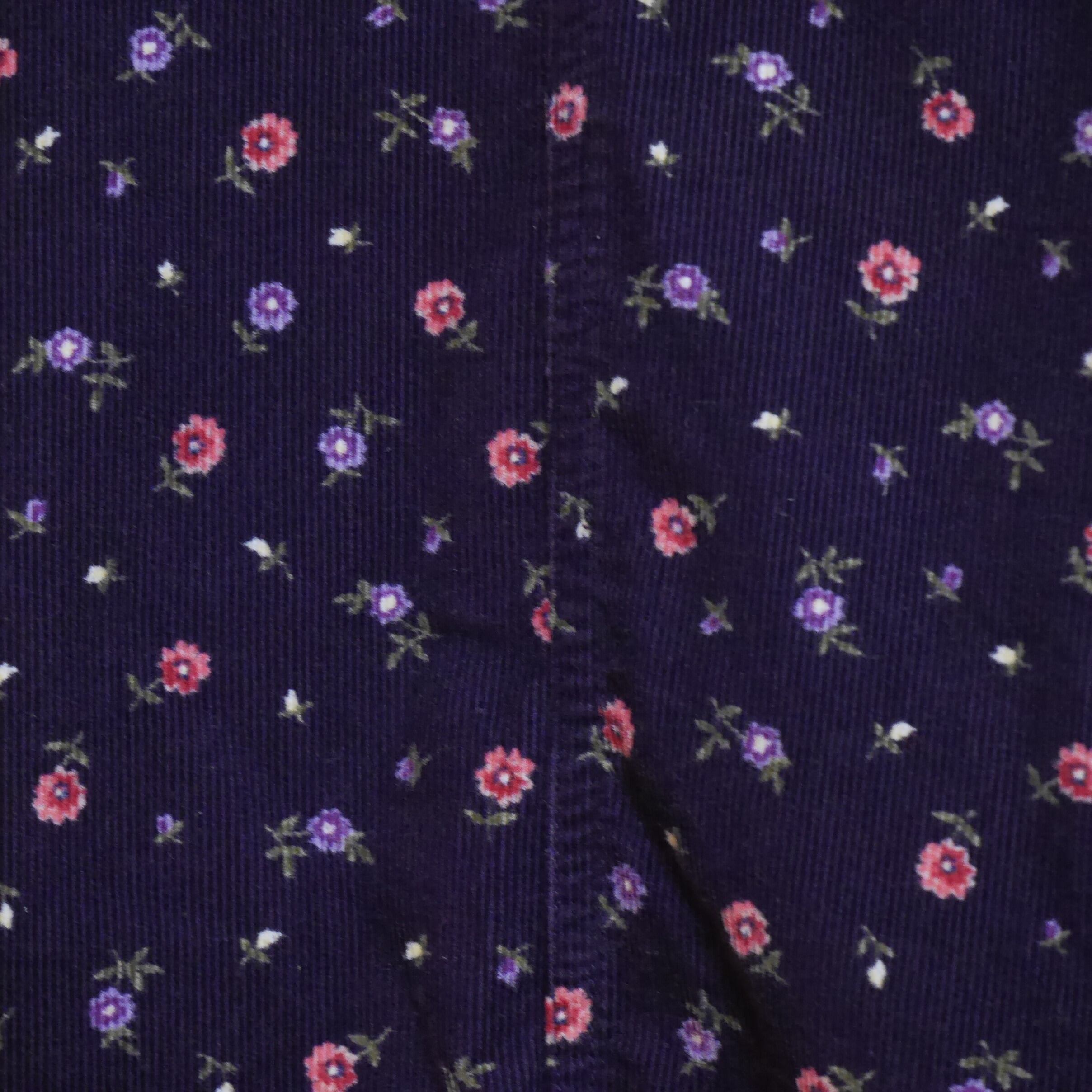 紫の細畝コーデュロイにピンクとラベンダーのお花がプリントされたワンピース。