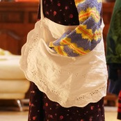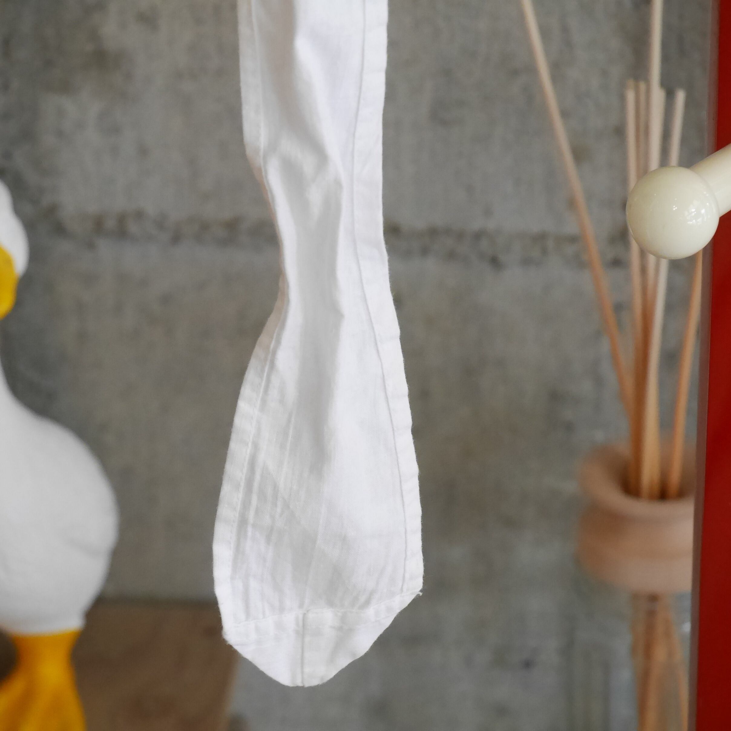 刺繍デザインなどから見てドイツやオーストリアなど東欧にて作られたものかと思います。当時ヨーロッパでは家庭用の他にもお洒落用のエプロンもあったのだとか。こちらはどちらかと言うとお洒落用として作られたもの。現代でも腰巻きや、スタイリングのように斜め掛けなどプラウワンアイテムとして使うとこなれ感がアップするため重宝します。