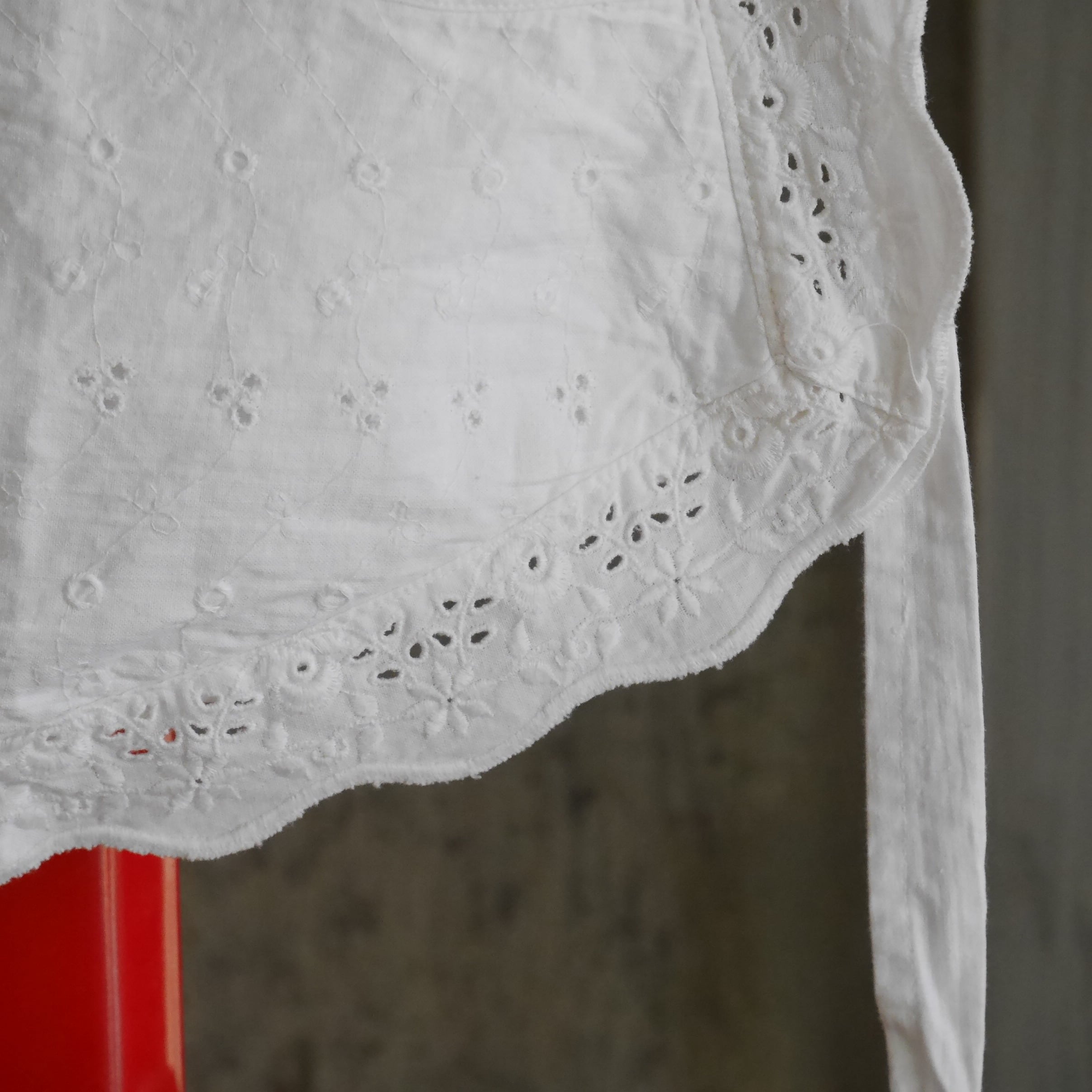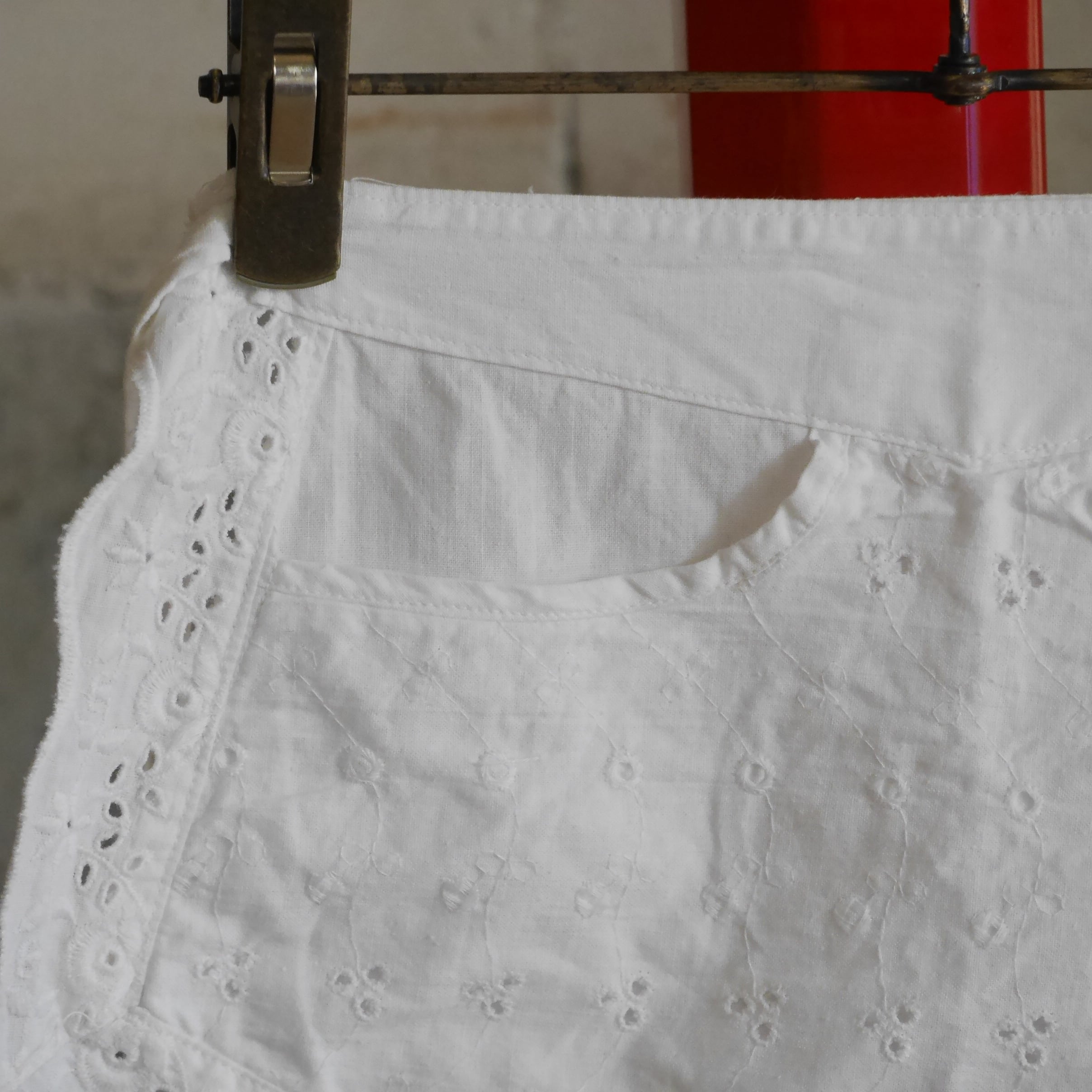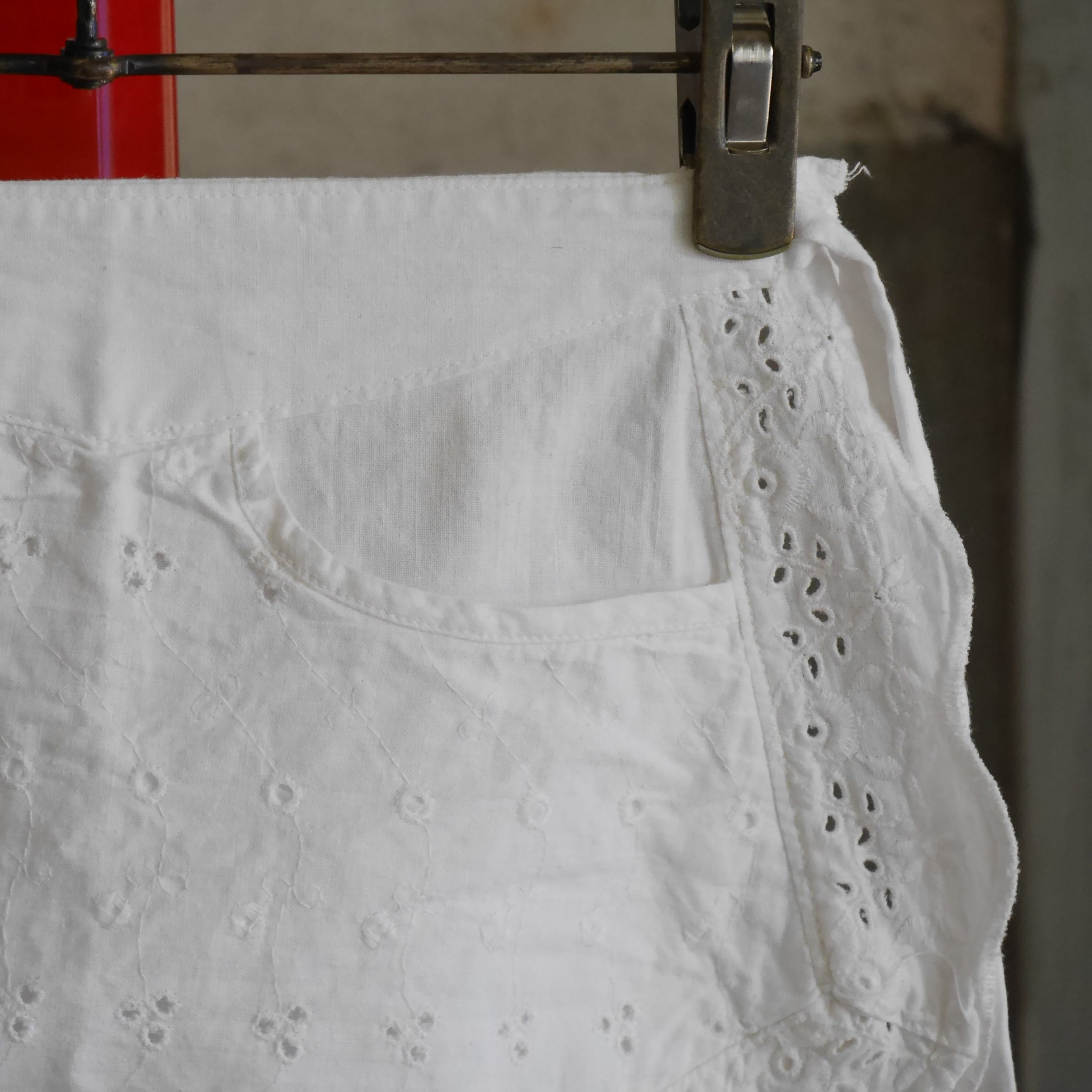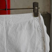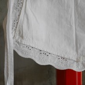 古いコットン地にお花の刺繍が施された一枚。縁のスカラップとフロントポケット部分とでお花の刺繍パターンが異なっていたり、葉モチーフ部分は穴があり透け感があったりと細部までこだわりを感じられるデザイン。スカラップの幅も太めでしっかり存在感があるのも魅力的です。