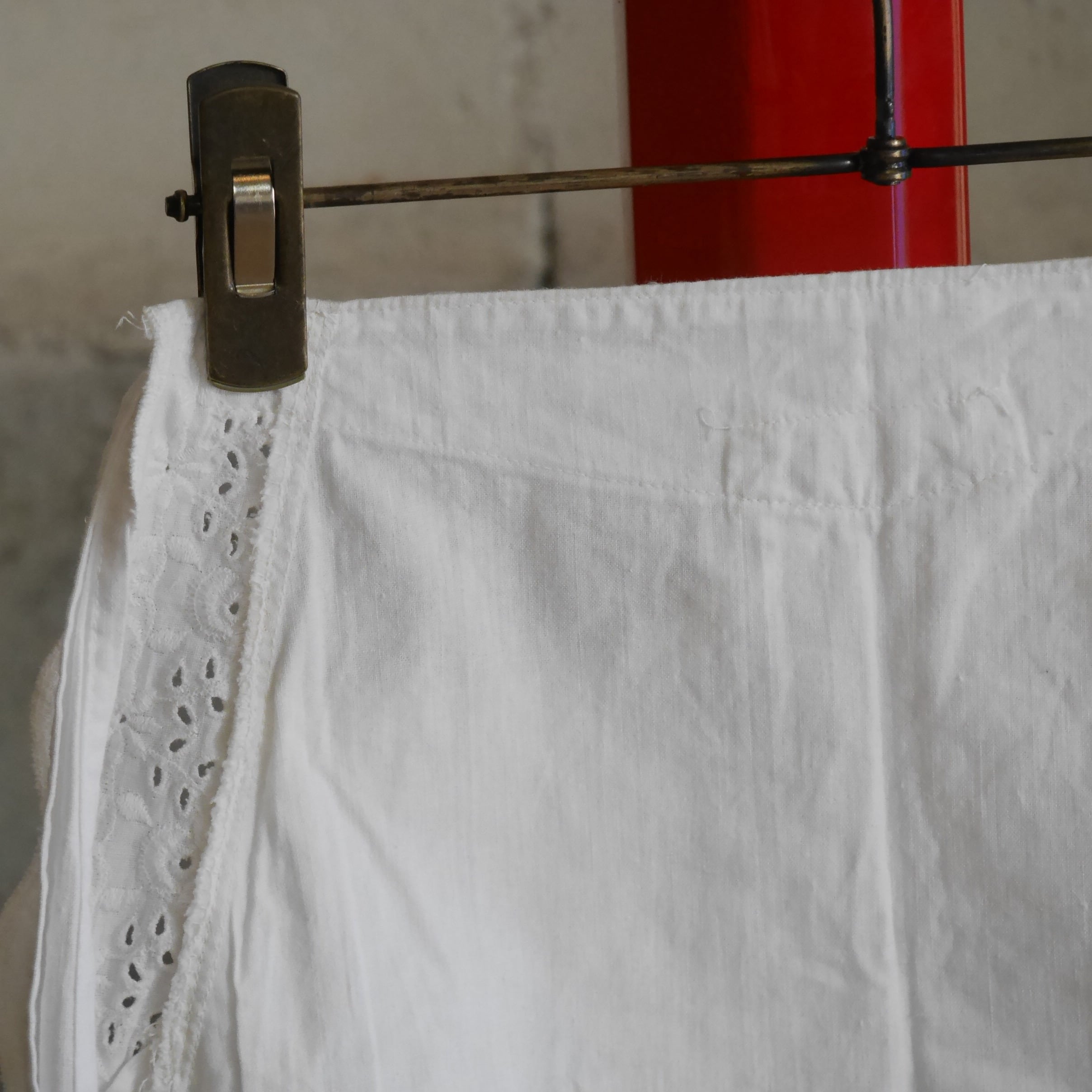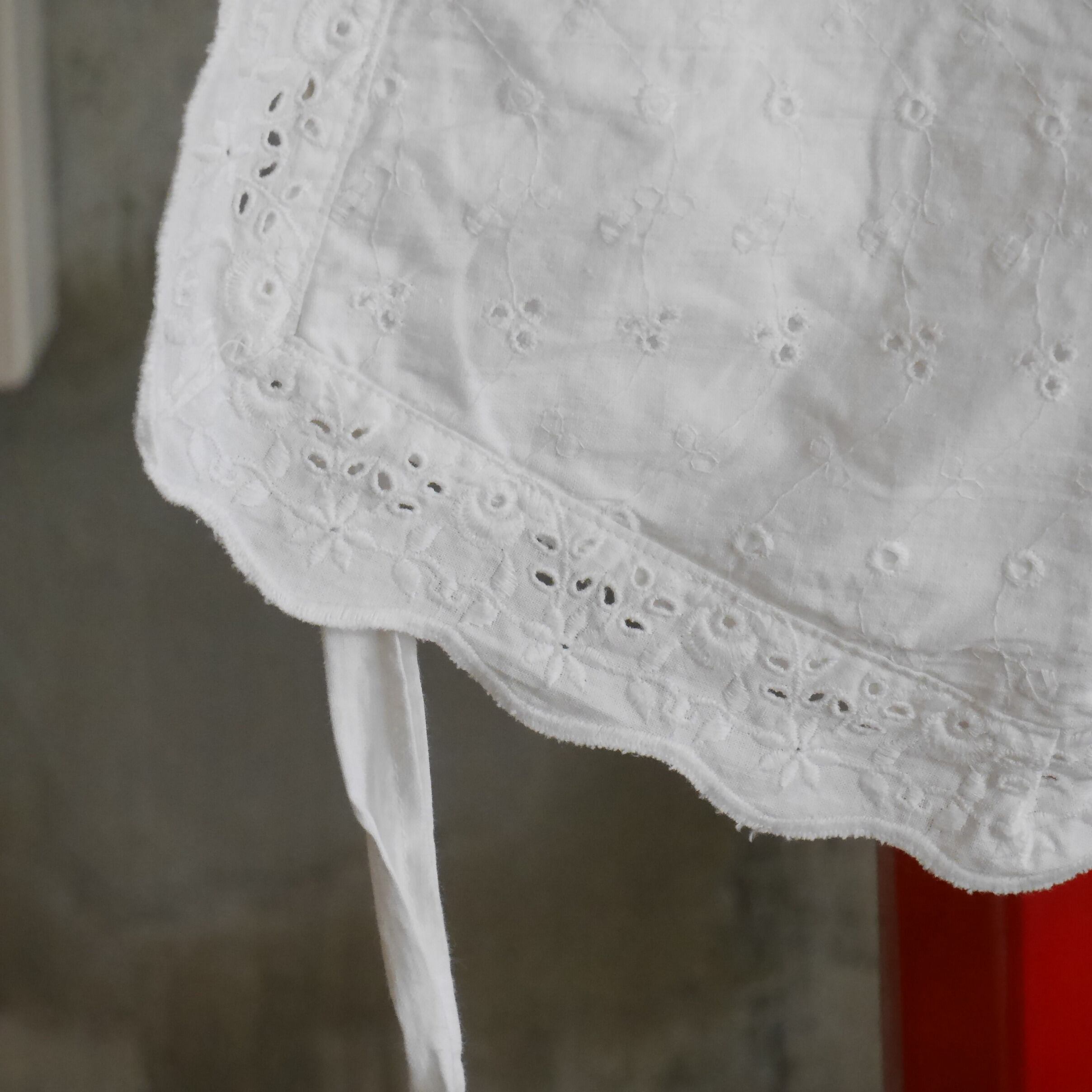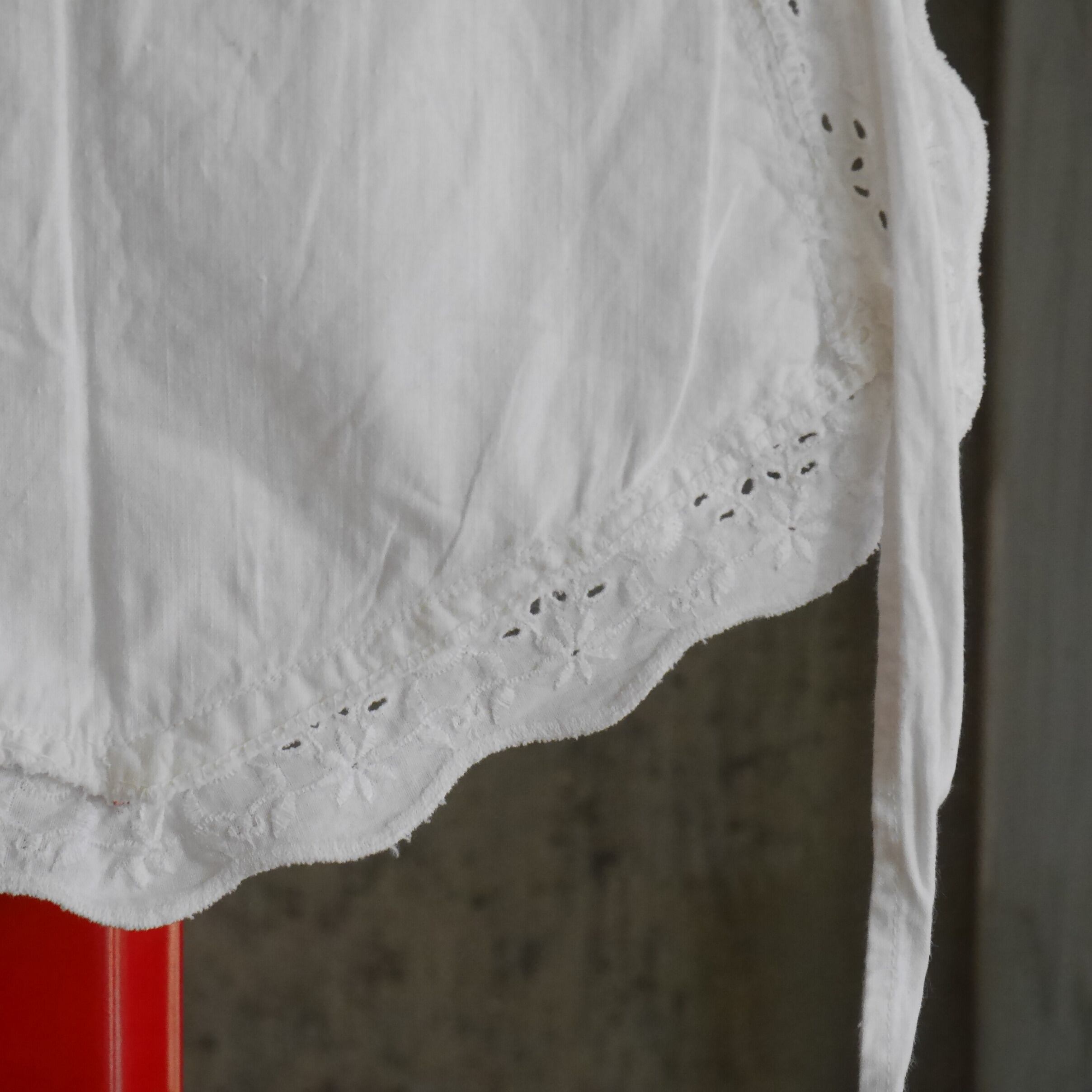 古いコットン地にお花の刺繍が施された一枚。縁のスカラップとフロントポケット部分とでお花の刺繍パターンが異なっていたり、葉モチーフ部分は穴があり透け感があったりと細部までこだわりを感じられるデザイン。スカラップの幅も太めでしっかり存在感があるのも魅力的です。
