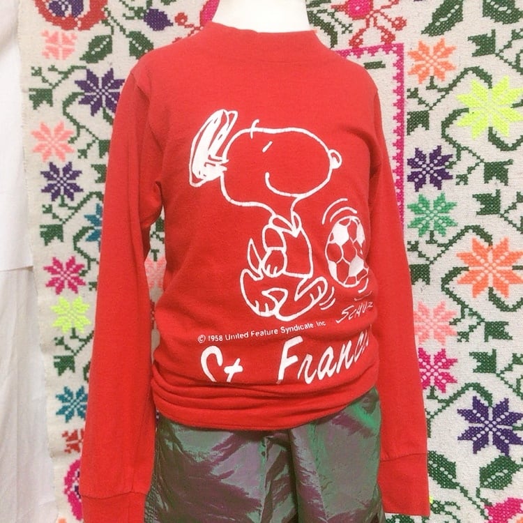 赤ベースのボディに白プリントとかなりシンプル!大人古着さながらのカッコ良さなんだけど、スヌーピーの可愛らしさもあるという絶妙なバランスが良きですね ○° 可愛らしさよりもカッコ良さ・シンプルさを求める方に大変オススメしたいキャラものアイテムです!