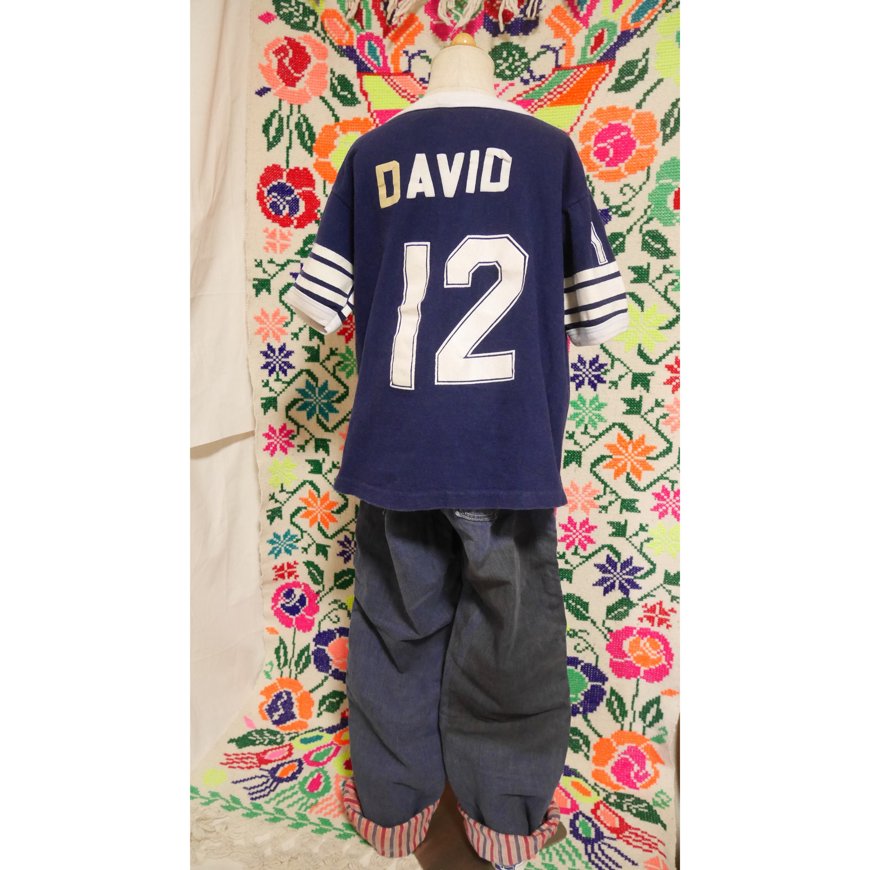 ネイビーボディに白のリンガーとロゴプリントとシンプルなナンバリングtee。バックにはフロッキープリントで名前あり!変色した「D」は恐らくフロッキーが剥がれて残った糊の跡かなと思います。