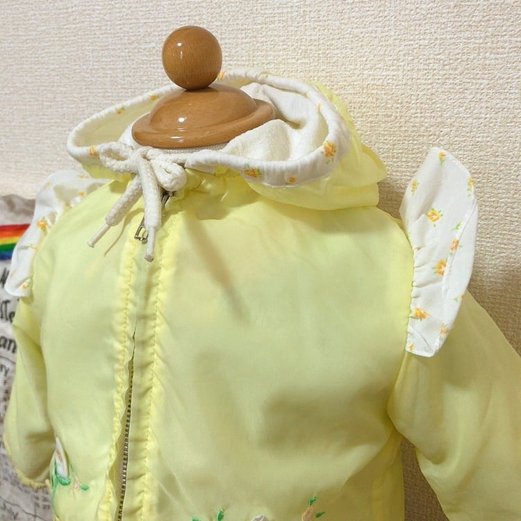 パステルイエローのボディに花柄のフリルが清楚感あって可憐なアイテム ❁°. ポケットには肩のフリルと同じ生地で作られたお花がとても気品溢れていて good!!!ボディのナイロンもすごくスベスベして柔らかいので質も良い気がします…!!!
