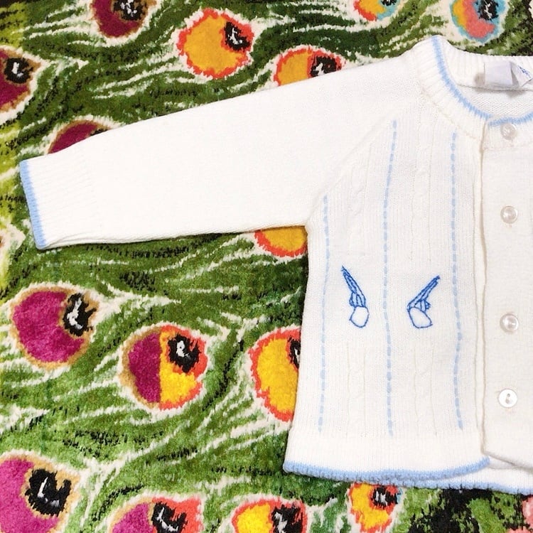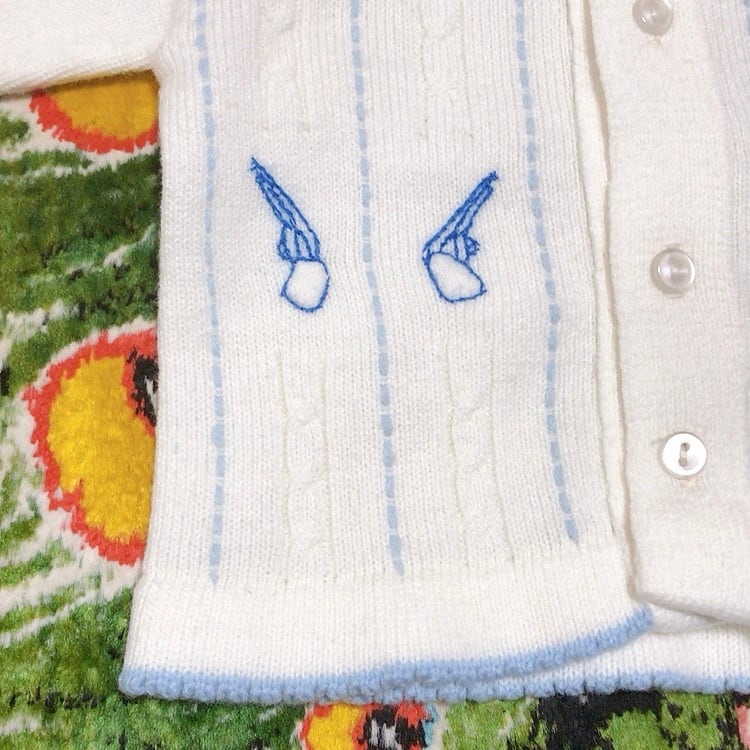 白と水色の優しさ溢れるカラーリングがベビーにぴったり!そんな優しい雰囲気にうまく溶け込んでいる銃の刺繍!急にハード!笑