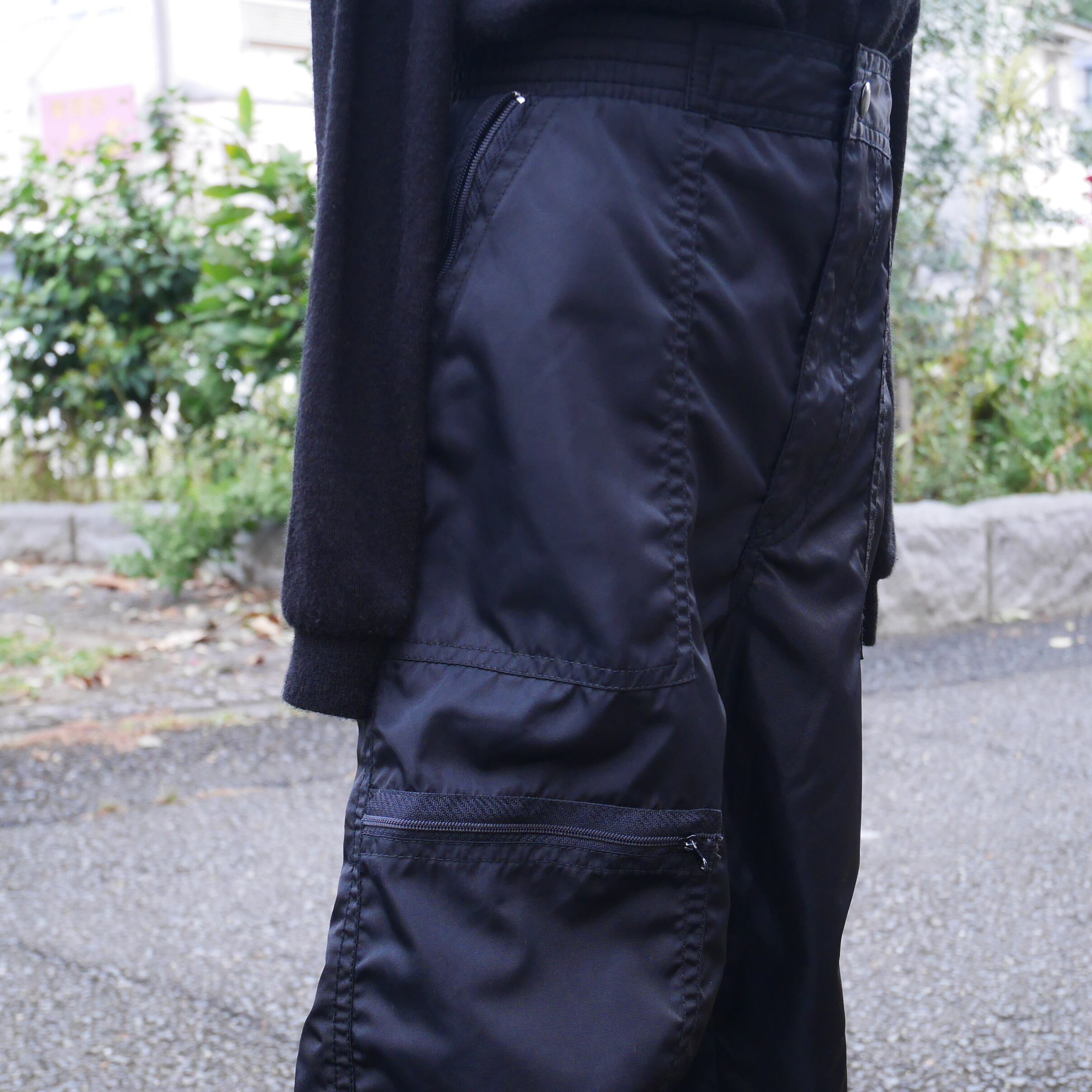 ブラックなのでお写真じゃ分かりづらいですが至る所にポケットがあるんです!!!それも左右アシンメトリーになっており、それが絶妙なバランス。裾にもジップがあり、閉めるとちょっとテーパード気味に。開けるとストレートなシルエットになります。