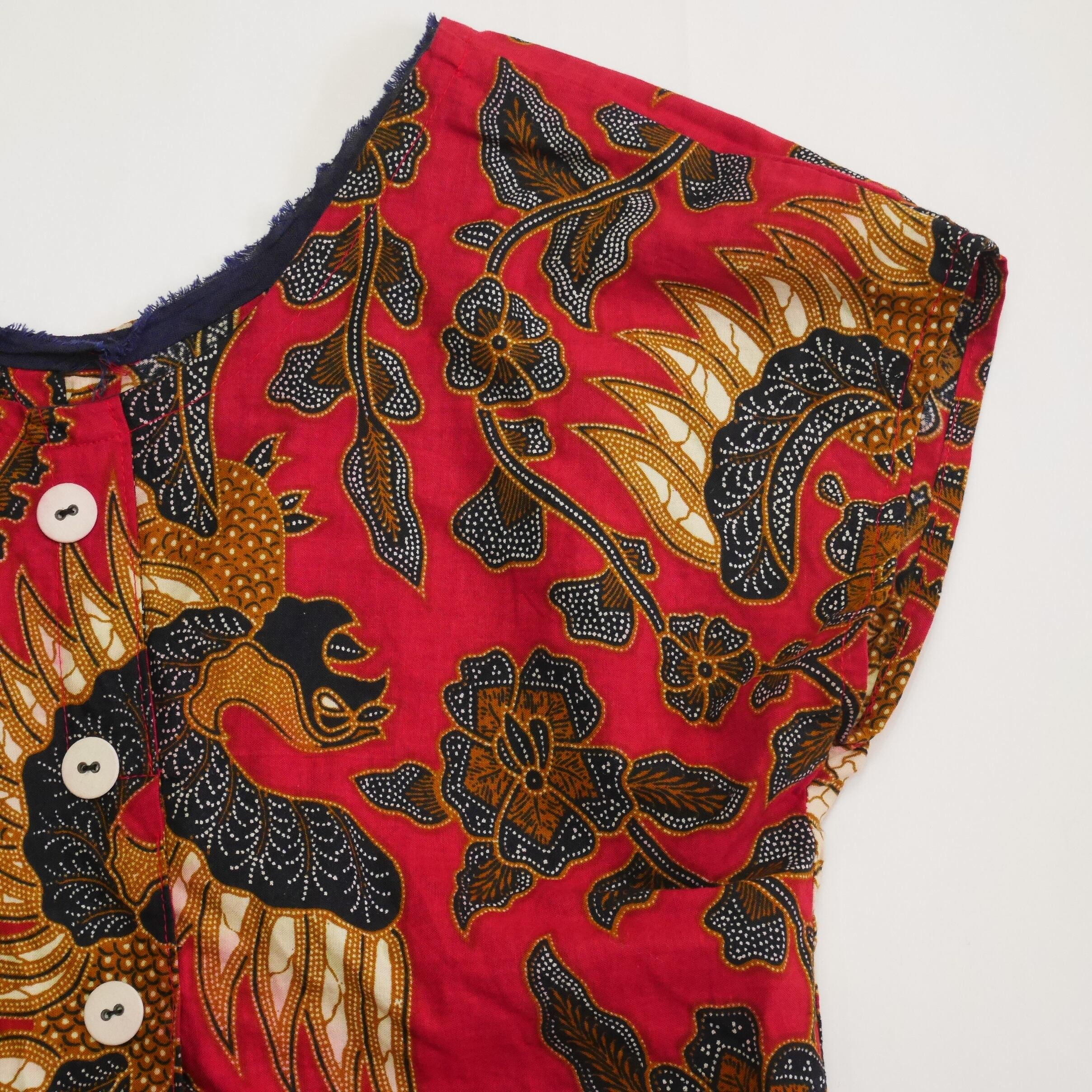 こちらフロントにボタンがありますが実はフェイク!!飾りで付けられたものなのでプルオーバータイプのトップスです!!ボタンが使えるかのように生地を重ねて高さを付けてあるので普通に騙されます。笑 逆手にとればそこまでこだわってつくられているんですよね〜。