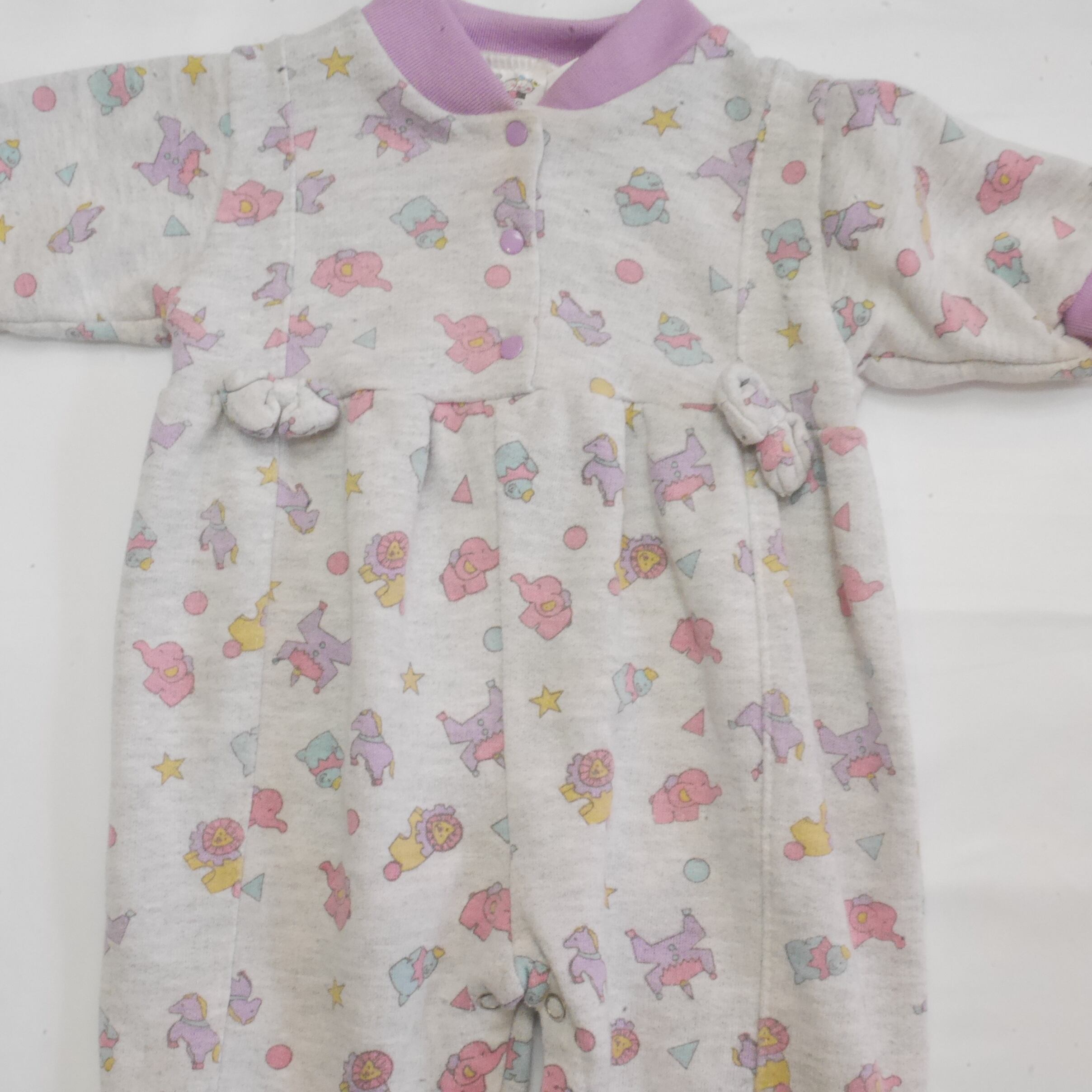 動物やピエロなどがファンシーにプリントされたロンパース。切り替え部分には同じ生地で作られた立体的なリボンモチーフがアクセントとなってgood。ゆったりとしたシルエットなので締め付け感もなく非常にリラクシーに着れます。