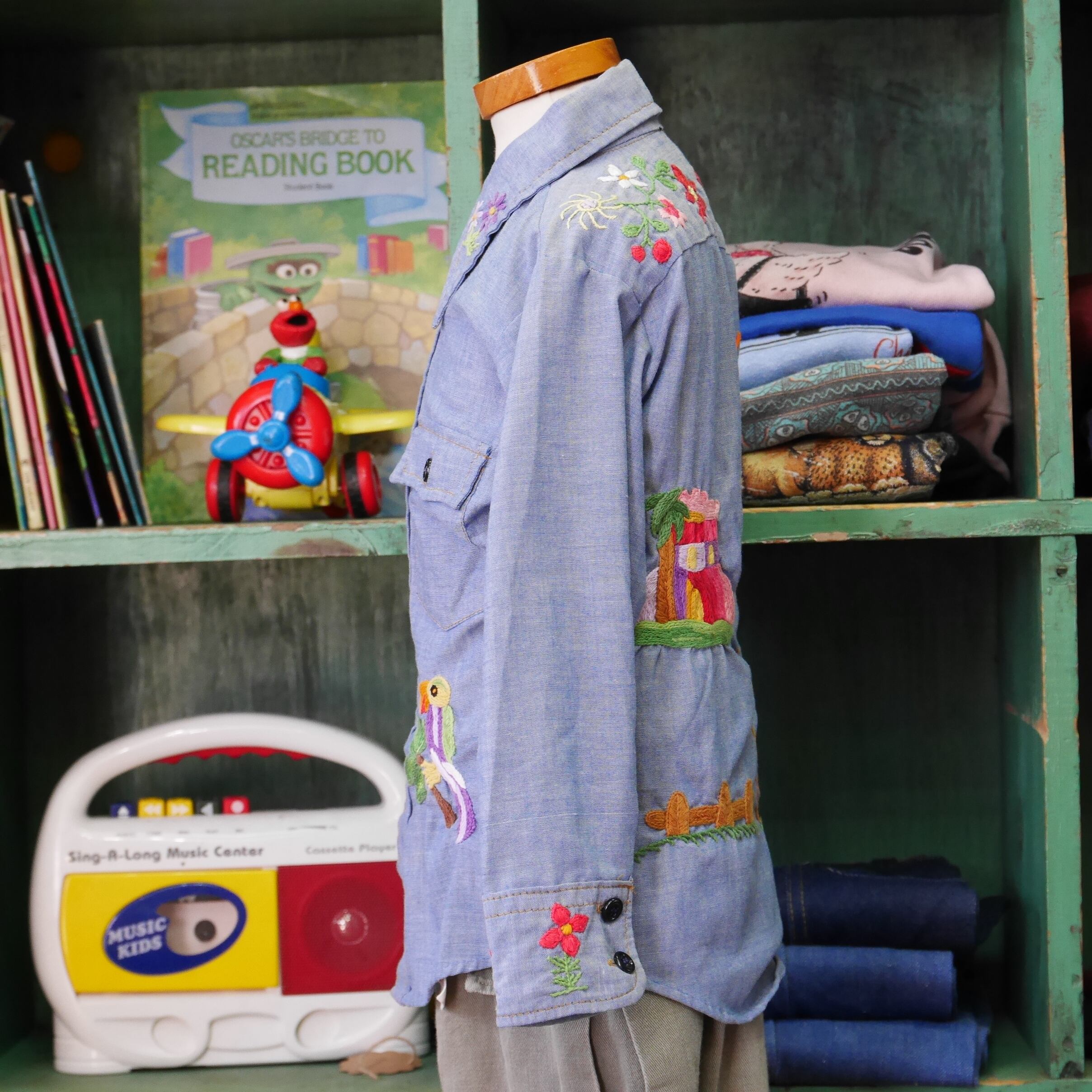 襟元、ボタン、ヨーク、袖口とどんな着こなしをしても刺繍が楽しめるような最高のバランスになっております。大人では刺繍入りシャンブレーシャツはよく見かけますがキッズサイズではなかなか巡り会えないこと、ボディがWranglerであること、刺繍バランスが最高なこと、これらを統合的に見た上で非常に希少性があると思っております。