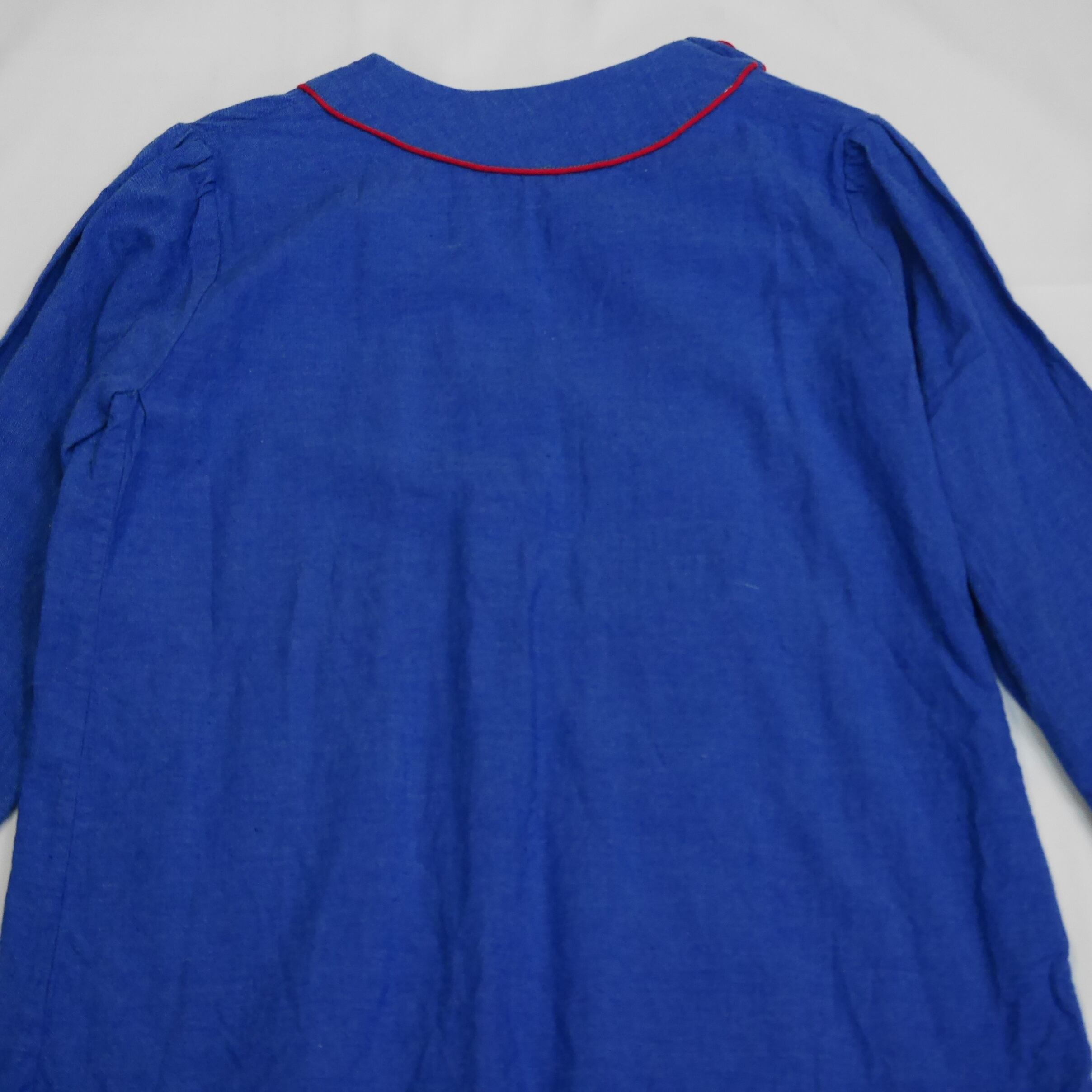 こちらは当時フランスでスクール用スモックとして着用されていたもの。ライトなインディゴに映える赤色のパイピングとボタン、真ん中から右にズレたとこから斜めに伸びたボタン穴、ポケットの波デザインのパイピングと40-50sのものに比べてデザイン性に遊びがプラスされています。