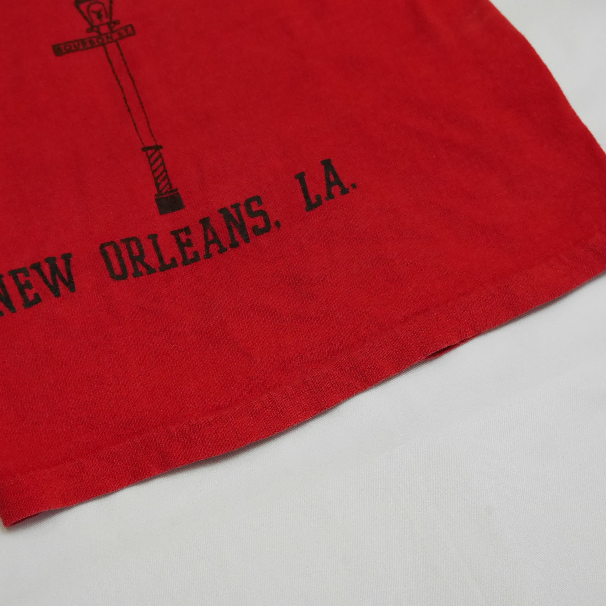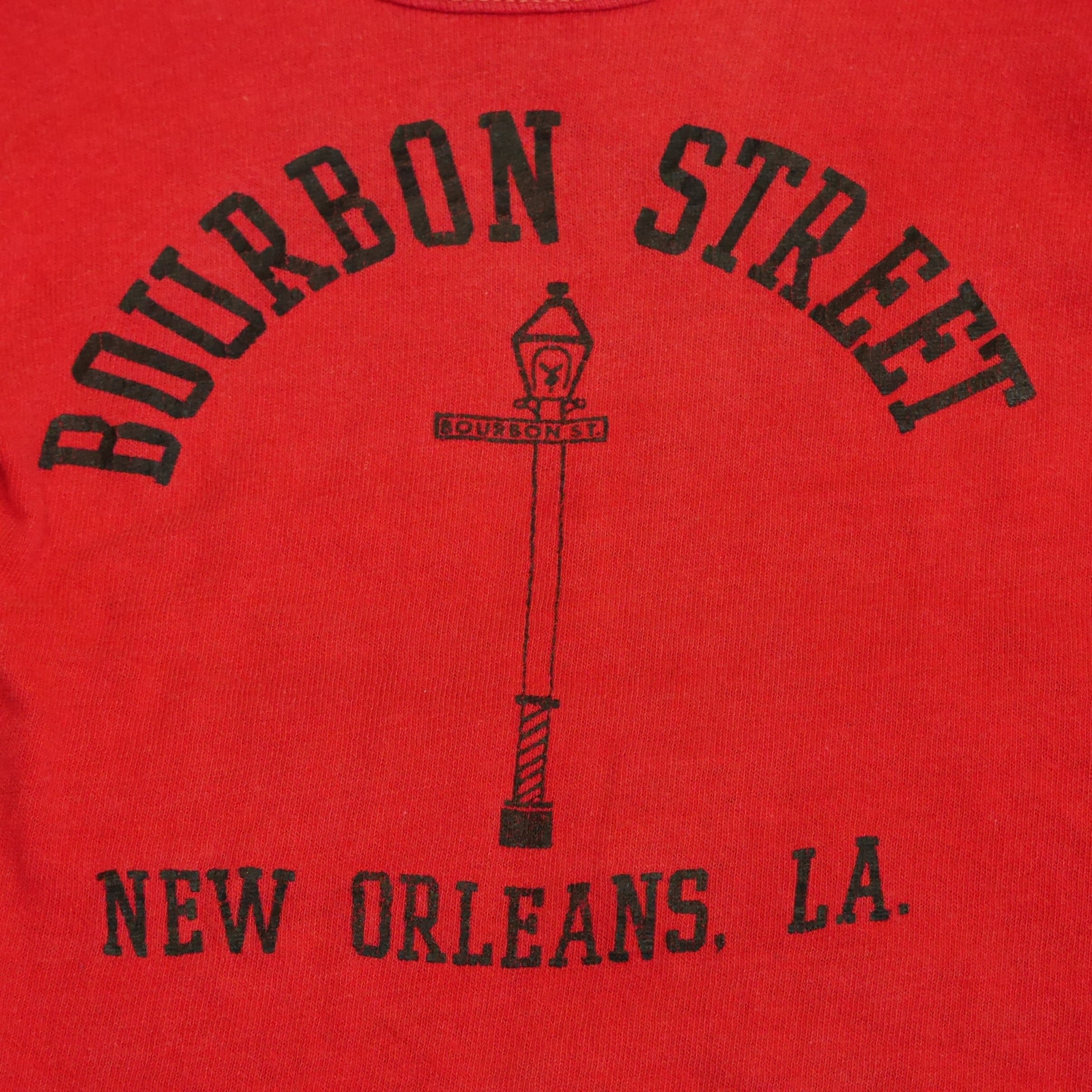 「Bourbon street」とはルイジアナ州ニューオリンズにある歴史的な通りの名称。おそらく当時のスーベニアTシャツじゃないかと思います。