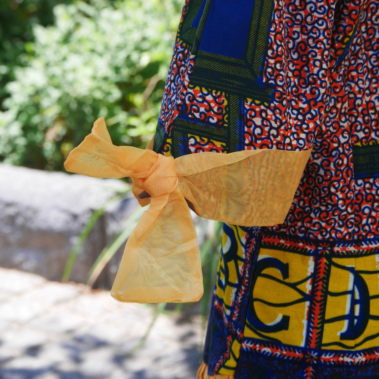 アフリカンらしい独特な柄に色合い、どこから見ても素晴らしいテキスタイルです。おそらくこちらは伝統的な「蝋染め」ではなく「ファンシープリント」のアフリカン布だと思うので年代も1980〜1990年代頃とアフリカンバディックにしては年代が浅いものと考えられます。だからこそシアー生地を用いたフリルやリボンなど現代にもマッチするデザイン性が施されており非常にお洒落な一枚。