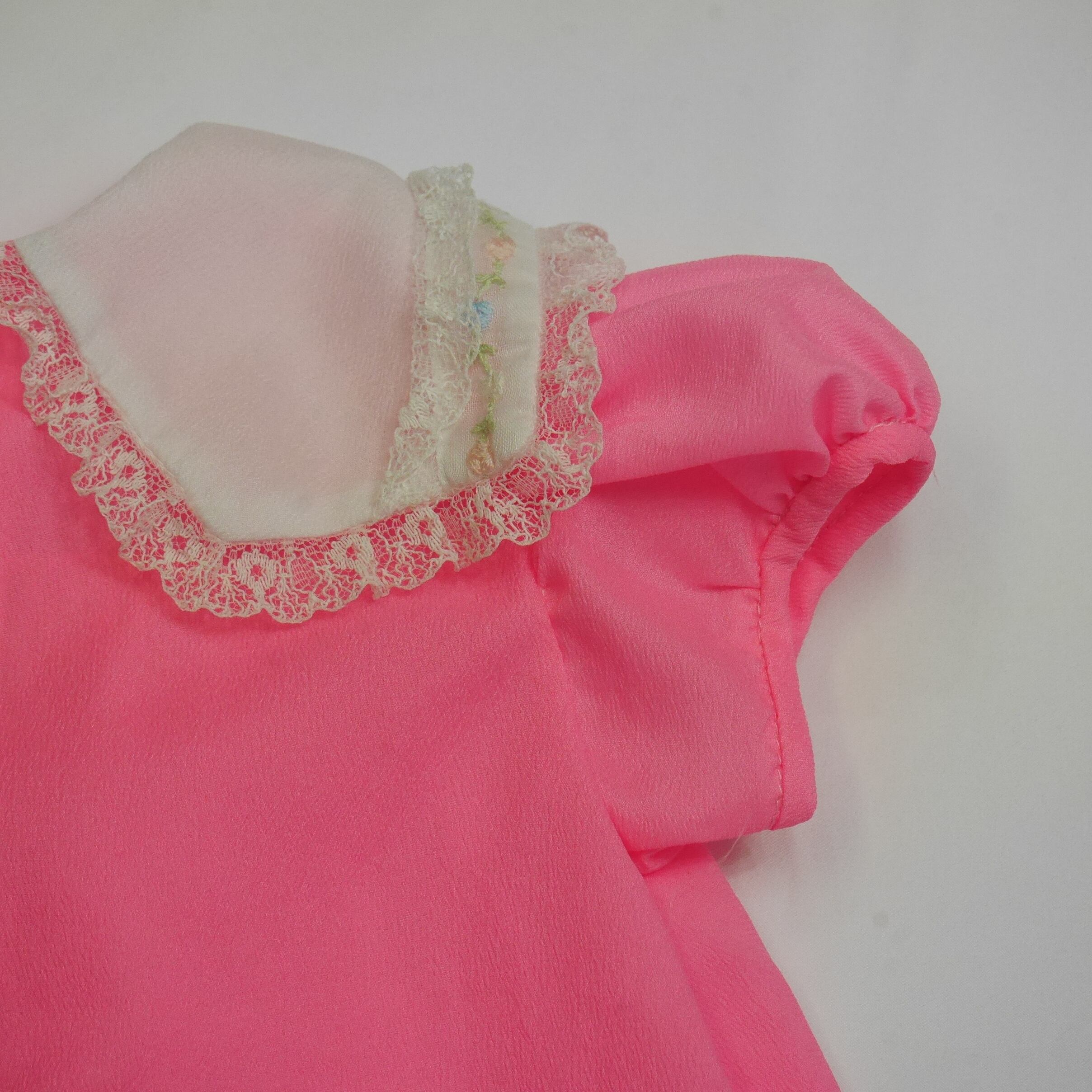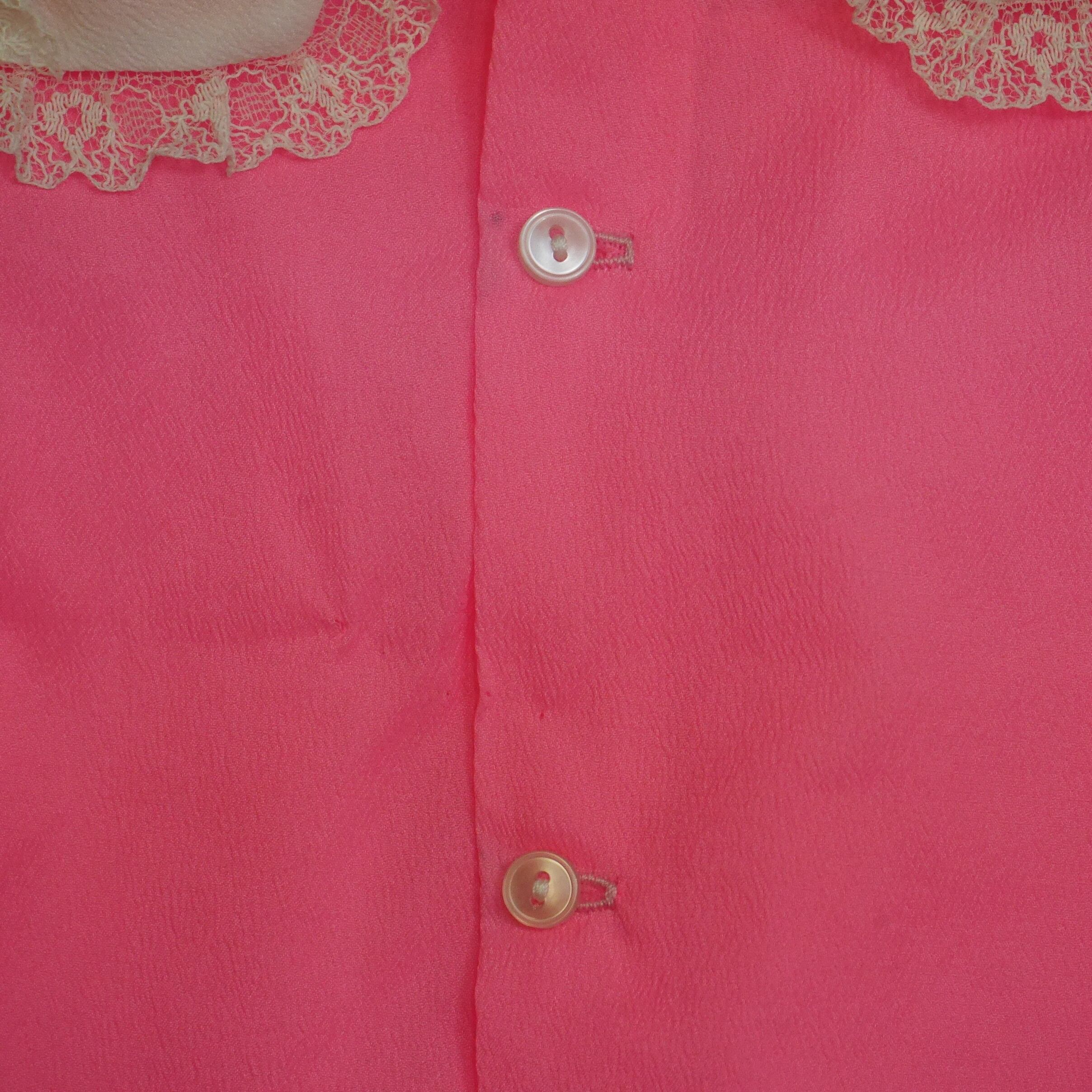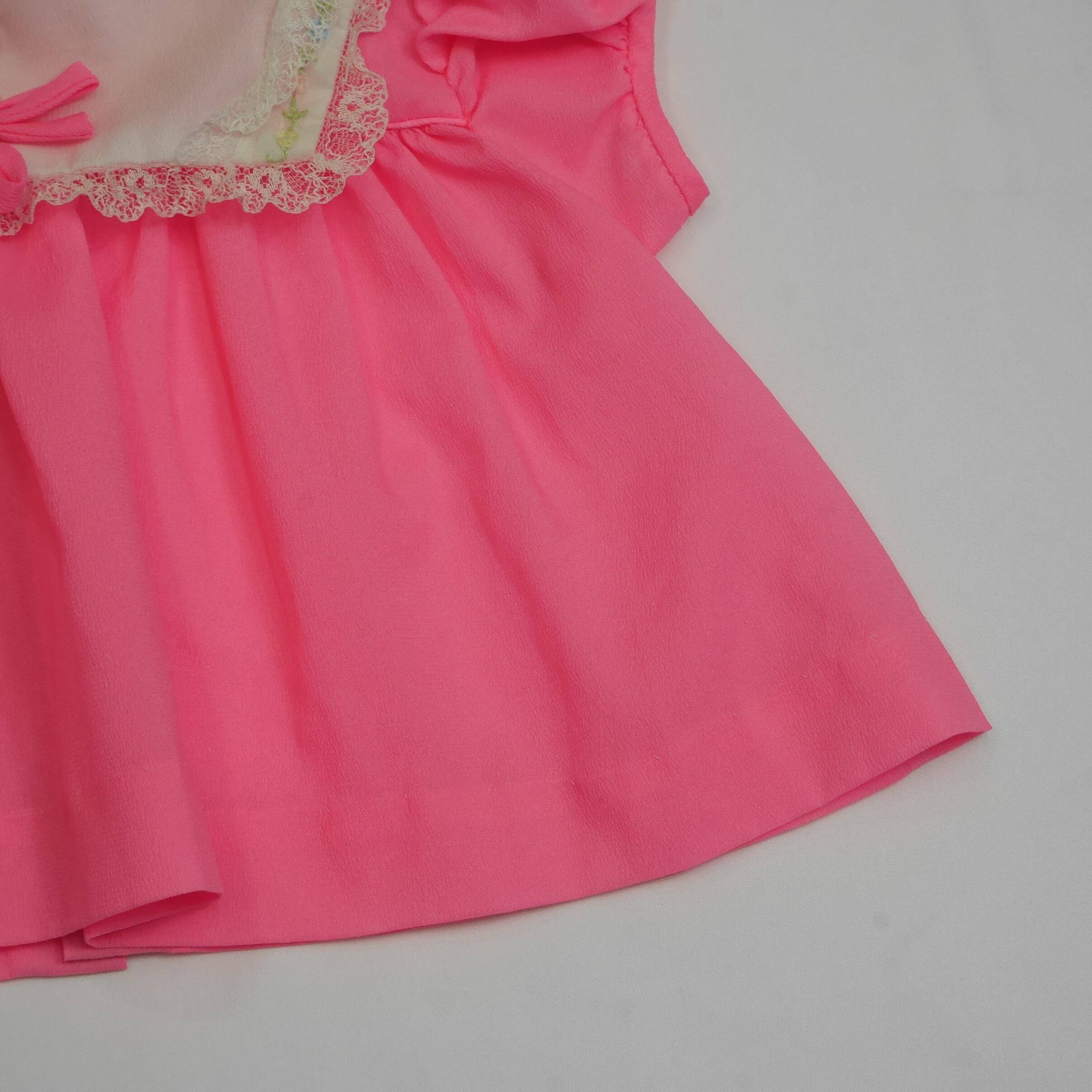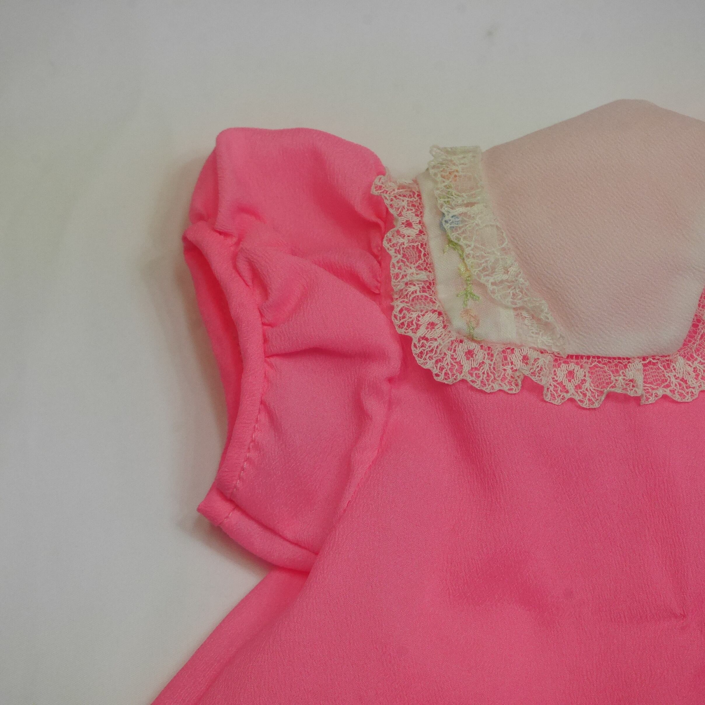 ネオンカラーのピンクが非常にインパクト残りますね。この色味だけでなく、大きな襟も、そこに施されたレースもリボンも非常に可愛いです。飾りでつけられたボタンは猫目ボタンというところもヴィンテージ好きにはたまらないですね。