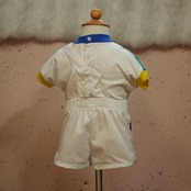 ホワイトベースに赤と青のマリンカラー(トリコロールカラー)が非常に爽やかな一枚。トラックショーツのようなスリットが入ったデザインや背中が開けたクロス状の肩ベルトなど一般的なOshkoshのショートオールとは少し違ったデザインも特徴です。おそらく夏を意識したディテールなんじゃないかと思います。