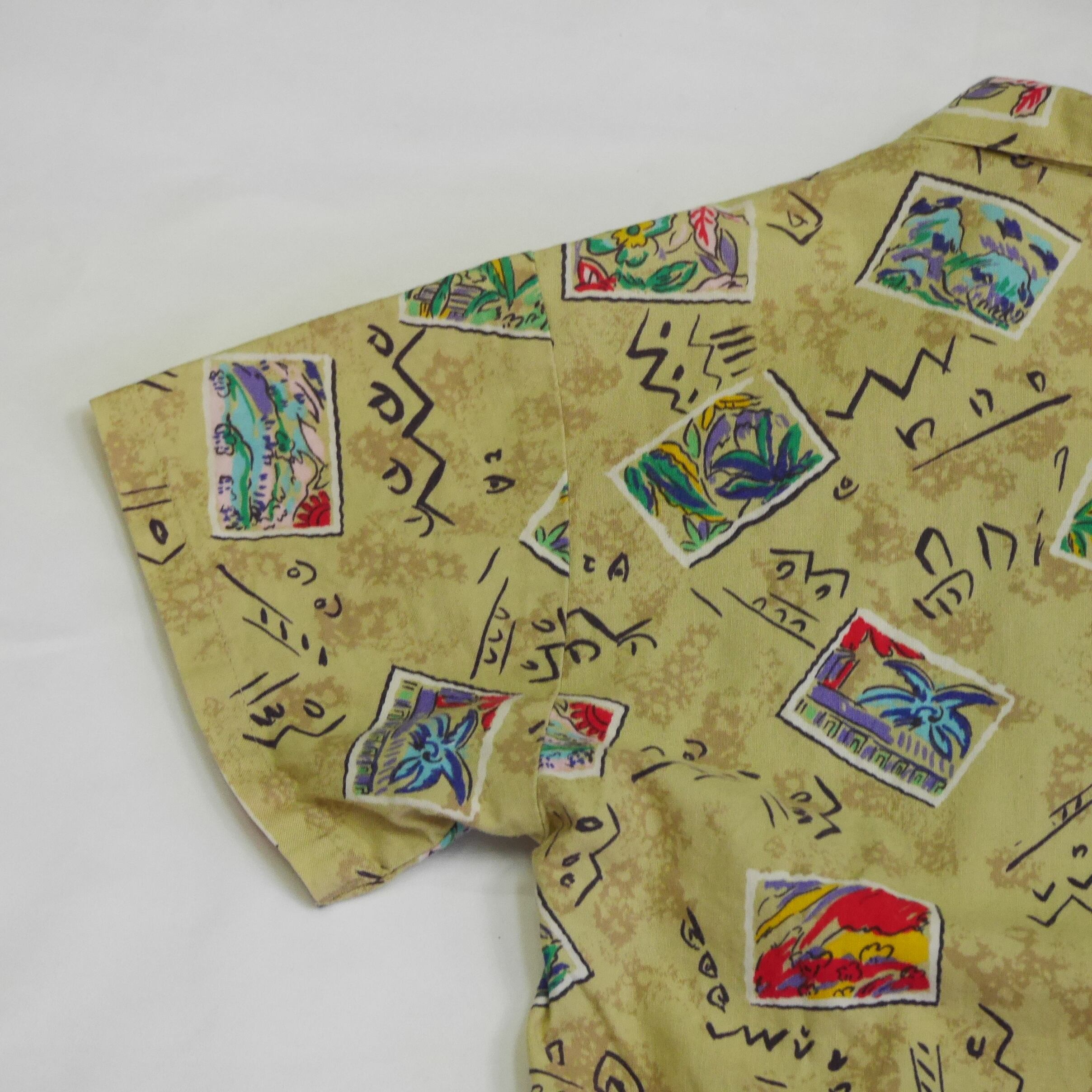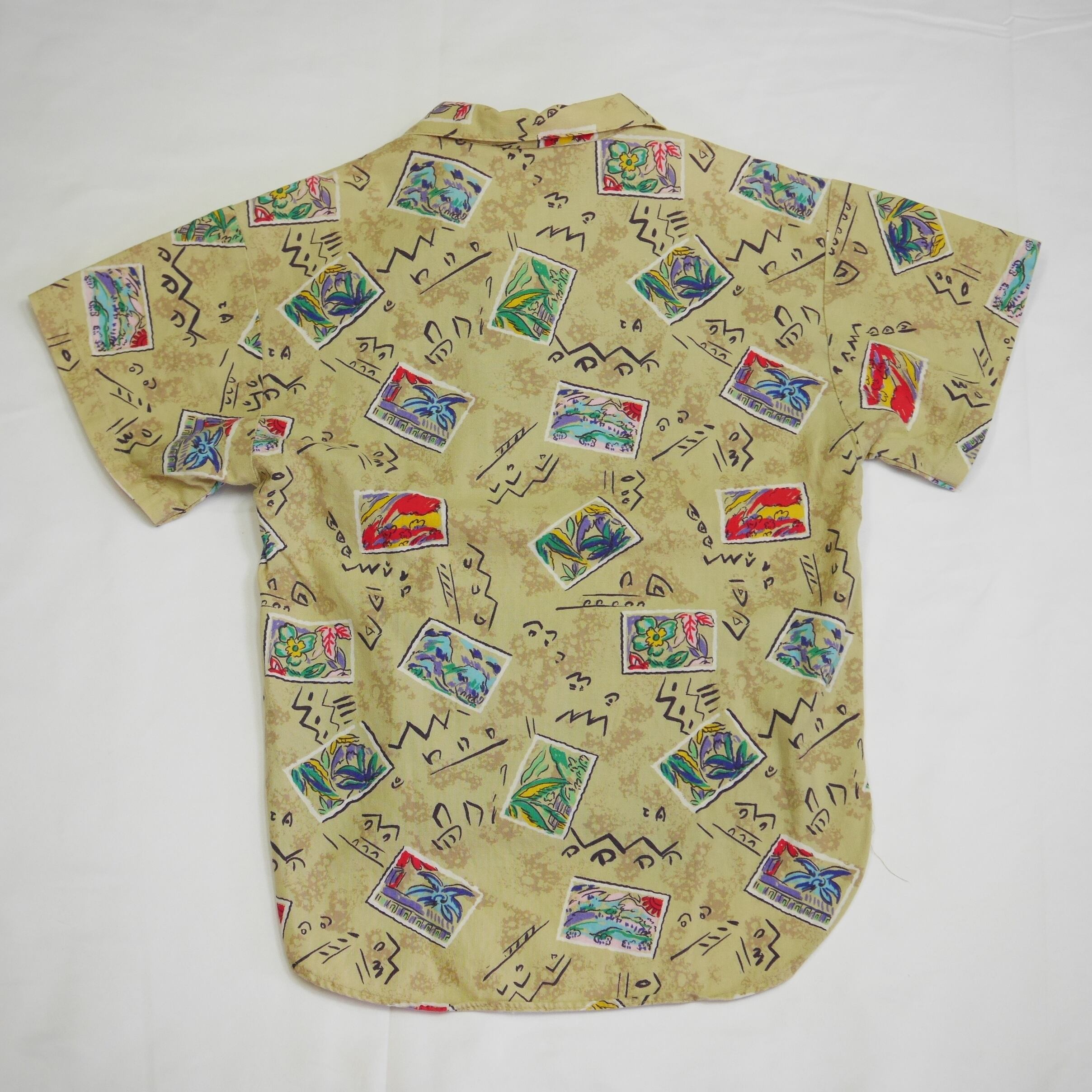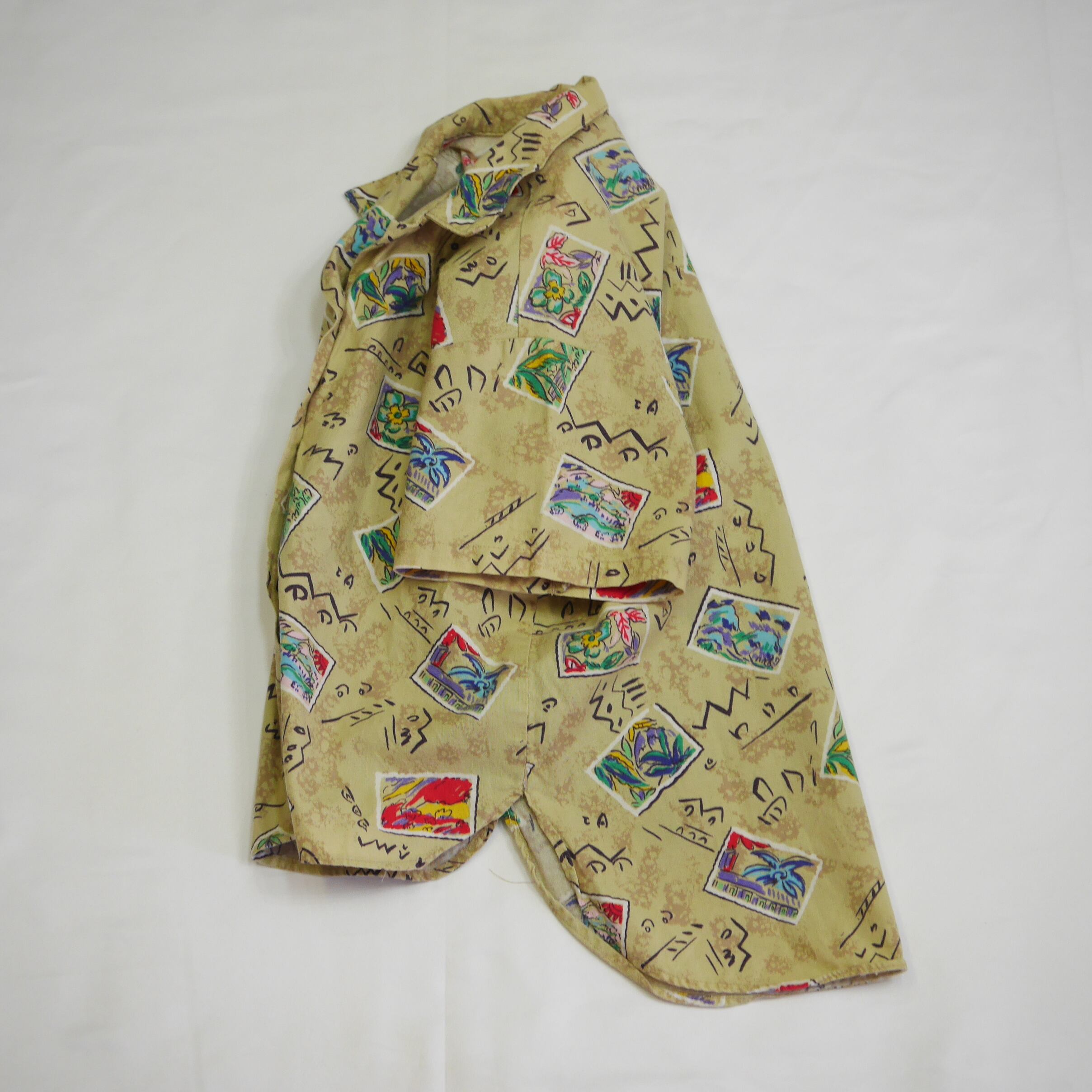 お花がモチーフとなった柄なんですが、写真で収めたものを絵っぽくしているという少し変わったデザインが非常に魅力的な一枚。ベーシックなボディとオープンカラーなところも相まってハワイアンシャツのようなリゾートチックな雰囲気も感じられます。ウッド風のボタンもGood。