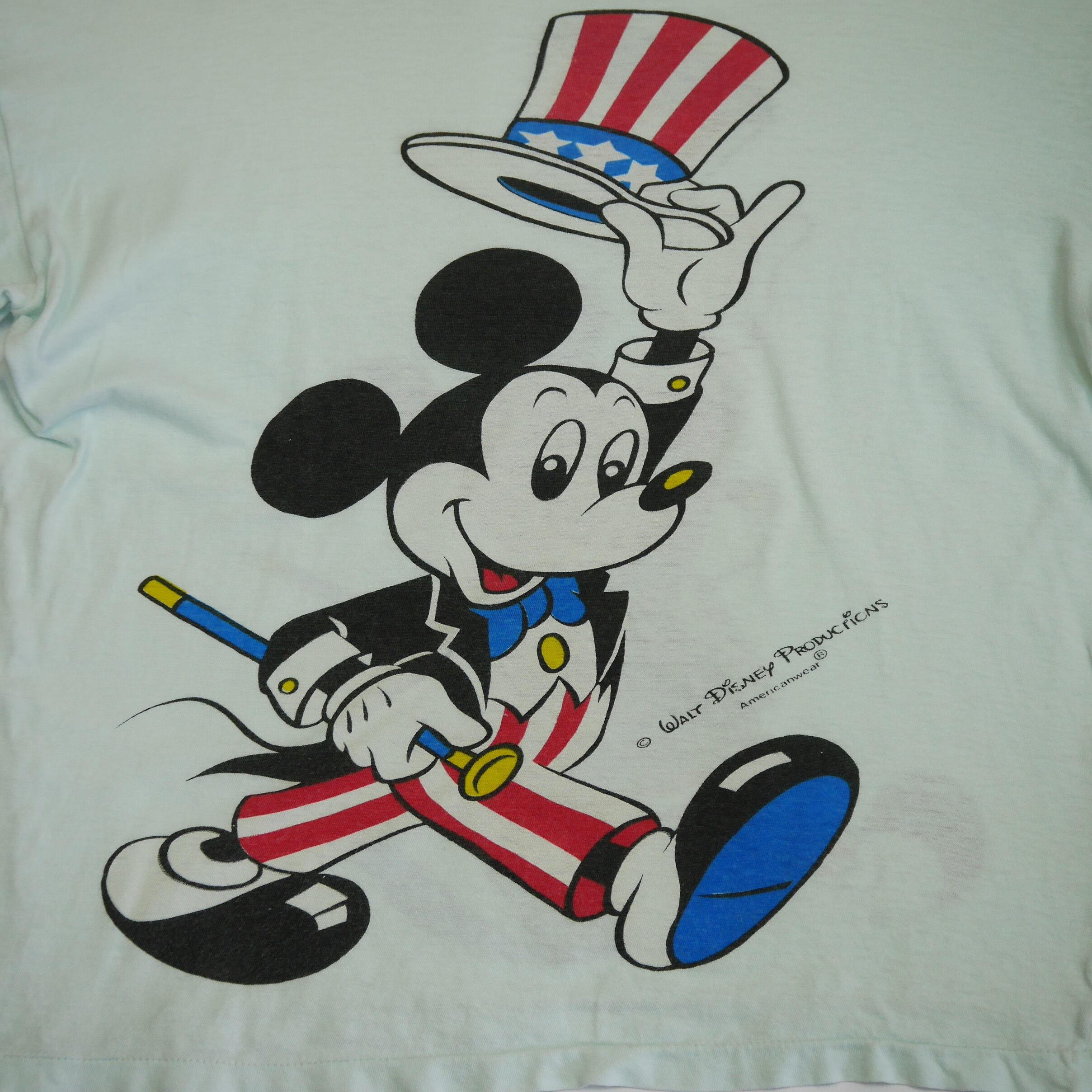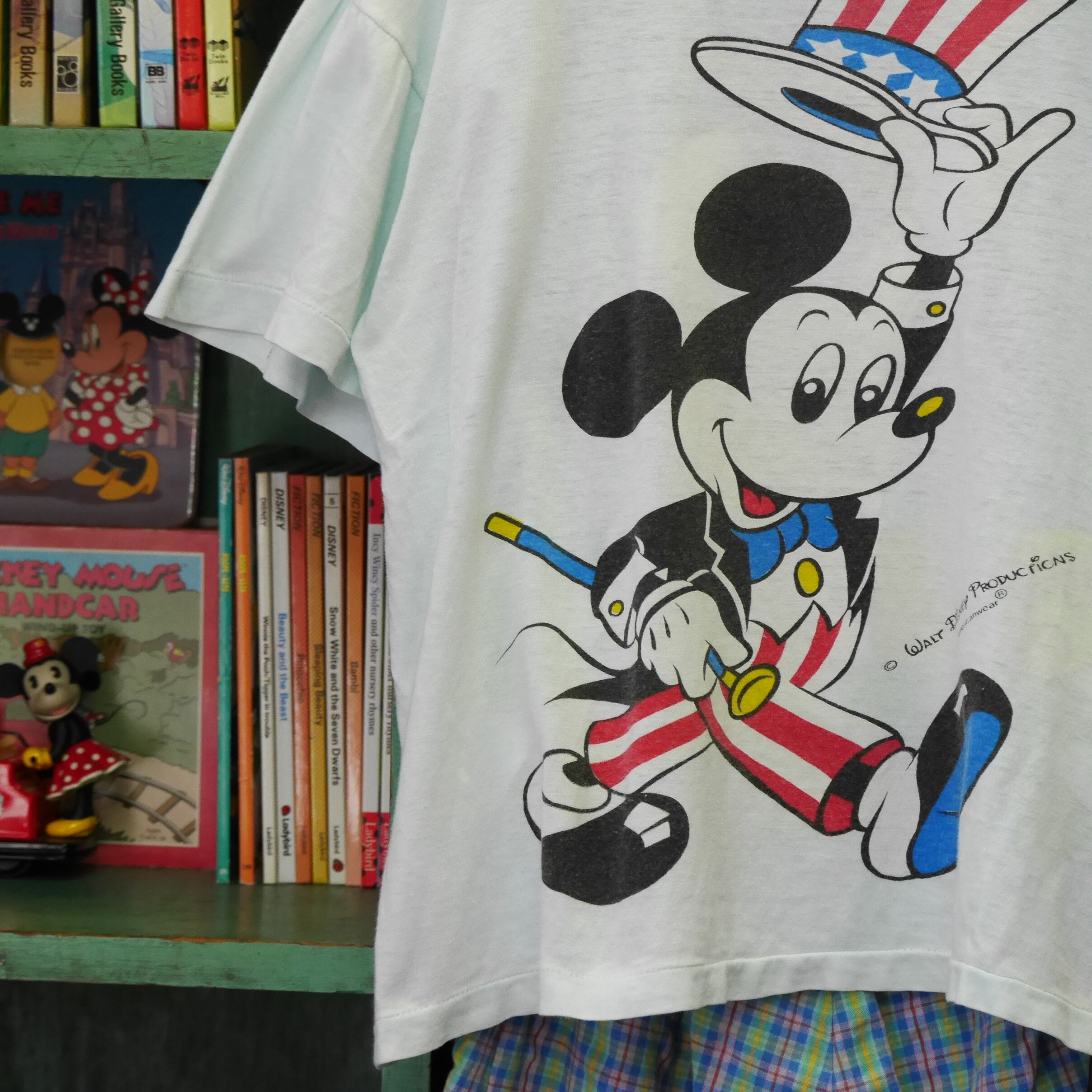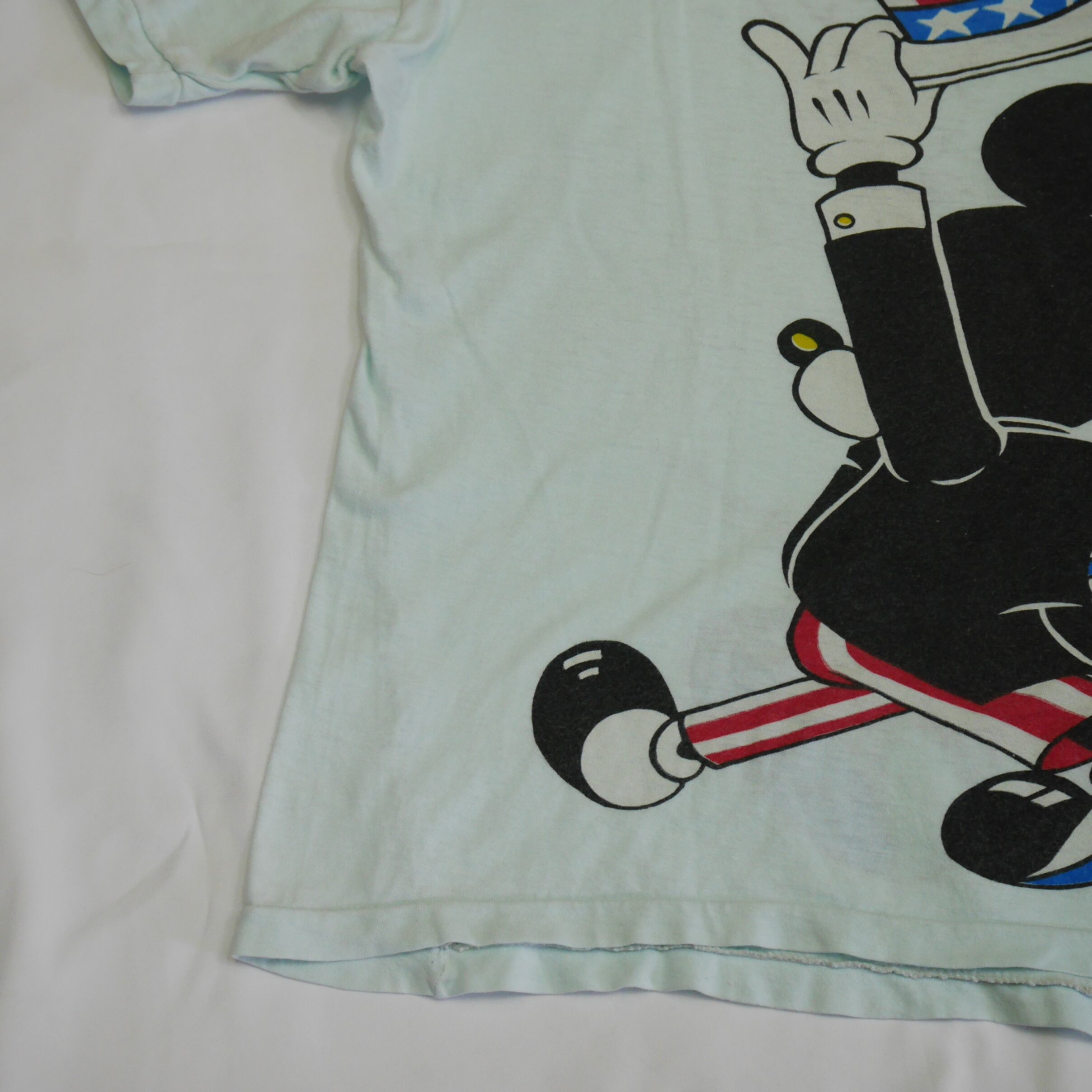 〈Walt Disney Productions〉の社名は1986年までですので1986年までに作られたもの。ほんのり水色ボディにショースタイルのミッキーが前後にプリントされた可愛い一枚です。前側は前向き、後ろ側は後ろ向きとミッキーもリンクしたデザインなのが可愛いですよね。少しレトロな表情からヨーロッパ古着かと思います。