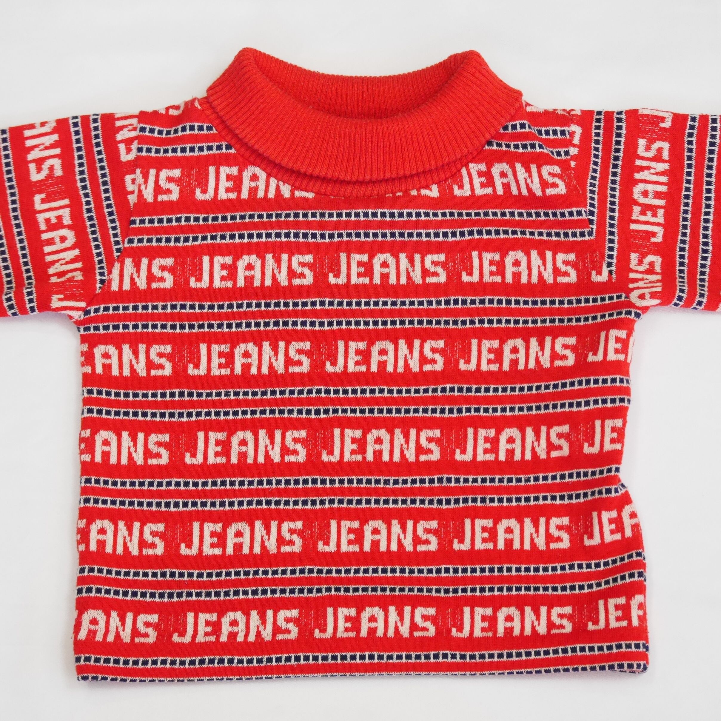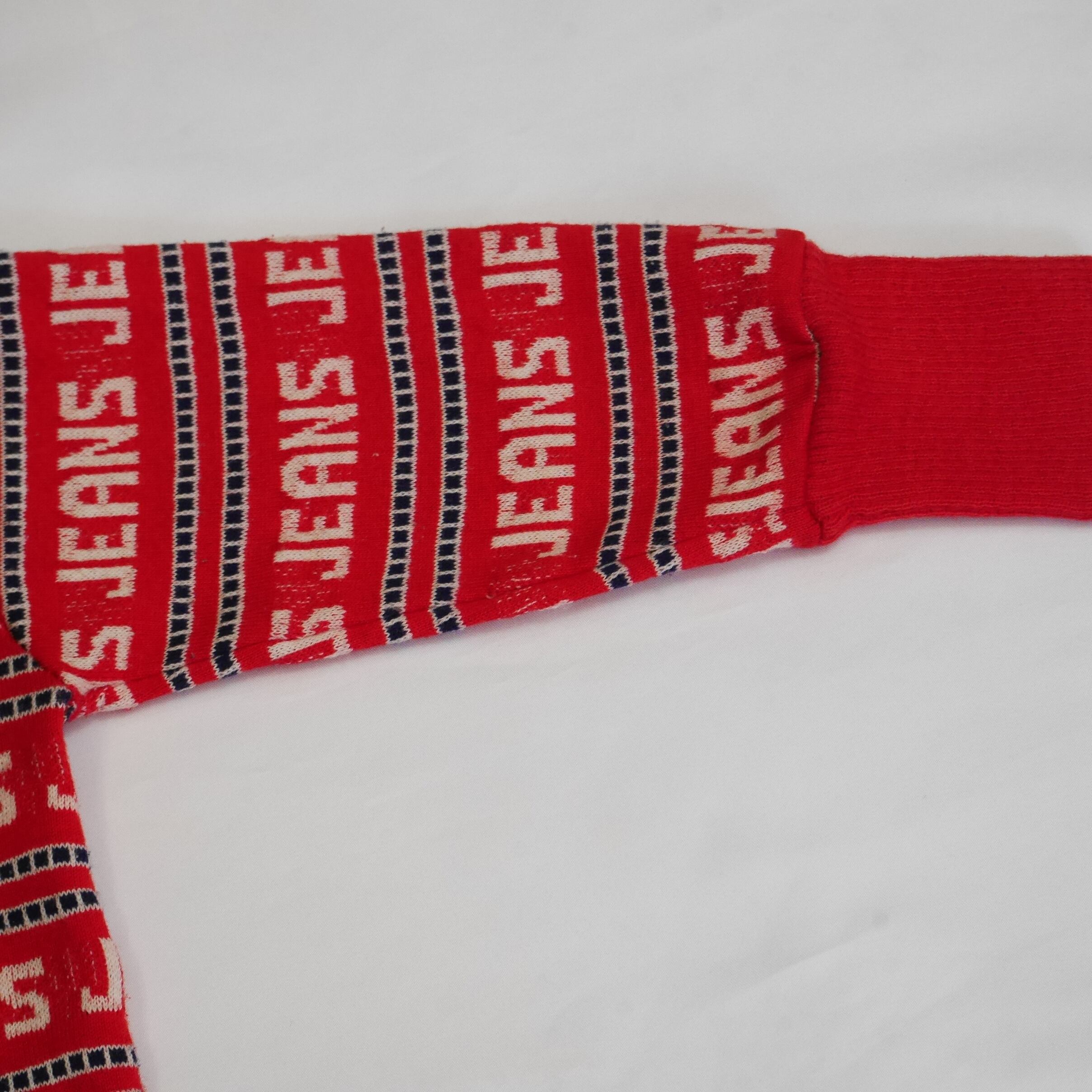〈JEANS〉のロゴがボーダー状に編まれたジャガードトップス。赤・白・ネイビーの3色使いですが総柄なだけあり非常にインパクトある一枚です。シンプルにオーバーオールのインナーに使ったり、ボトムスにタックインして着るだけで80s キッズスタイルが完成します。
