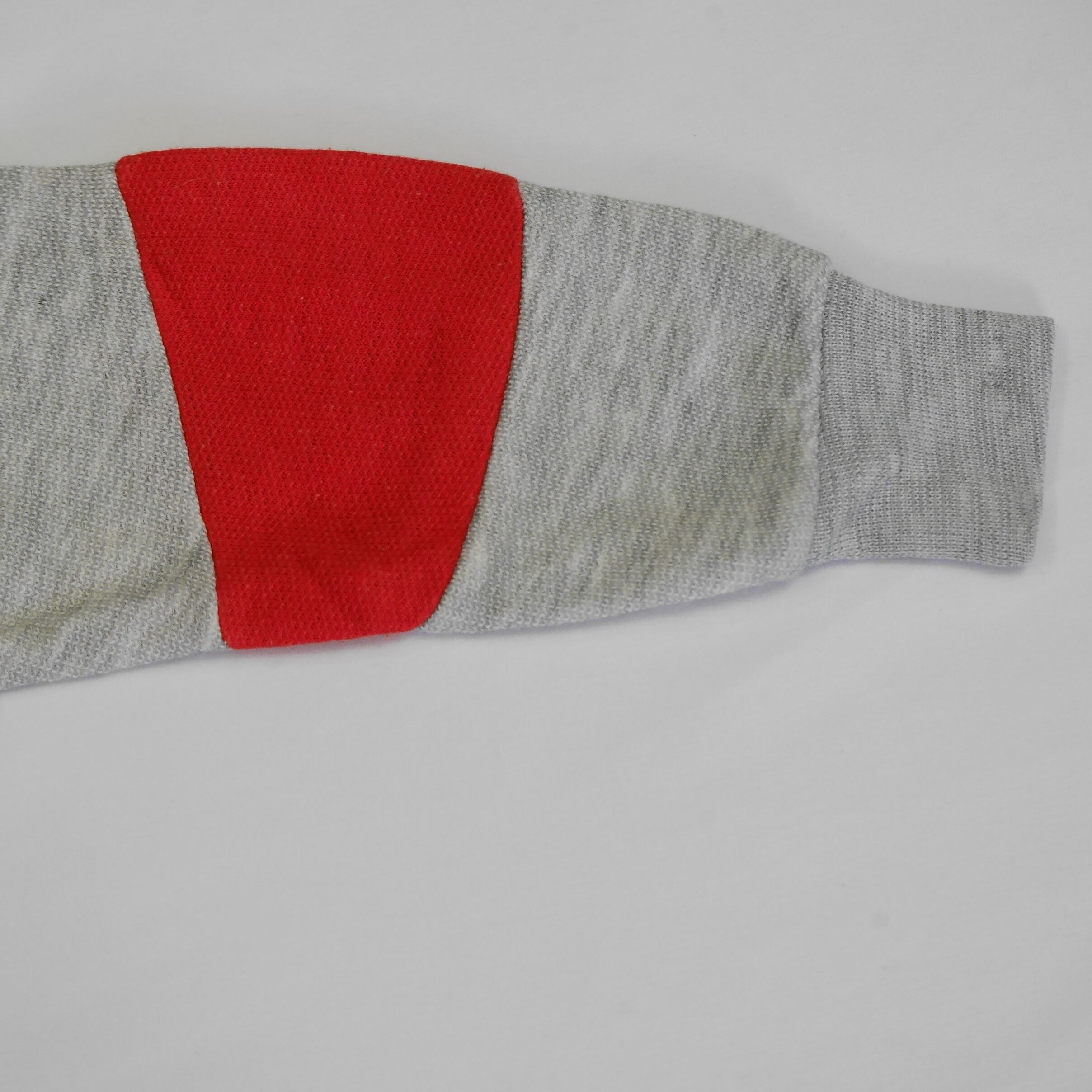 杢グレーベースに赤・青をドッキングしたデザインが特徴的なスウェット。太ボーダーかと思いきや肘、肩の部位にピントを合わせた(例えば肘だと外側にいくにつれて太くなる)デザイン性が効いてきて面白い。プリントじゃなく生地をドッキングしているので凹凸感あるのもGood。オーバーオール等合わせることが多いキッズには袖にデザインがあるのはポイント高いんじゃないかなと思います。