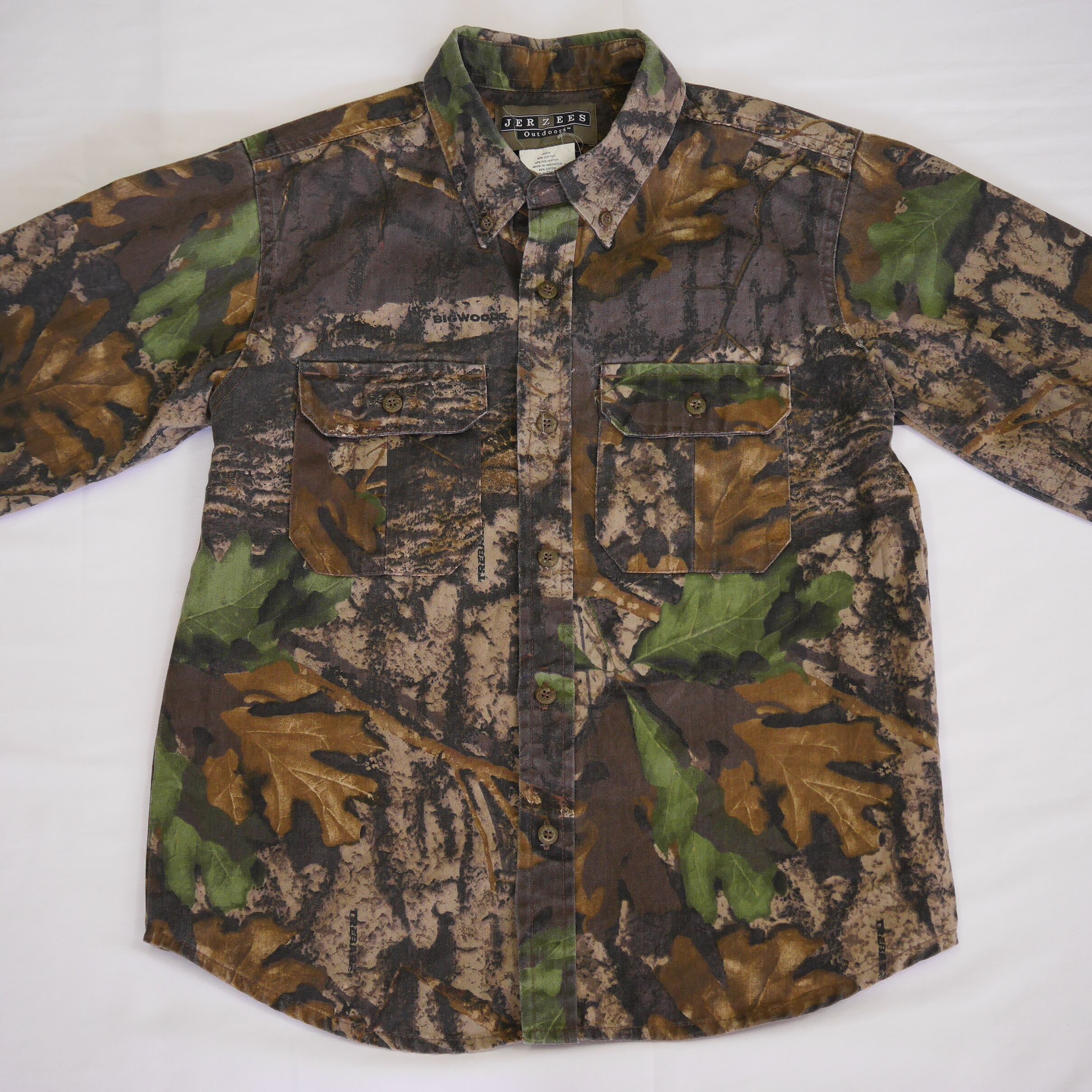 ボディブランドでも有名な「JERZEES」のアウトドアラインから出ていたカモ柄ボタンダウンシャツ。リアルツリーカモは元々ハンティング用にと開発されたもので、より自然の中に溶け込めるようにと葉っぱや木肌などの "リアル" さがこのカモの魅力。これがファッション業界に発見され90年代ストリート界でプチブームとなりました。
