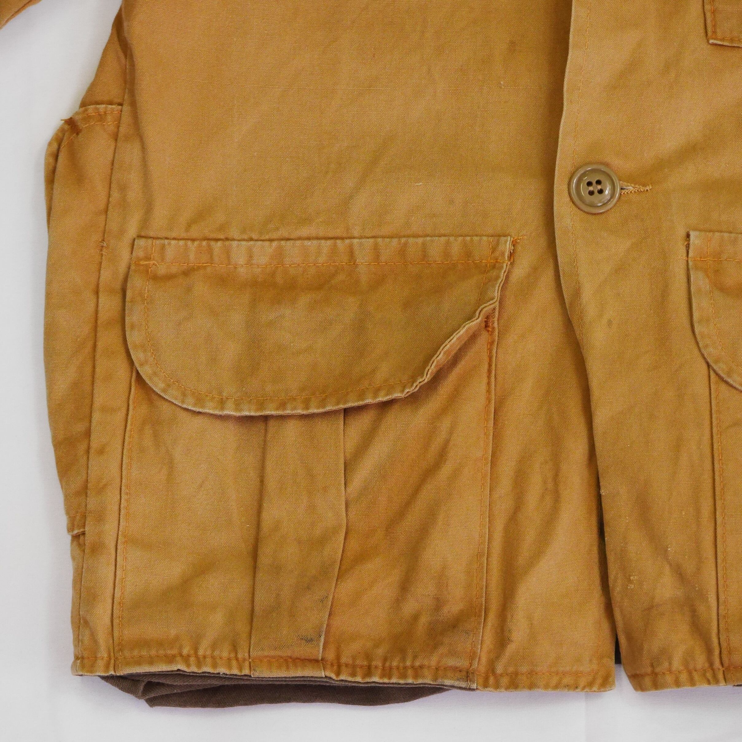 狩りを行う際に着ていたハンティングジャケット。右肩のパッチは銃を構えた時に当てる時の保護用、裾のポケットは銃弾を入れる用、サイドポケットは裏地側へと続いており、獲物を入れる用の大きなゲームポケット等ハンティングならではのリアルなディテールが逆に魅力さを増している一枚です。