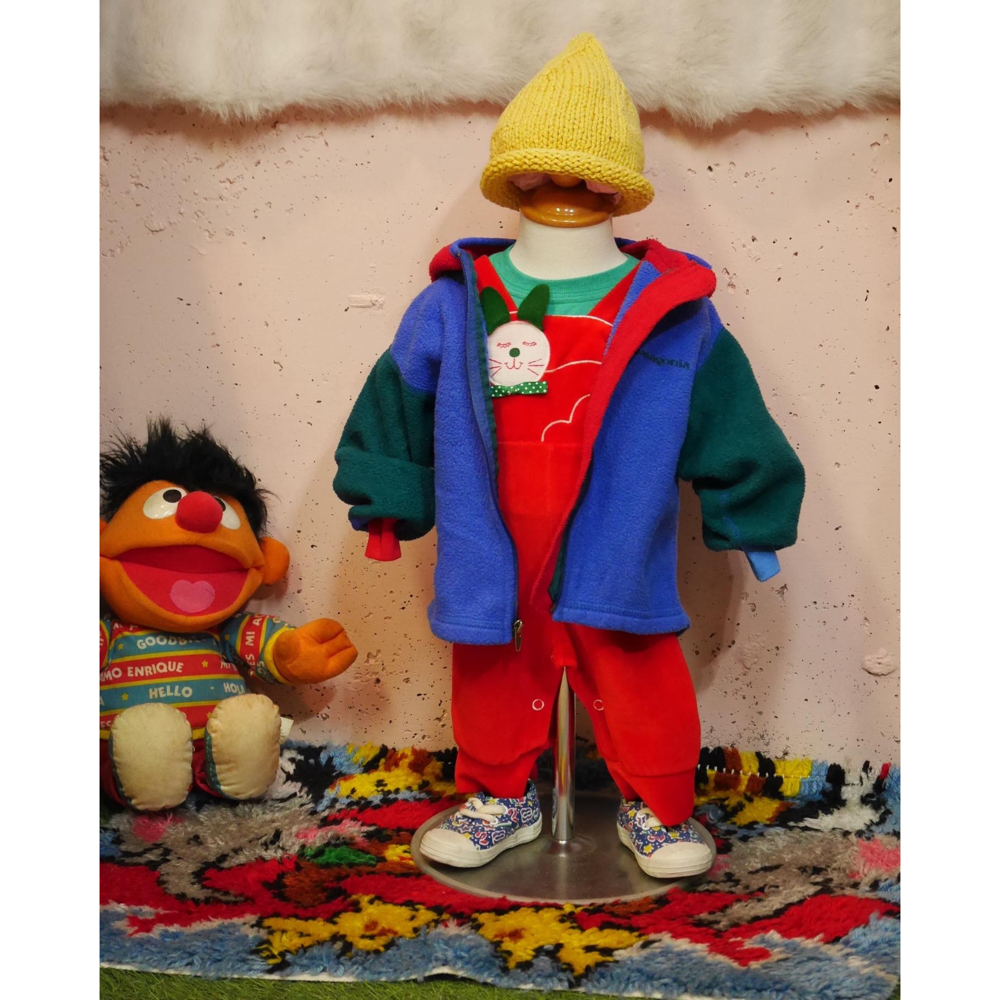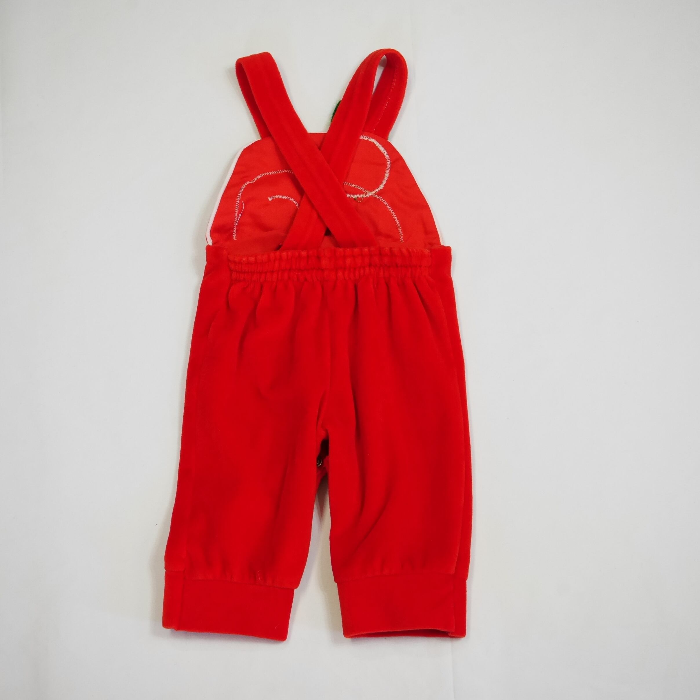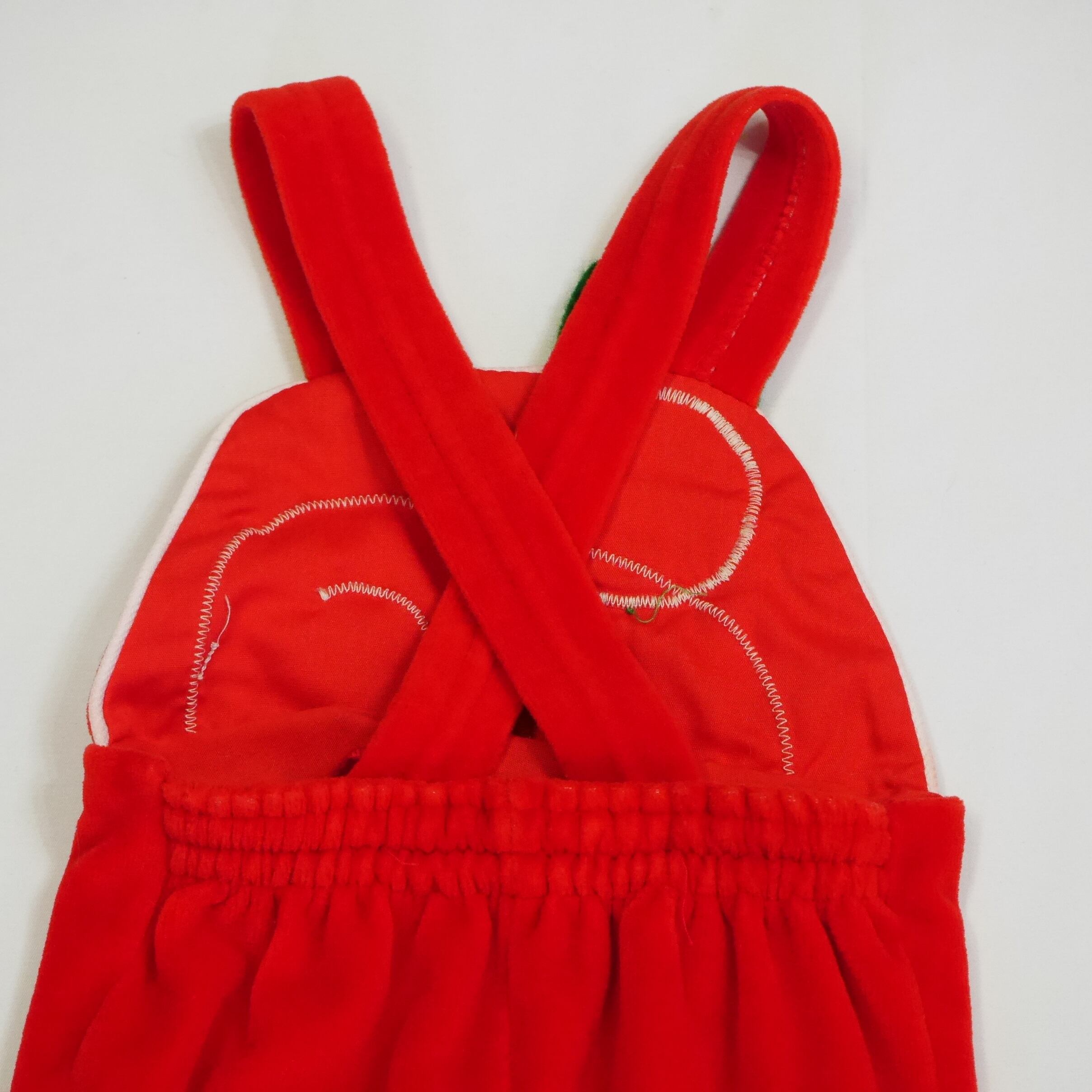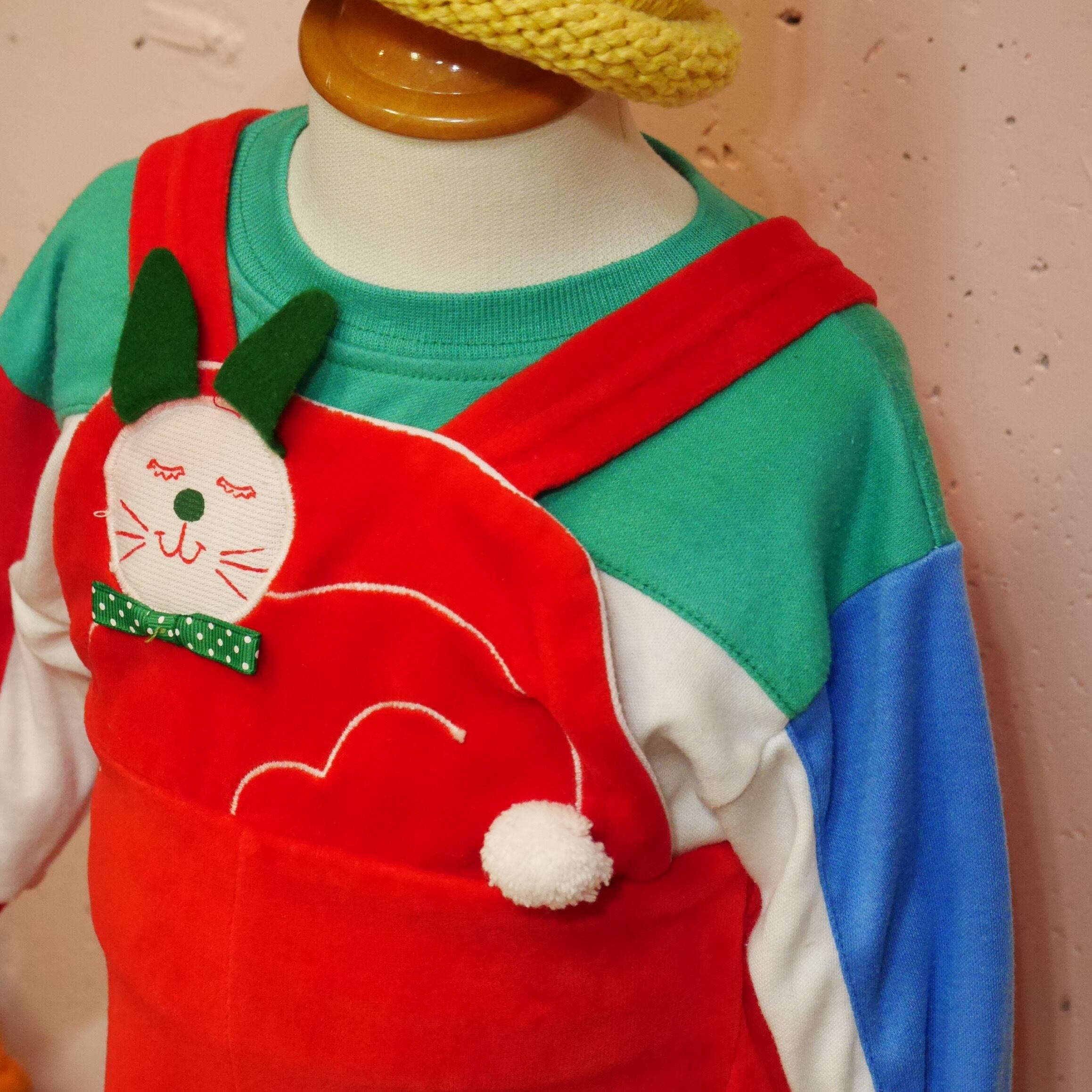 真っ赤なベロア素材がこの時期のムードにマッチしていてロマンチックな一枚。胸当てにはうさぎさんモチーフが施されており、うさぎさんの耳はフェルト、尻尾はポンポンと遊び心のあるデザインがアメリカらしくてGood。