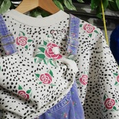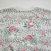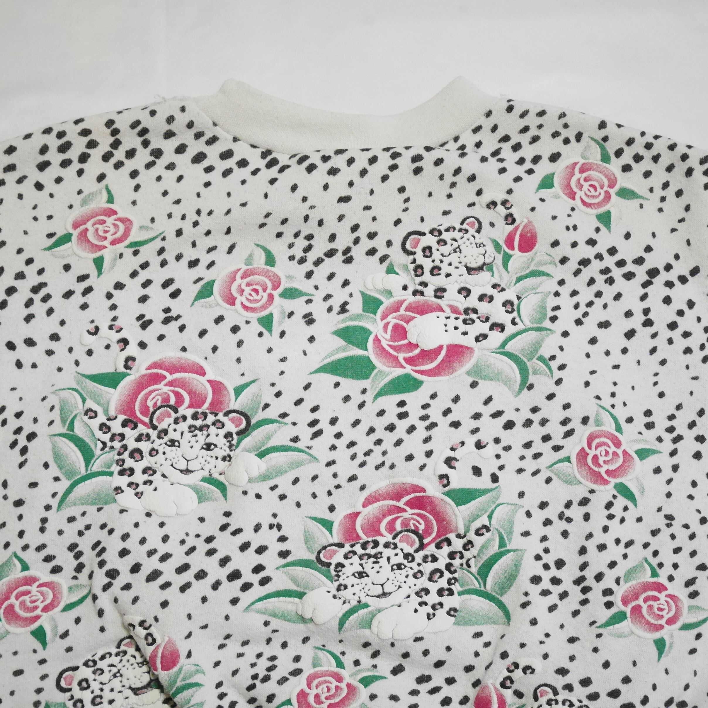ボディから袖から全面プリントの非常にインパクトのある一枚。豹柄のような黒い斑点とお花と雪豹がプリントされています。しかもお花や雪豹は発泡プリントで凹凸が有り。凹凸があることで立体感が生まれるので一枚で着ても見栄え良くなります。
