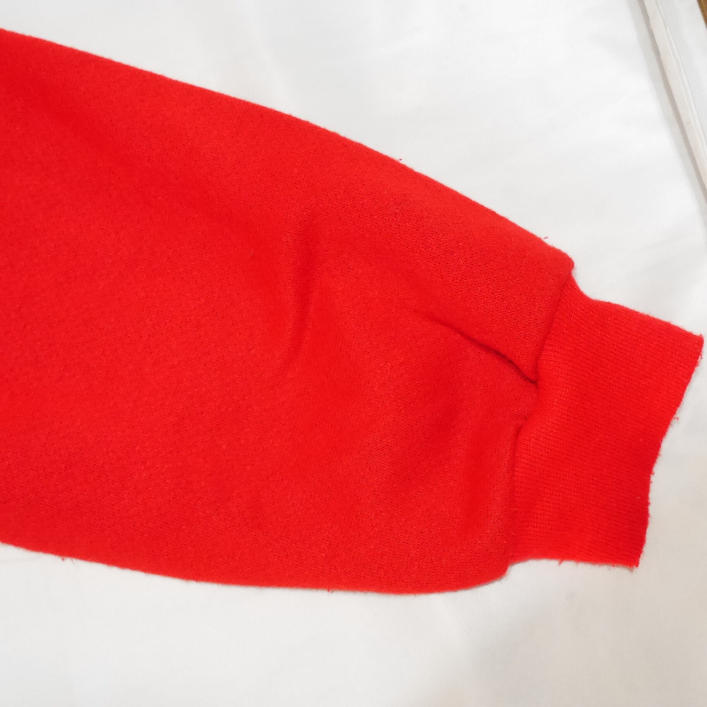 真っ赤なボディなんですがよく見るとフロントと袖とで色味が若干違うのが分かりますか?実際あまり気にならない程度の違いなんですが、少し違うことで1枚で着ても奥行きのあるコーデが生まれ、ワントーンボディよりもお洒落に決まります。サイドのスリットの抜け感もGood。