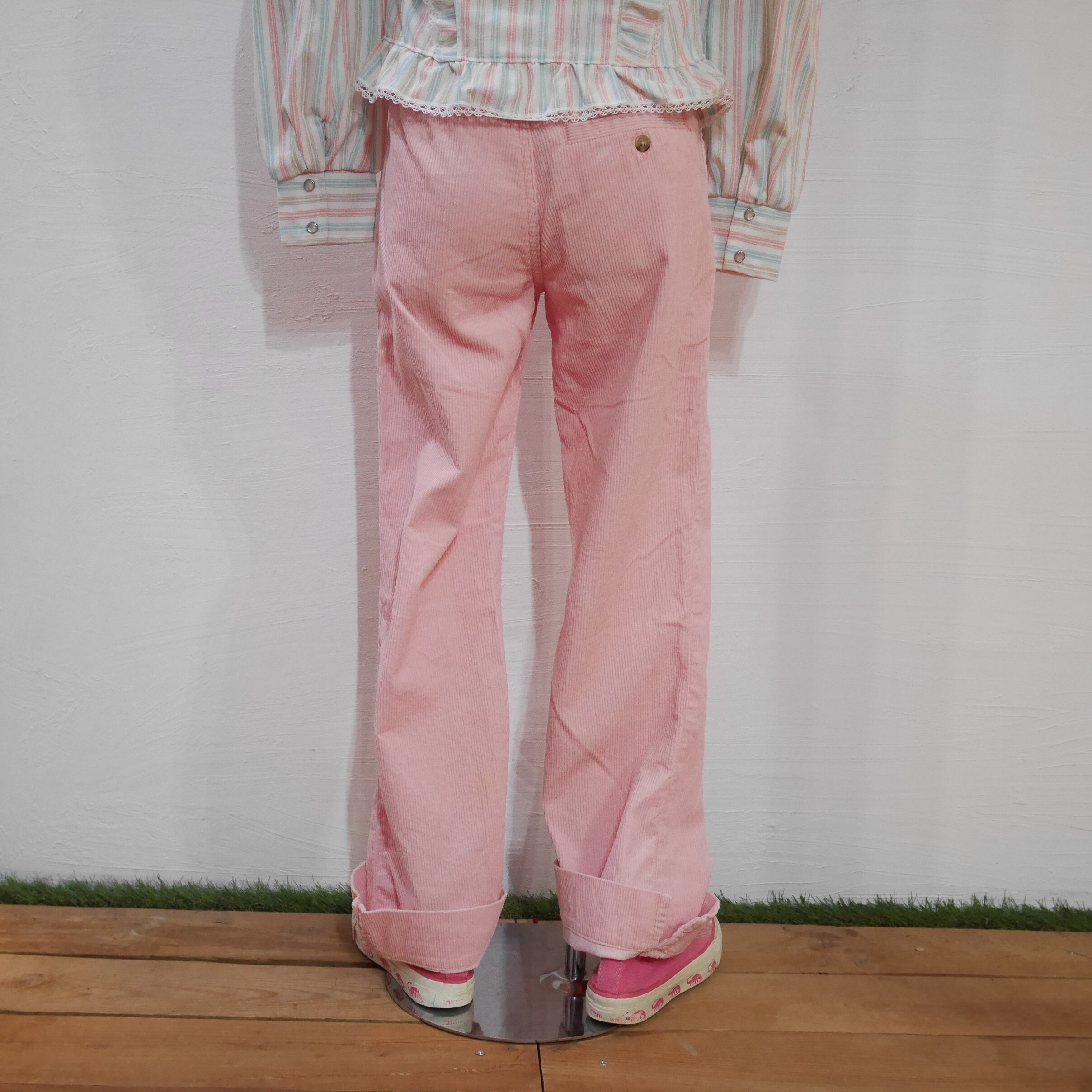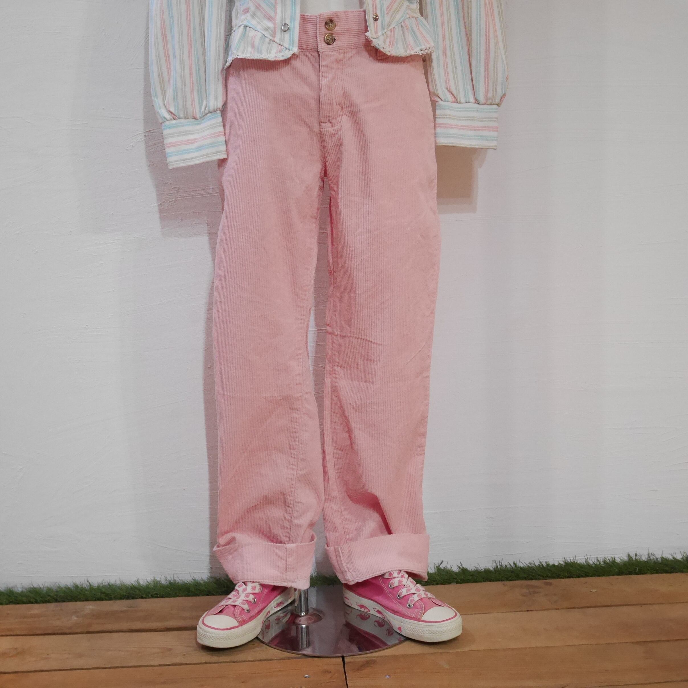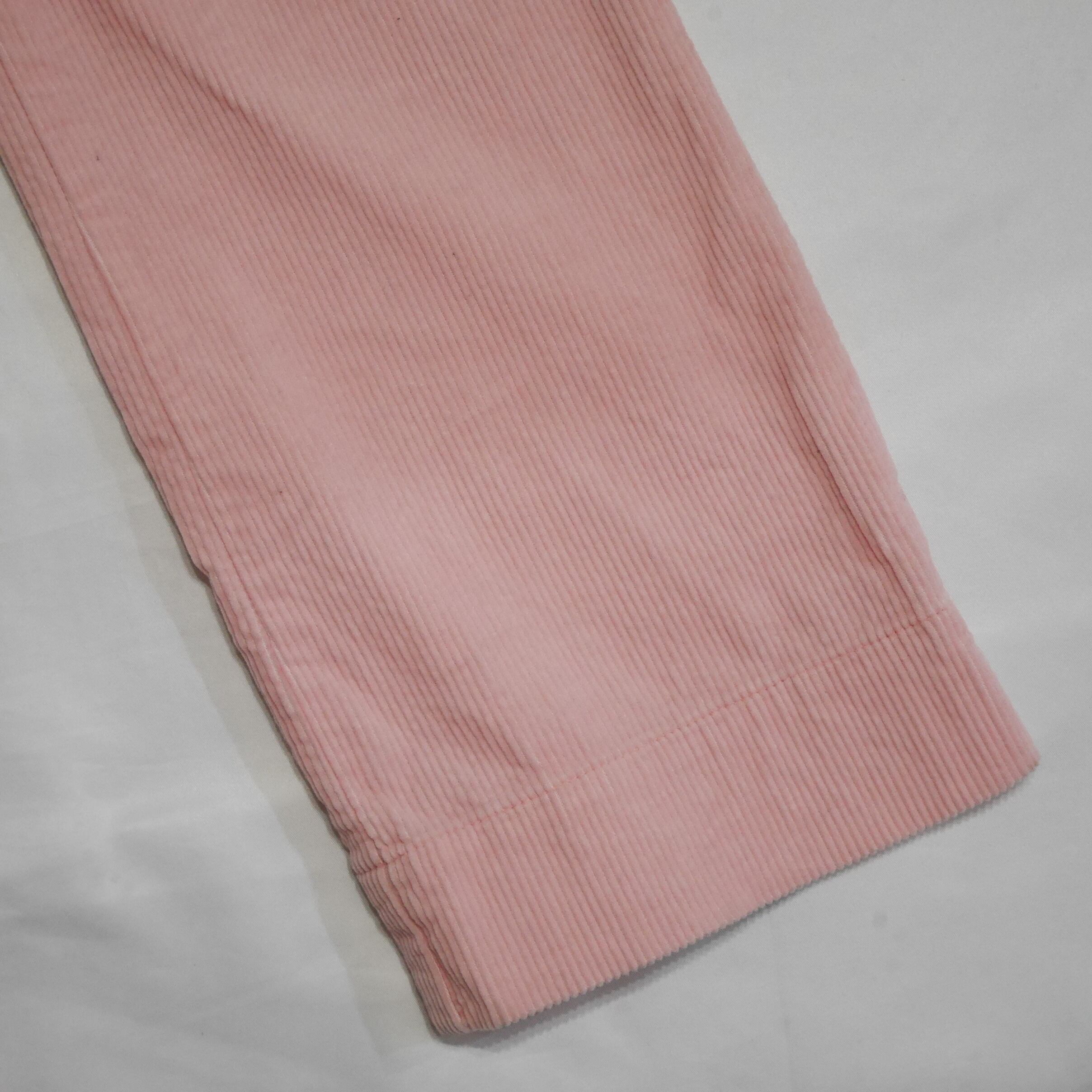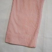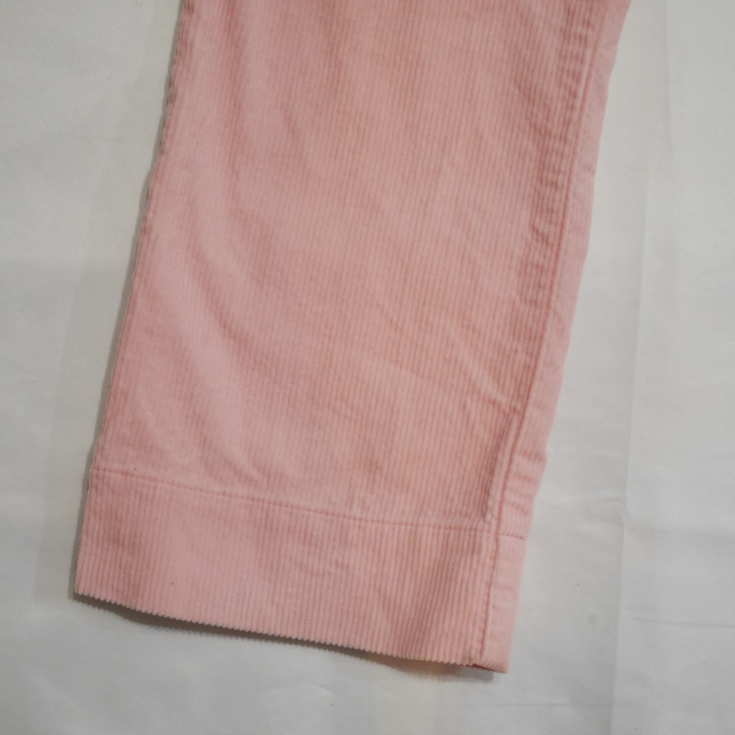 1990年代後半から2000年初頭頃の一枚かと思います。春にマッチする桜のような優しいピンクのコーデュロイパンツ。若干腰回りはゆったりとし、裾が少し細くなったテーパードシルエット。太すぎず細すぎず、けどテーパードでスタイルアップが見込まれる一枚です。裾に5cm程のスリットが有る、一捻りしたデザインもGood。
