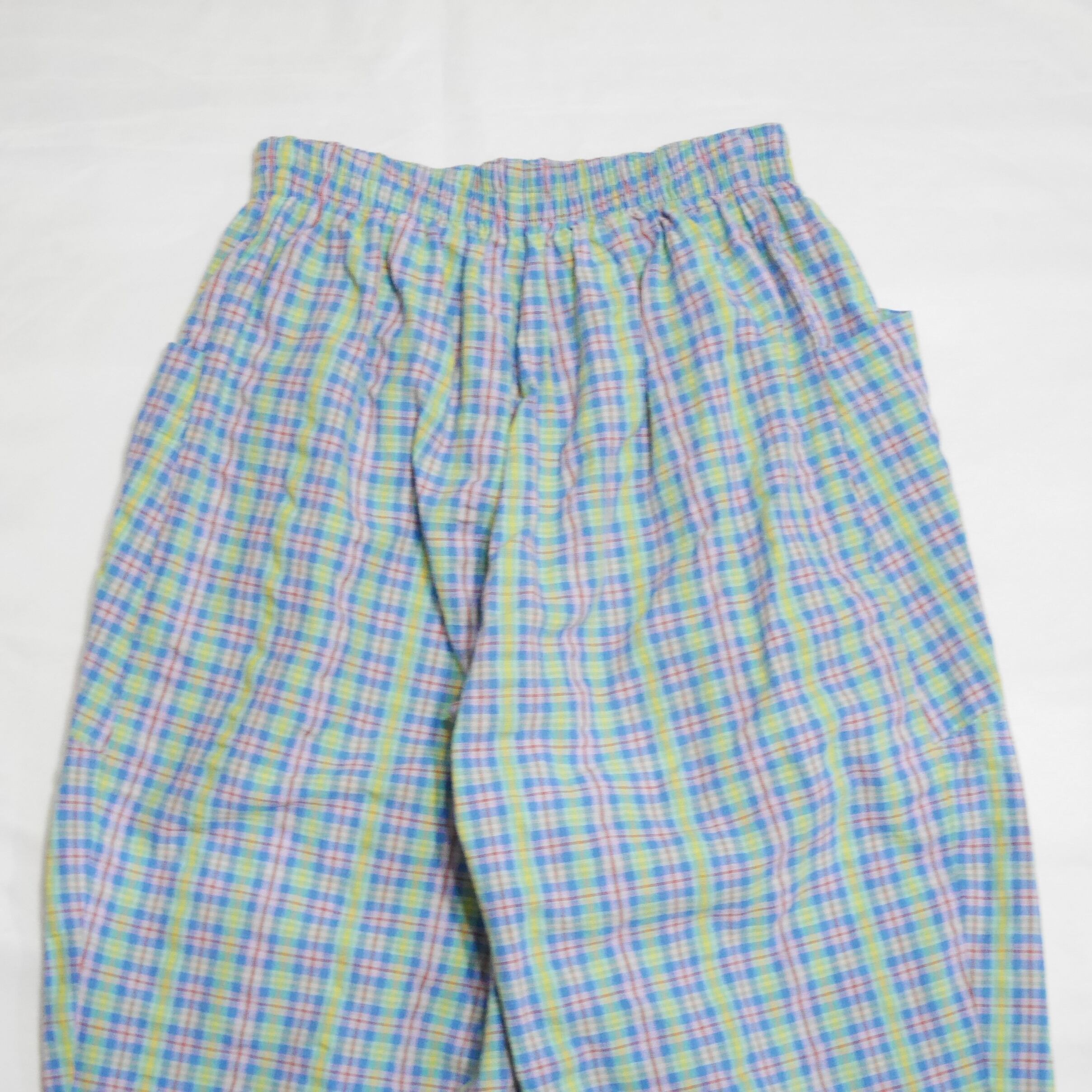 水色、ピンク、黄色、黄緑などの色味が最高に可愛いチェック柄パンツです。この色合いだけでも十分可愛いんですが、それに加えて更に魅力的なのがシルエット。
