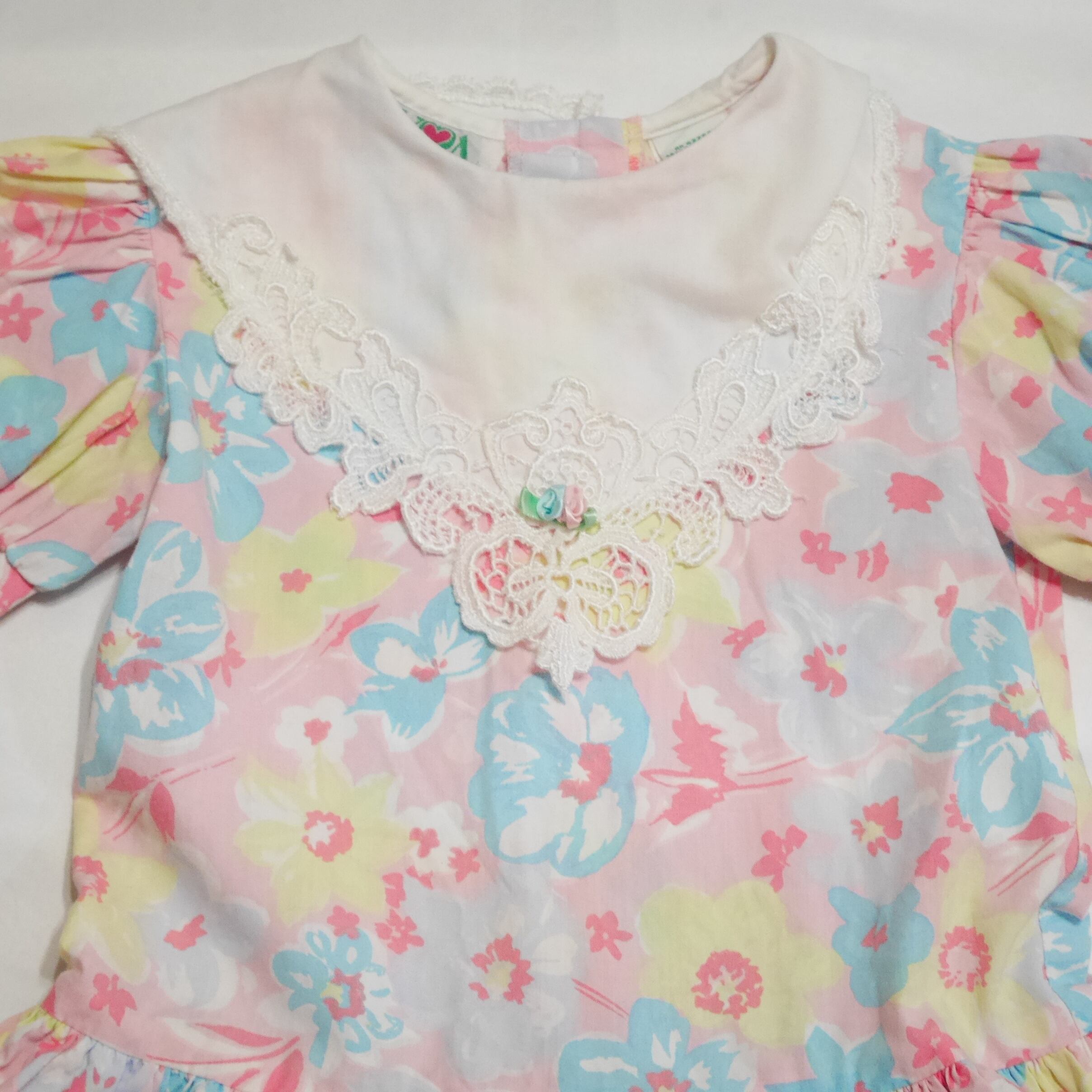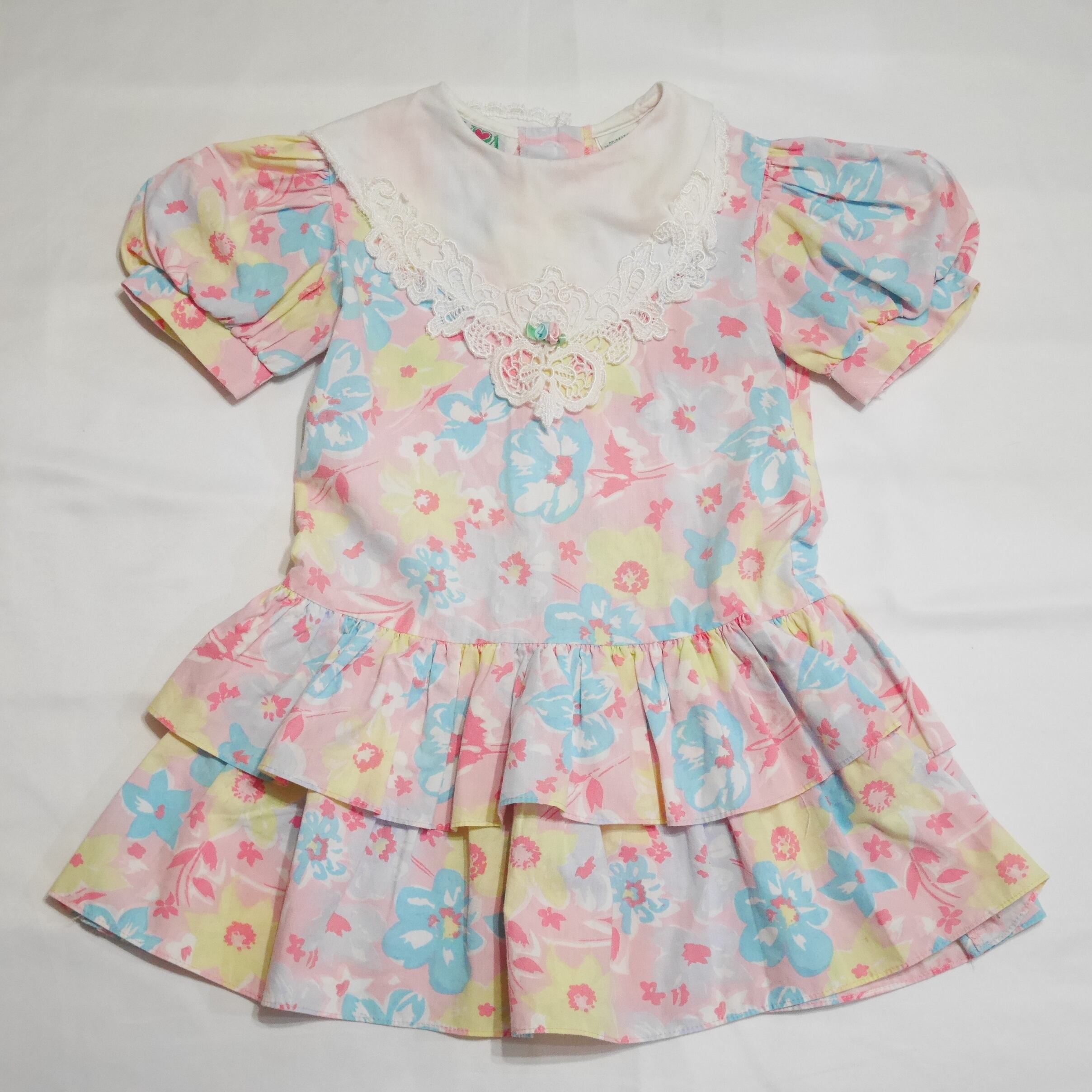 大きくエレガントな襟、パフスリーブ、裾のティアードデザイン、このロマンティックさから非常に80sらしさを感じます。大判で大人っぽいかと思いきや水色、ピンク、黄色の淡くて優しいトーンで可愛らしいお花柄なところもGood。