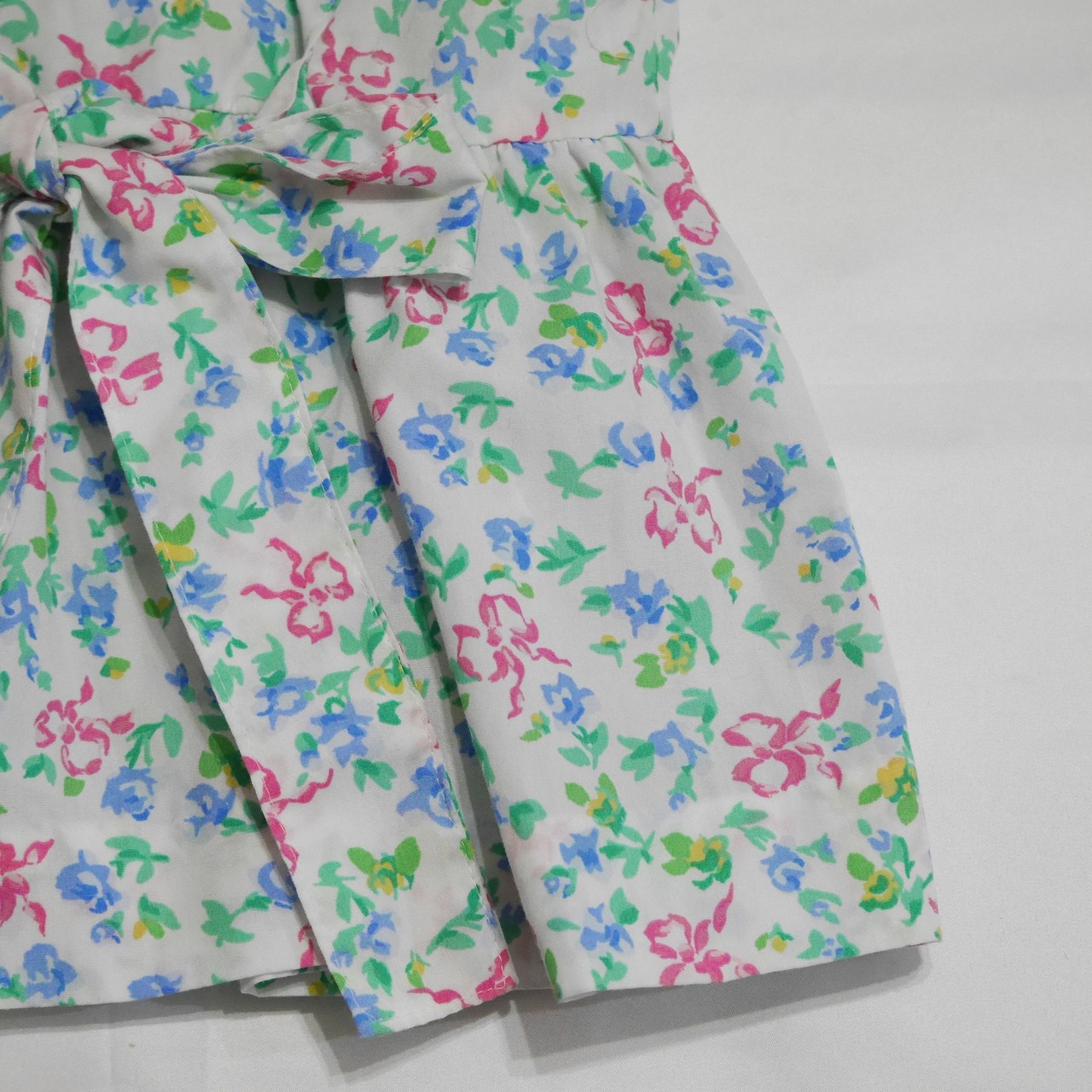 水彩画のようなエレガントなお花柄ですがピンクのリボンもあることでガーリーさがプラスされ、可憐さを感じられる一枚です。80sの雰囲気も少し感じられる大きな襟にはプリントに似たお花の刺繍が有り。