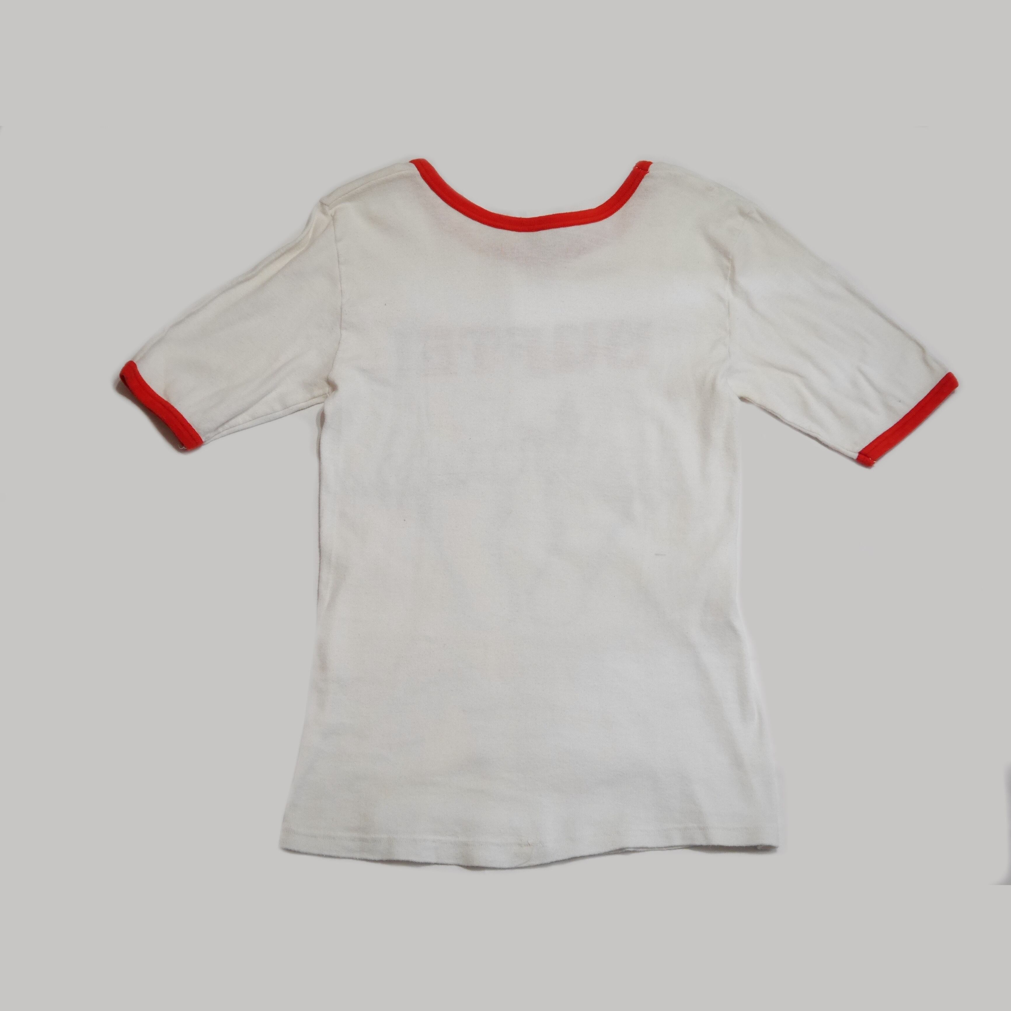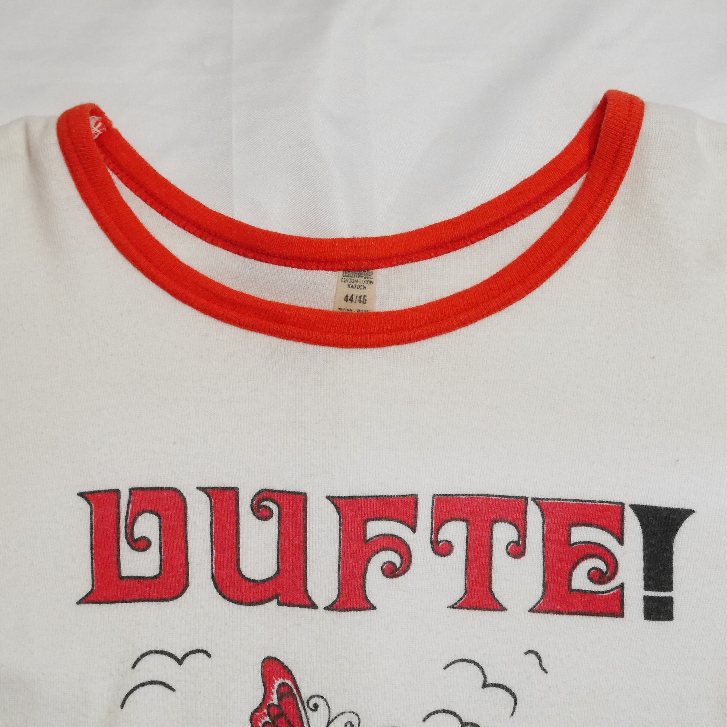 生地は少し古めのTシャツによくあるカットソータイプ。レディースのSくらいのサイズ感なので大人でも着れる方いらっしゃると思います。フレアパンツやカットオフのデニムショーツと合わせると70sらしくて可愛いですよ。