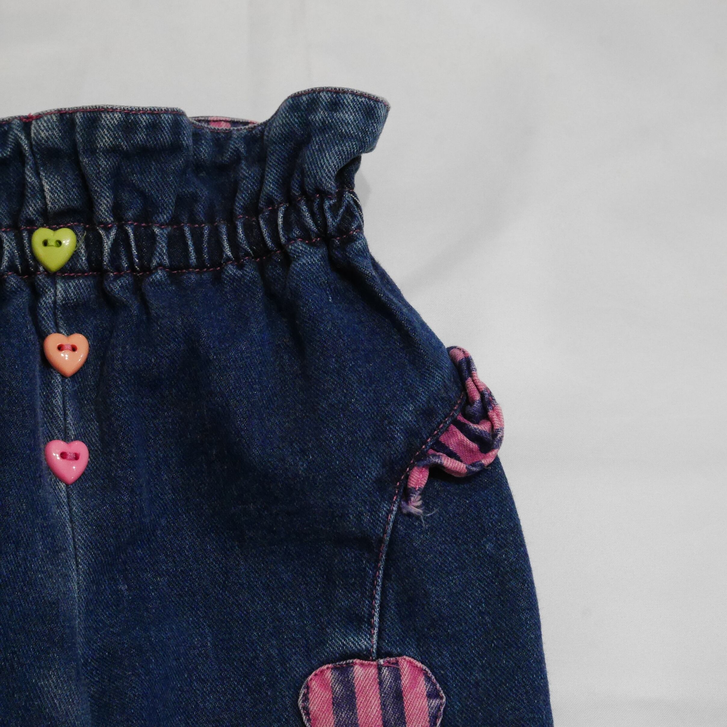 全体的にボリューミーなーシルエットにハイウエスト、ハートのビーズやハート型のパッチなどY2Kの雰囲気たっぷりなデザインデニムパンツ。