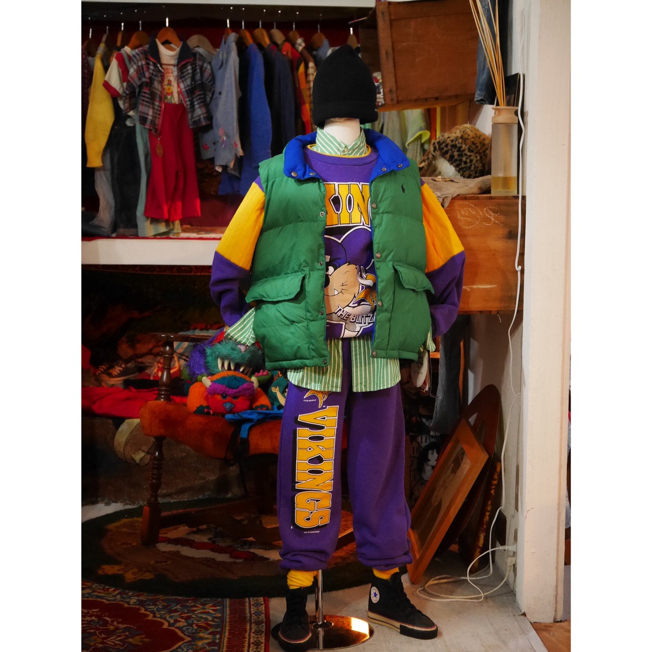 ©︎1996年のスウェットセットアップ。NFLチーム〈Minnesota Vikings〉と〈Looney Tunes〉のキャラクター:タズ(タズマニアンデビル)がコラボした一枚。